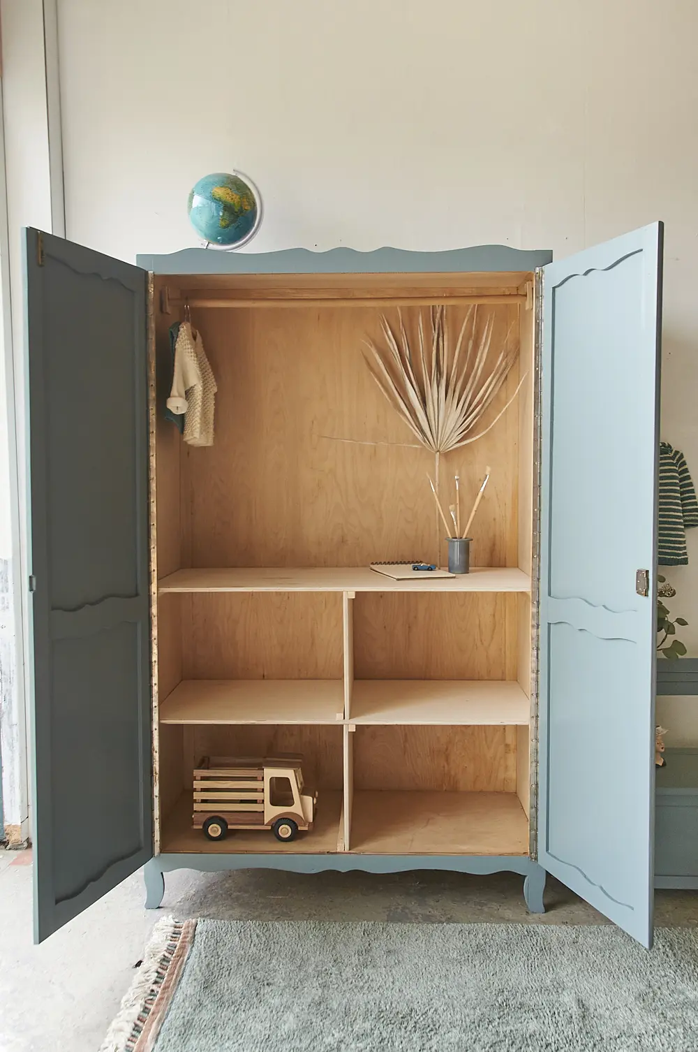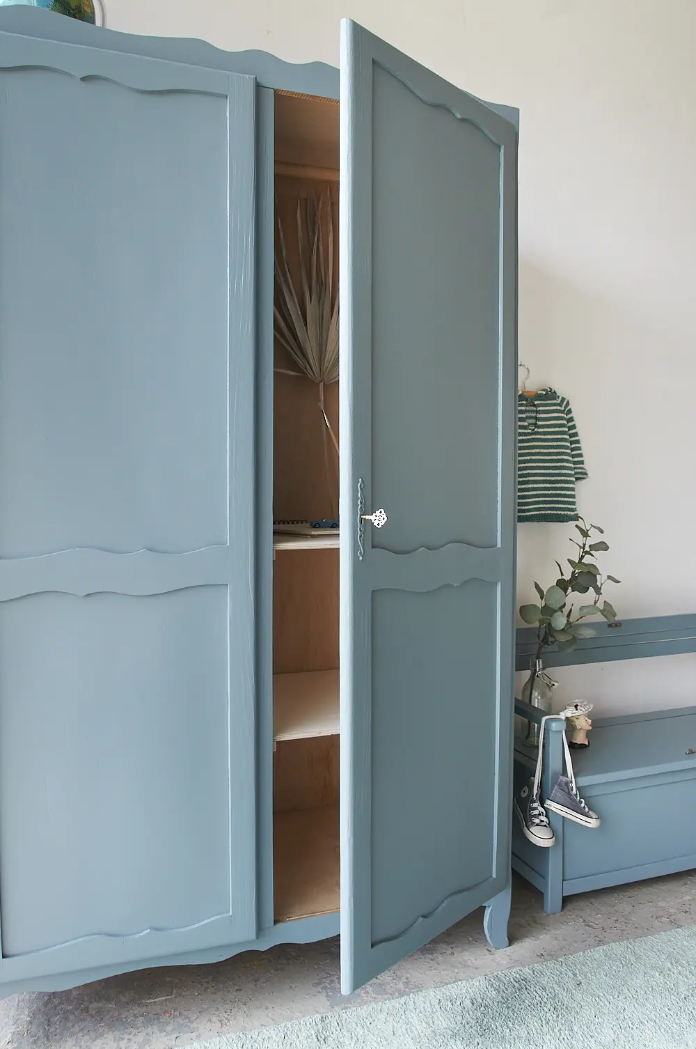We worden altijd erg blij van dit model. We hebben dit soort kasten vaker in huis, allemaal net een beetje anders. Toen we deze kast binnen krijgen had hij alleen een roede, die niet helemaal lekker paste. De kast had dus nog wat liefde van ons nodig, en dat hebben we hem gegeven! Natuurlijk door hem goed schoon te maken en hem te behandelen tegen houtworm. Maar ook door hem deze fijne indeling te geven, het ziet er meteen heel gezellig uit. De roede hebben we passend gemaakt en hem iets lager gemonteerd, zodat je makkelijk de kleerhanger er overheen kan hangen. De linker deur sluit met een schuifje en de rechterdeur sluit met een sleutel. Een ideale kast voor op de kinderkamer!Demontabel: nee