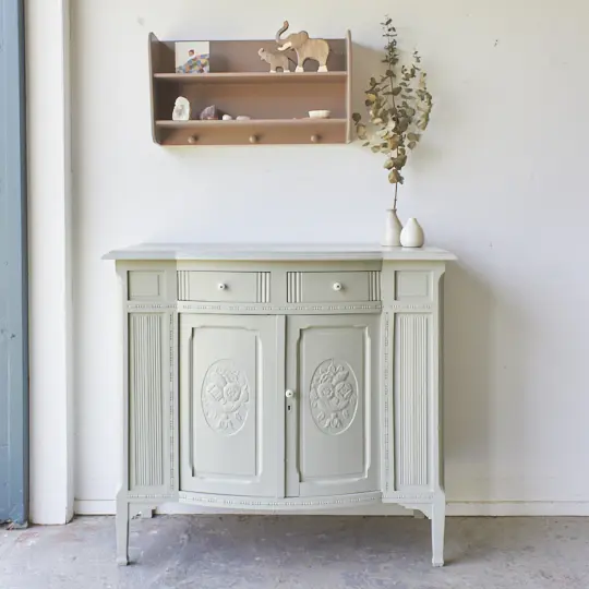 Deze Engelse commode is wel heel bijzonder. Heb je het mooie, diverse houtsnijwerk al gezien? In de vorm van bolletjes, lijnen en bloemen, zo mooi! Het geeft deze commode een speels uiterlijk, samen met de bolle deurtjes en lades. Toen deze commode terugkwam van de zandstralers om alle oude lagen eraf te laten halen, hebben we hem helemaal onder handen genomen en opgeknapt. De commode is goed schoongemaakt en behandeld tegen houtworm. We hebben het blad iets verlengd, waardoor er nu precies een verschoonkussen op past. De lades zijn aangepast en gedeeltelijk vervangen, dus deze gaan weer soepel open en dicht. Beide deurtjes gaan ook weer gemakkelijk open en dicht en sluiten door middel van magneetjes. De originele plank hebben we gladgeschuurd en terug kunnen plaatsen. Nu is deze commode weer helemaal netjes en na twee lagen Voorjaar is hij weer helemaal klaar voor gebruik. Onze kleur Voorjaar is een fijne, frisse, zachte kleur die niet snel zal vervelen. Door zijn toegankelijke uitstraling kan hij in elke kamer wel staan. Mocht de commode niet meer gebruikt worden, dan kan hij overal in huis wel staan. In de woonkamer als spelletjeskast of in de hal voor schoenen en tassen bijvoorbeeld. De porseleinen knopjes maken hem helemaal af! Het mooie wandplankje in onze kleur hazel is ook te koop, klik HIER voor meer informatie. Demontabel: Nee