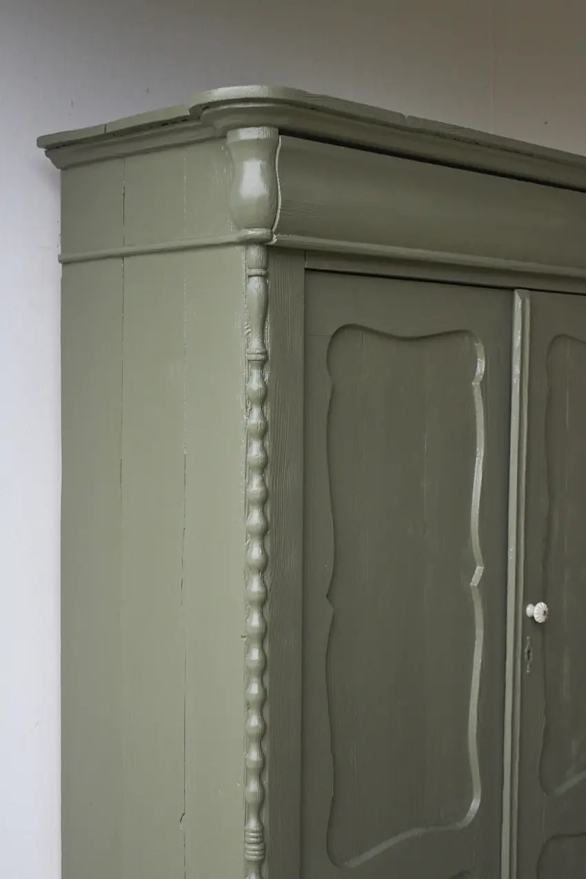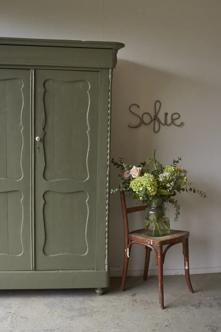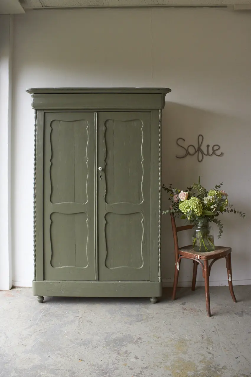 Zoveel reparaties hebben we mogen uitvoeren, de deuren hebben nieuwe speunen gekregen en we hebben het vintage meubel nieuwe pootjes gegeven. De planken in deze kast zijn origineel en zijn lekker stevig. De planken dragers hebben we vervangen. De planken zijn 33cm diep, perfect voor dozen spelletjes. We hebben de planken goed schoongemaakt en geschuurd, waardoor we ze hebben kunnen hergebruiken. De lades gaan ook weer goed open en dicht en boven in zit nog een grote geheime lade. We kozen uiteindelijk voor deze fijne kleur Rozemarijn. Een vintage groene kleur die in elk interieur past. Zo blij met het eind resultaat. Helemaal klaar voor een nieuwe plek in de woonkamer als spelletjeskast of als kinderkledingkast in de kinderkamer.