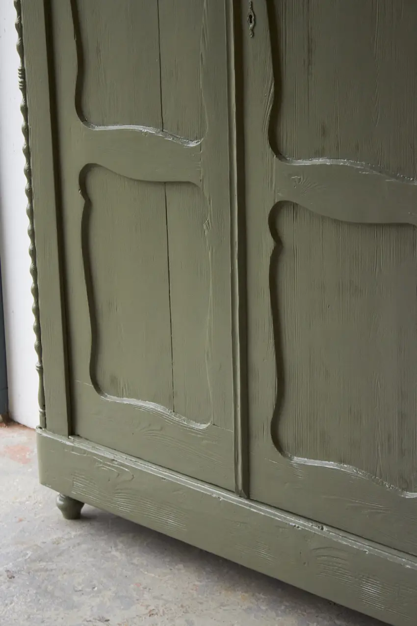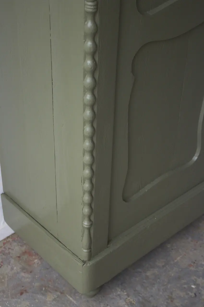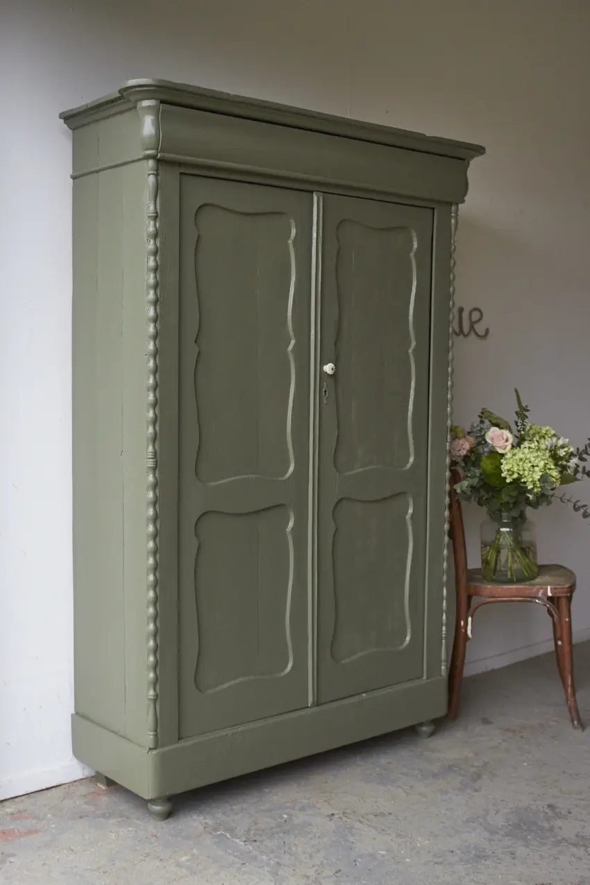Zoveel reparaties hebben we mogen uitvoeren, de deuren hebben nieuwe speunen gekregen en we hebben het vintage meubel nieuwe pootjes gegeven. De planken in deze kast zijn origineel en zijn lekker stevig. De planken dragers hebben we vervangen. De planken zijn 33cm diep, perfect voor dozen spelletjes. We hebben de planken goed schoongemaakt en geschuurd, waardoor we ze hebben kunnen hergebruiken. De lades gaan ook weer goed open en dicht en boven in zit nog een grote geheime lade. We kozen uiteindelijk voor deze fijne kleur Rozemarijn. Een vintage groene kleur die in elk interieur past. Zo blij met het eind resultaat. Helemaal klaar voor een nieuwe plek in de woonkamer als spelletjeskast of als kinderkledingkast in de kinderkamer.