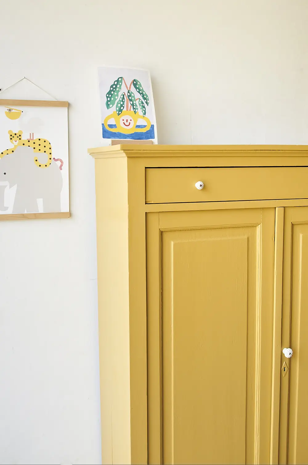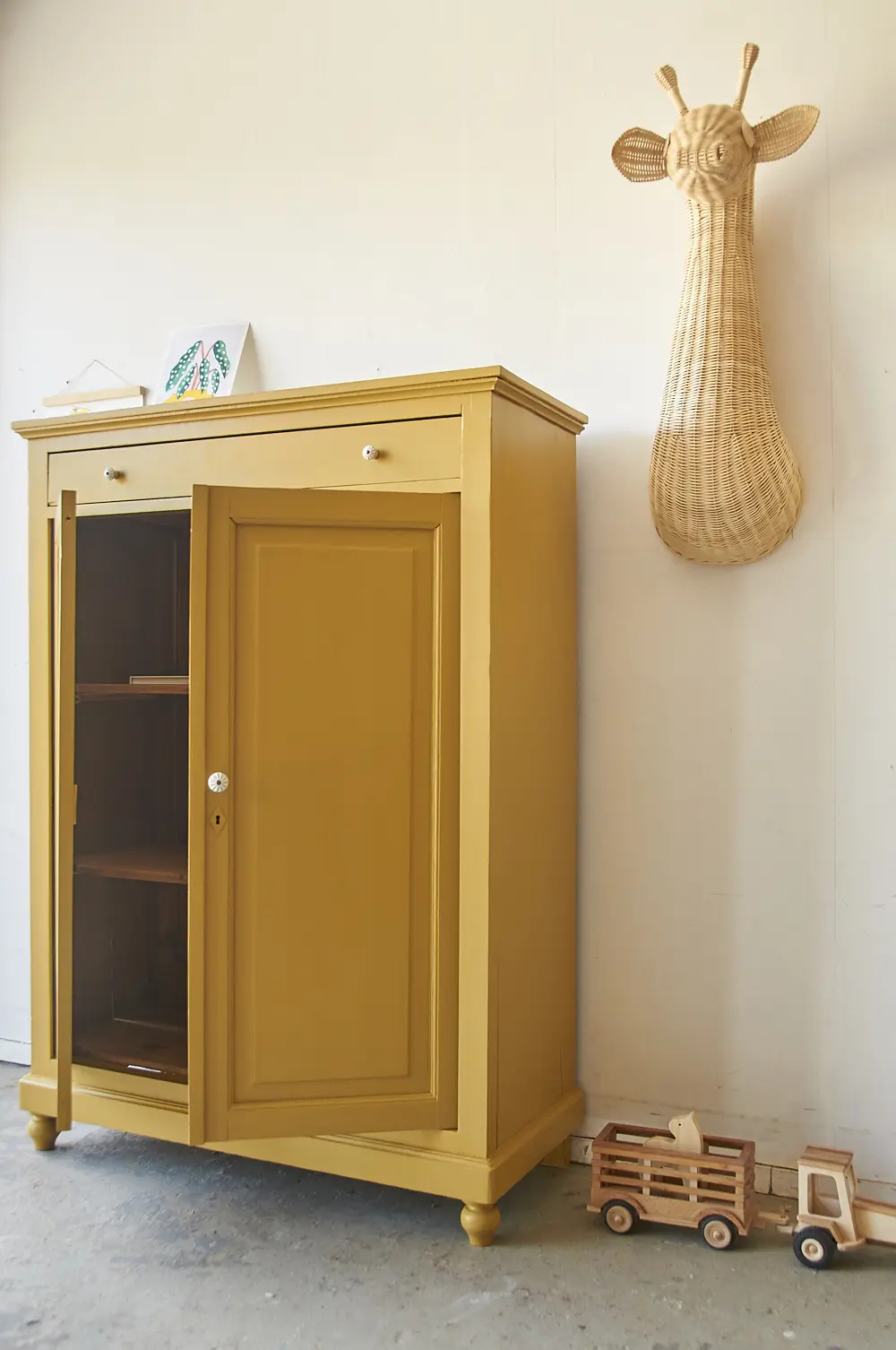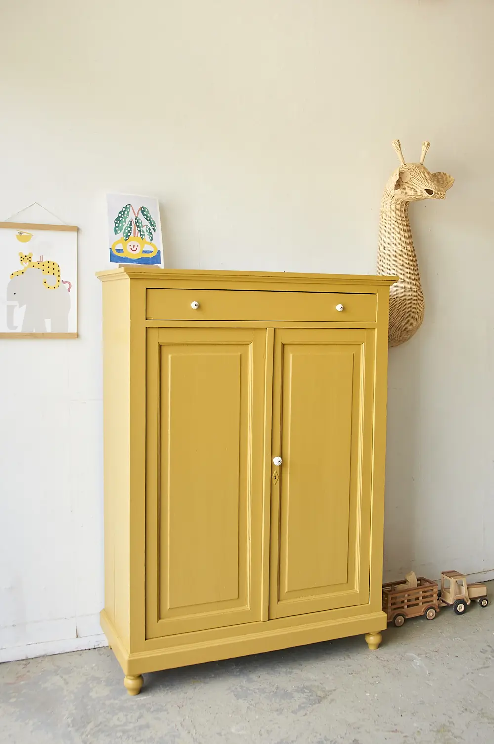 Dit kastje kan overal staan, in de kinderkamer als kledingkast of in de woonkamer als speelgoedkast! Een heel fijn formaatje in een strakke stijl, een kast die overal past. Deze kast hebben we nadat hij terug kwam van de stralers, goed schoongemaakt en behandeld tegen houtworm. De kast en de indeling zagen er nog goed uit, dus na de flinke poetsbeurt hebben we de originele planken kunnen behouden. Onze kleur Saffraan geeft hem een hele fijne zachte uitstraling.