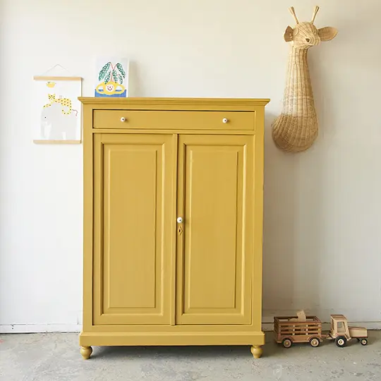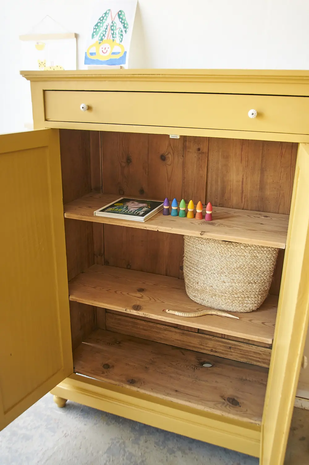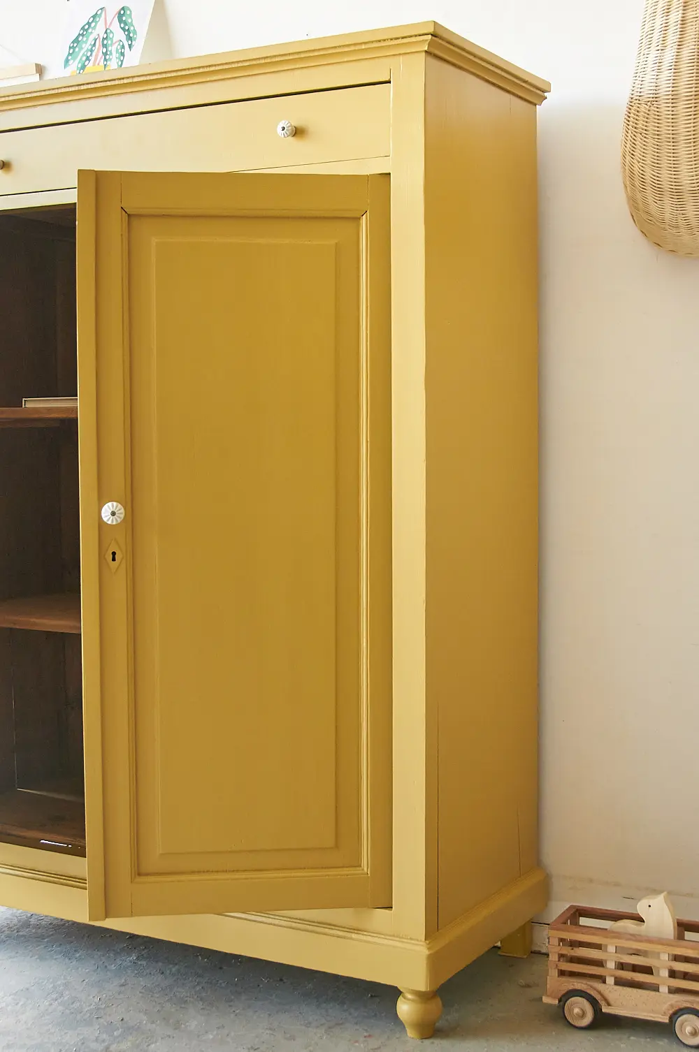 Dit kastje kan overal staan, in de kinderkamer als kledingkast of in de woonkamer als speelgoedkast! Een heel fijn formaatje in een strakke stijl, een kast die overal past. Deze kast hebben we nadat hij terug kwam van de stralers, goed schoongemaakt en behandeld tegen houtworm. De kast en de indeling zagen er nog goed uit, dus na de flinke poetsbeurt hebben we de originele planken kunnen behouden. Onze kleur Saffraan geeft hem een hele fijne zachte uitstraling.