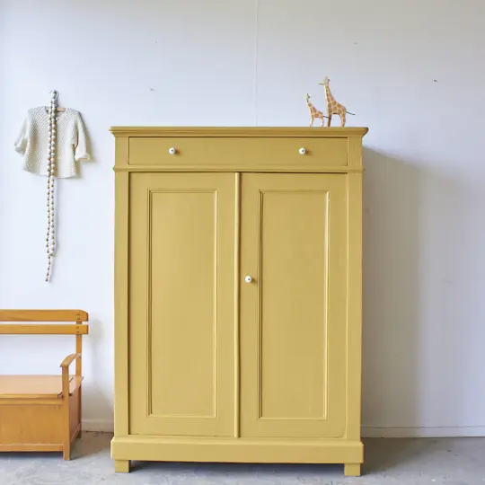 Wat een fijne kast is dit in onze kleur Saffraan. Deze kast zal perfect staan op de kinderkamer of in de woonkamer. Een heerlijke maatje en leuk om bovenop wat speelgoed te zetten en boekjes of een plantje. De kast had wat extra liefde van ons nodig, en dat hebben wij haar gegeven!
