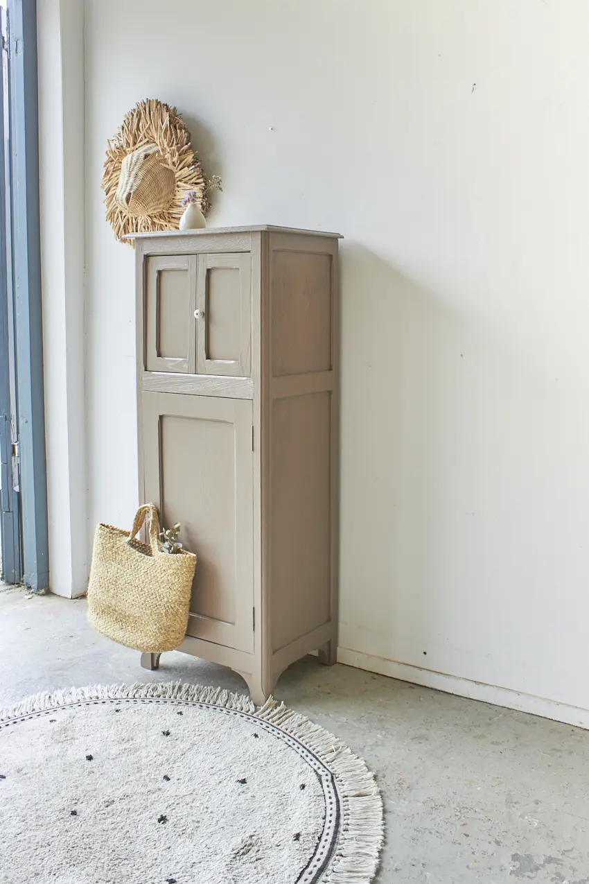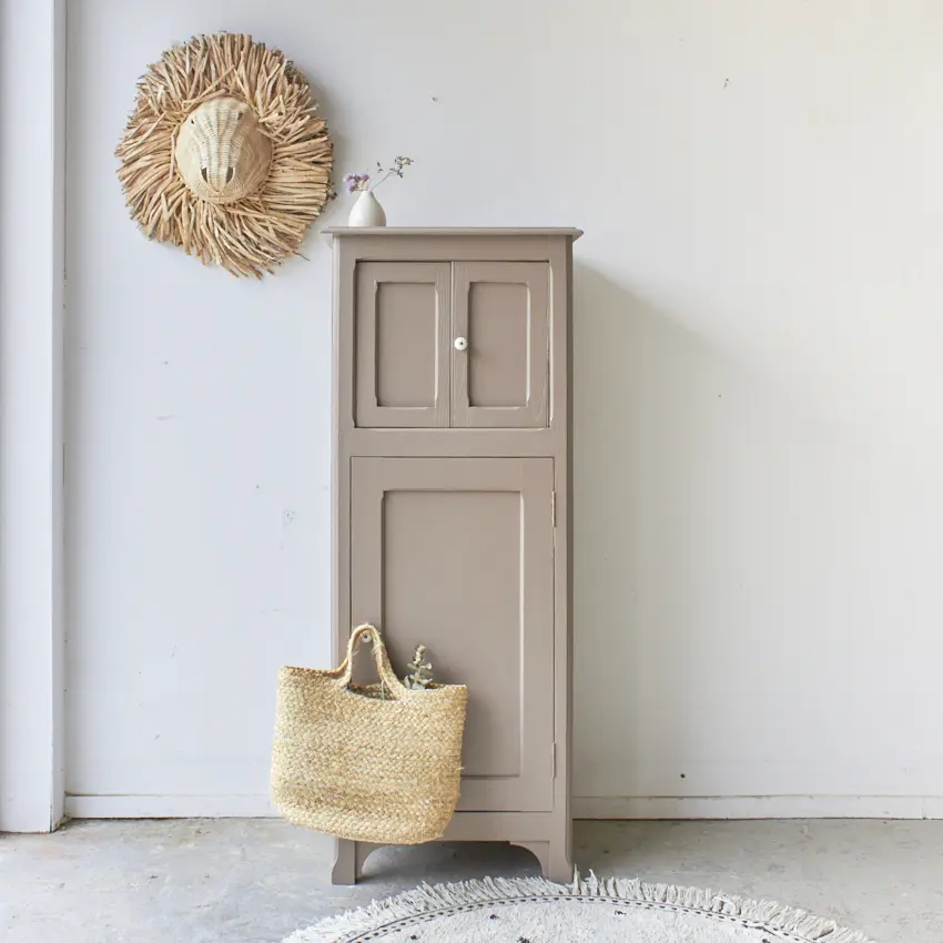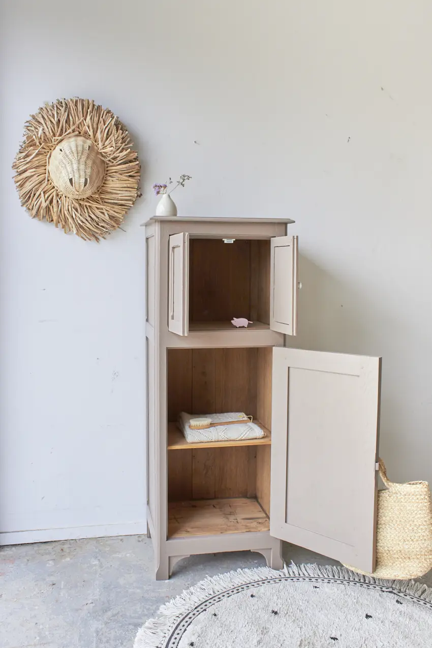 Wat een leukerd! Dit kastje heeft twee kleine deurtjes bovenin en ook onderin is er nog opbergruimte. Door het fijne formaat kan hij overal in huis wel staan. Als speelgoedkastje vol met spelletjes en boeken. Of bijvoorbeeld in de hal voor schoenen, sleutels en tassen. Toen dit kastje binnenkwam konden we niet wachten om er mee te beginnen. Wat een uniek, mooi kastje!