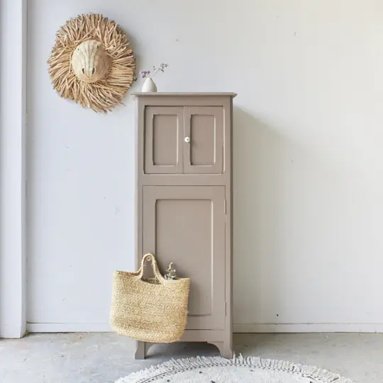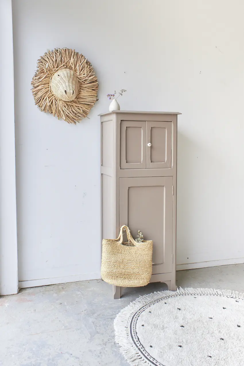 Na een goede grondverflaag hebben we hem 2 lagen van onze kleur Hazel gegeven. Een mooie mix van roze en beige. Deze kleur doet ons een beetje denken aan een Hazelnoot. De porseleinen knopjes op de deurtjes maken het kastje helemaal af. Wat een fijne combinatie!