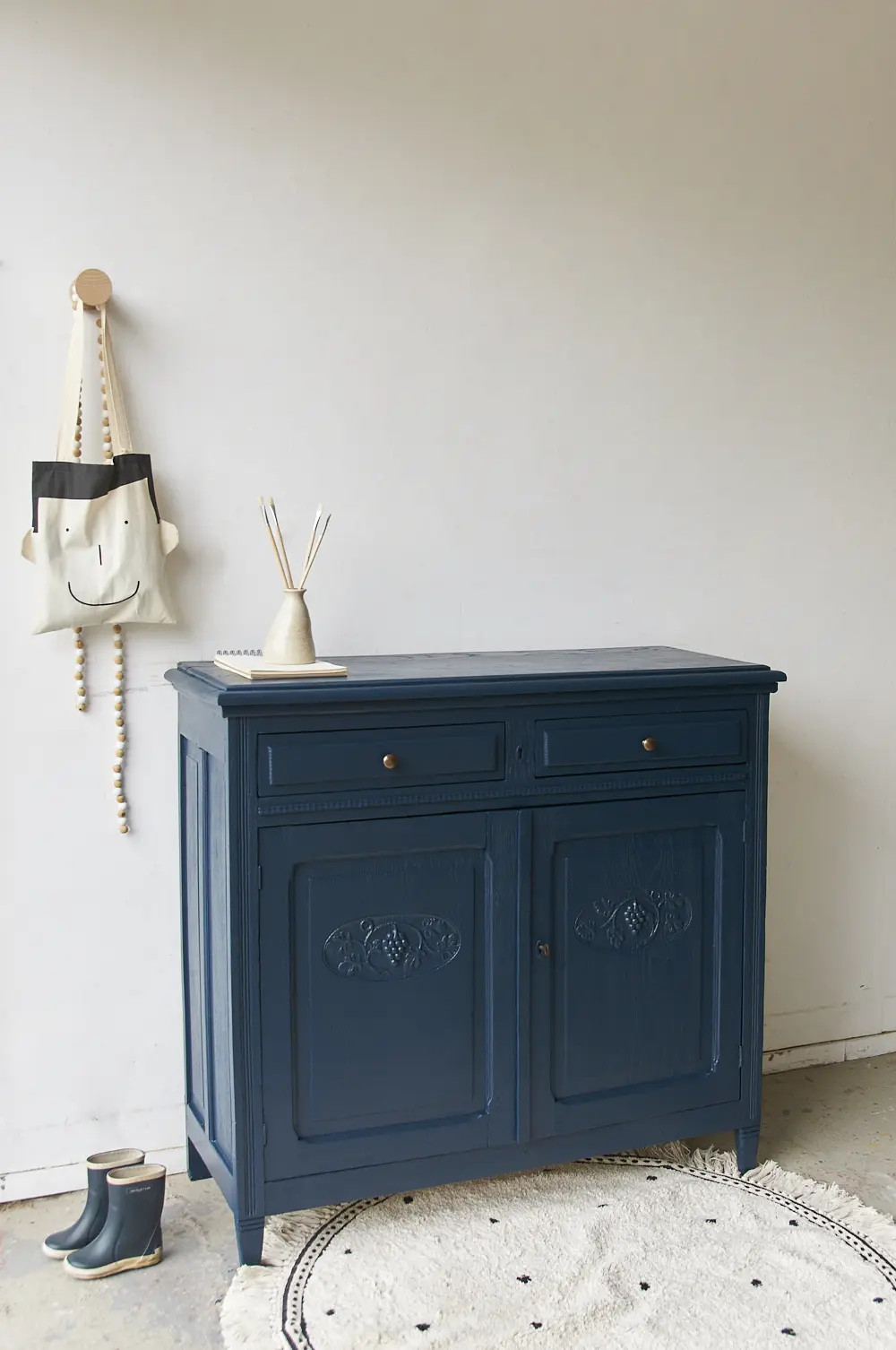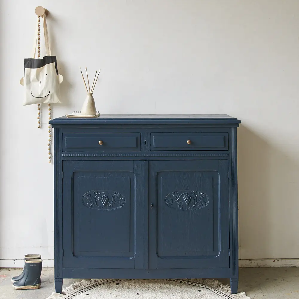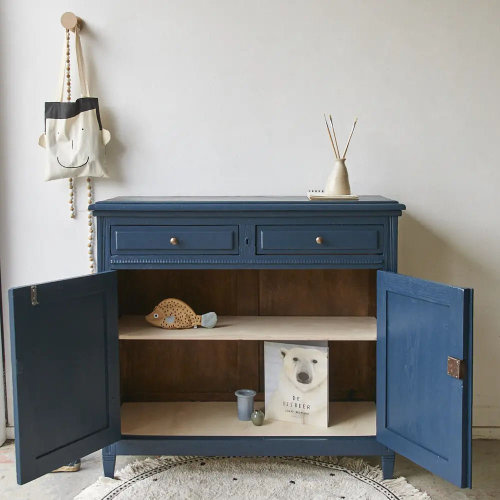 Wat een prachtig kastje is dit in onze kleur Nacht. Nacht is een hele warme, diepe, donkerblauwe kleur. Heel stijlvol! Deze kleur geeft heel veel sfeer en warmte en is mooi te combineren met bijvoorbeeld Bron of onze zachte, lichte kleur Maan. Een meubel in de kleur Nacht geeft soms bijna een koninklijk sfeertje, heel tof. Dit is een fijn kastje om al het speelgoed of stapels spelletjes in op te bergen. Wij hebben het kastje grondig schoongemaakt, behandeld tegen houtworm en gerepareerd waar nodig. De linker deur sluit door middel van een schuifje en de rechter deur sluit met een goed werkend slot. Helemaal klaar voor een nieuwe plek. Mocht je deze kast willen gebruiken als commode dan kunnen wij voor een meerprijs van 175,- euro een blad vergroter maken in de kleur nacht.