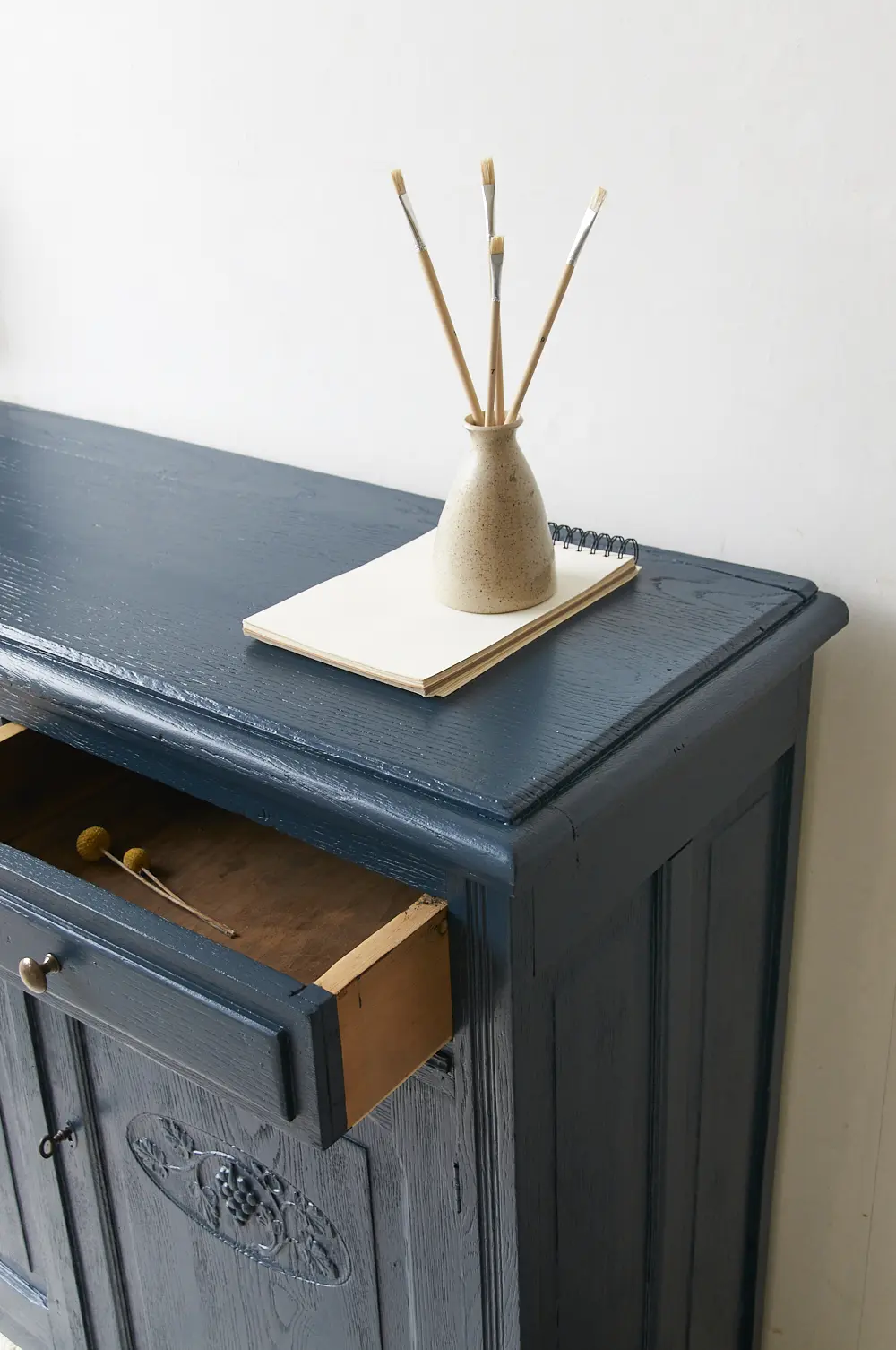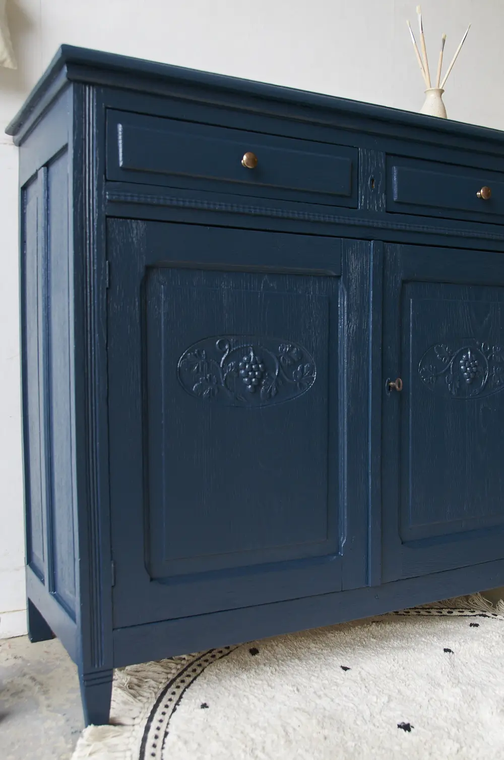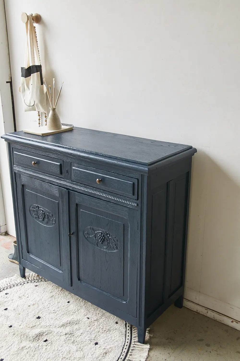 Wat een prachtig kastje is dit in onze kleur Nacht. Nacht is een hele warme, diepe, donkerblauwe kleur. Heel stijlvol! Deze kleur geeft heel veel sfeer en warmte en is mooi te combineren met bijvoorbeeld Bron of onze zachte, lichte kleur Maan. Een meubel in de kleur Nacht geeft soms bijna een koninklijk sfeertje, heel tof. Dit is een fijn kastje om al het speelgoed of stapels spelletjes in op te bergen. Wij hebben het kastje grondig schoongemaakt, behandeld tegen houtworm en gerepareerd waar nodig. De linker deur sluit door middel van een schuifje en de rechter deur sluit met een goed werkend slot. Helemaal klaar voor een nieuwe plek. Mocht je deze kast willen gebruiken als commode dan kunnen wij voor een meerprijs van 175,- euro een blad vergroter maken in de kleur nacht.