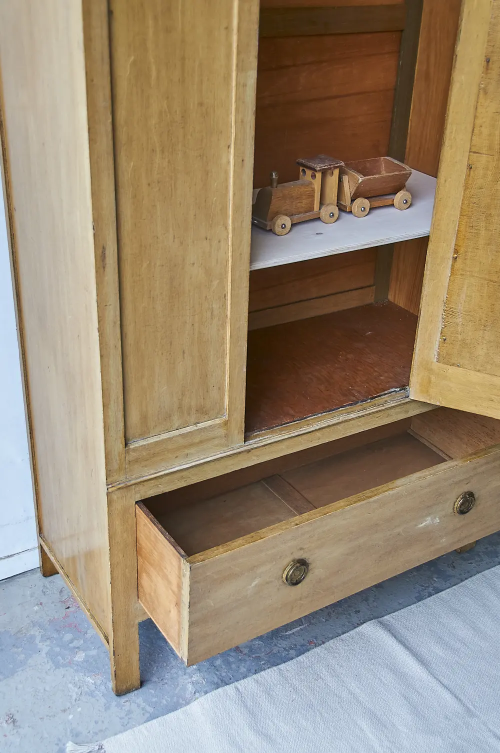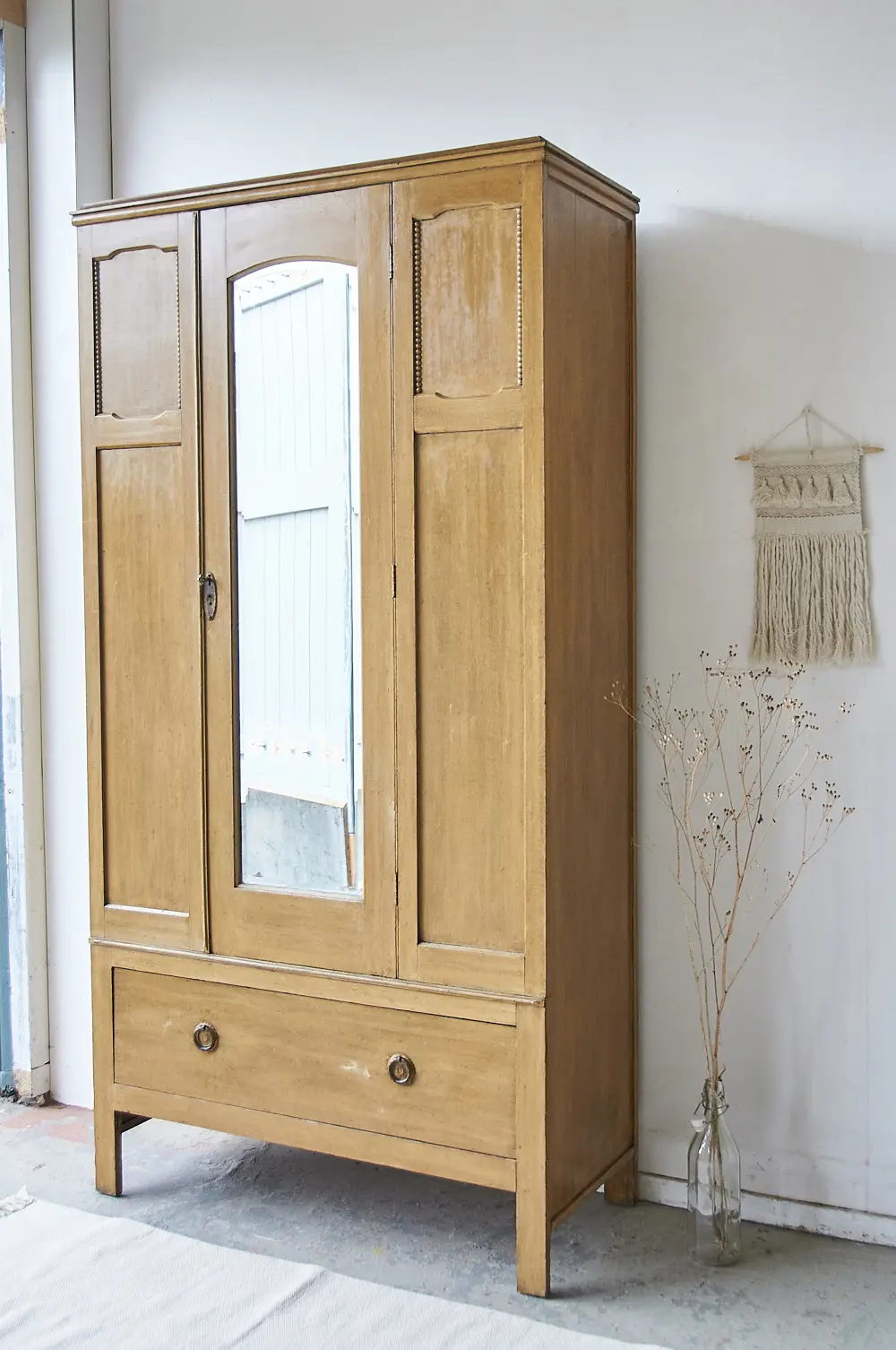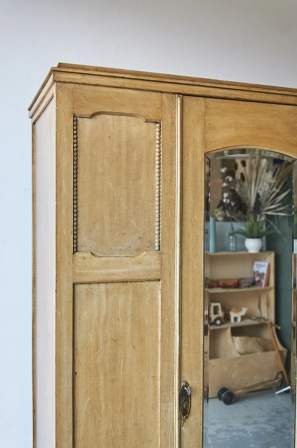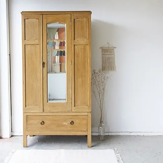Wow! Wat een leuke kast is dit. We zien hem al helemaal tot zijn recht komen op een kinderkamer. Zo leuk! Dit Engelse kastje was nog zo perfect dat we besloten hem zo te houden. De lade gaat soepel open en dicht en de spiegeldeur sluit nog perfect met de sleutel. We hebben binnen in een extra plank gemaakt, zodat er iets meer ruimte is voor legkleding, samen met de ruime lade leek ons dat voldoende. Bovenin zit de originele roede en daarachter zitten zelfs nog haakjes, ook deze zijn origineel! Kortom om, een heel unieke kast, die helemaal klaar is voor een nieuwe plek.