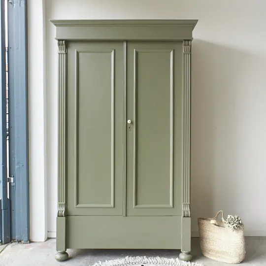 Wat een mooie kast is dit geworden! Deze kast had oorspronkelijk een erg donkere beitslaag, wat hem een erg ouderwets uiterlijk gaf. We hebben deze eraf laten zandstralen en ineens kwam daar een mooie klassieke kast tevoorschijn. We hebben hem goed schoongemaakt en behandeld met een anti-houtworm spray. Daarnaast hebben we de nodige reparaties gedaan. De deurtjes hangen weer recht en de sierlijst is gerepareerd. De linkerdeur sluit met twee schuifjes en de rechterdeur met magneetjes, zodat beide deuren gemakkelijk open en dicht gaan. De planken zijn origineel en konden we behouden. We hebben ze goed schoongemaakt en weer netjes gladgeschuurd. Wat fijn dat dit kan, ze staan prachtig bij de donkere binnenkant! We hebben gekozen voor de kleur Rozemarijn, wat ook mooi combineert met die donkere binnenkant. Het is een klassieke groentint met een vleugje grijs. Met de porseleinen knop is hij helemaal klaar voor een nieuwe plek in huis. Wat een mooi resultaat!