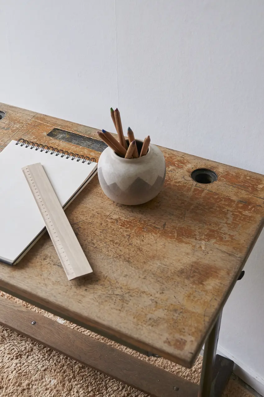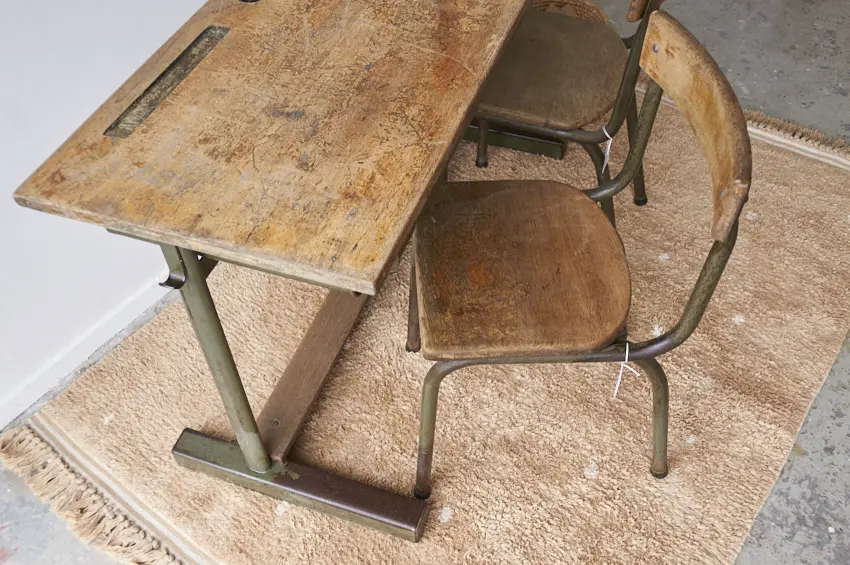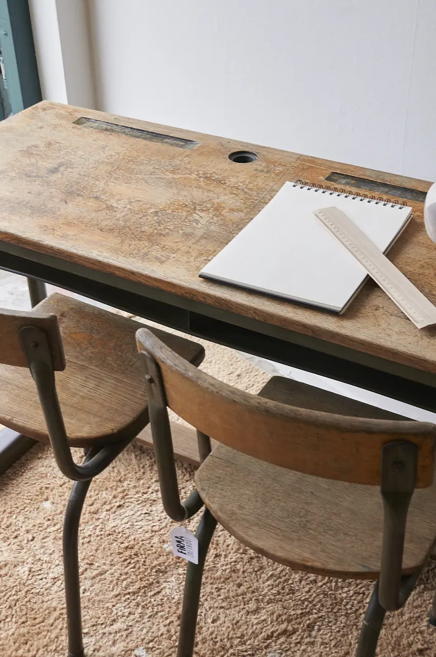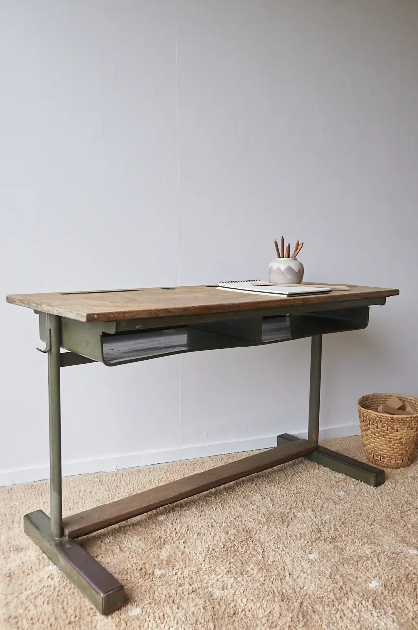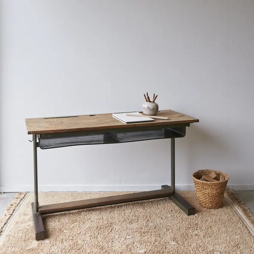 Wat een prachtige schooltafel met houten blad. Deze tafel is, ondanks dat hij hartstikke vintage is, nog een hele goede staat! Wij hebben de tafel goed schoongemaakt en nagelopen. Het blad is duidelijk van een hele goede kwaliteit hout gemaakt. Onder het blad bevindt zich twee vakken waar je boeken, tekeningen en andere spulletjes kan opbergen. De tafel heeft aan weerszijden twee haakjes, de plek waar vroeger de jas en de tas werd opgehangen. Deze vintage schooltafel komt uit Frankrijk. En nu schittert hij in onze winkel in Amersfoort. Deze prijs is exclusief de stoelen. Intressen in de stoelen? Samen kost de set 249,- euro.