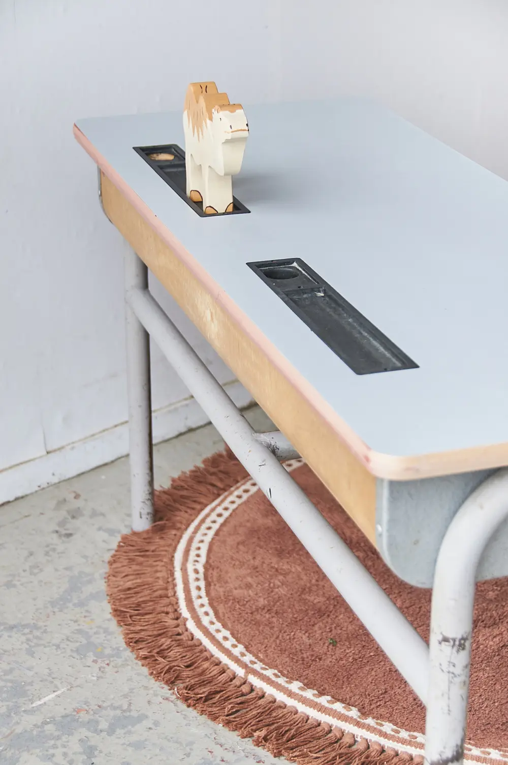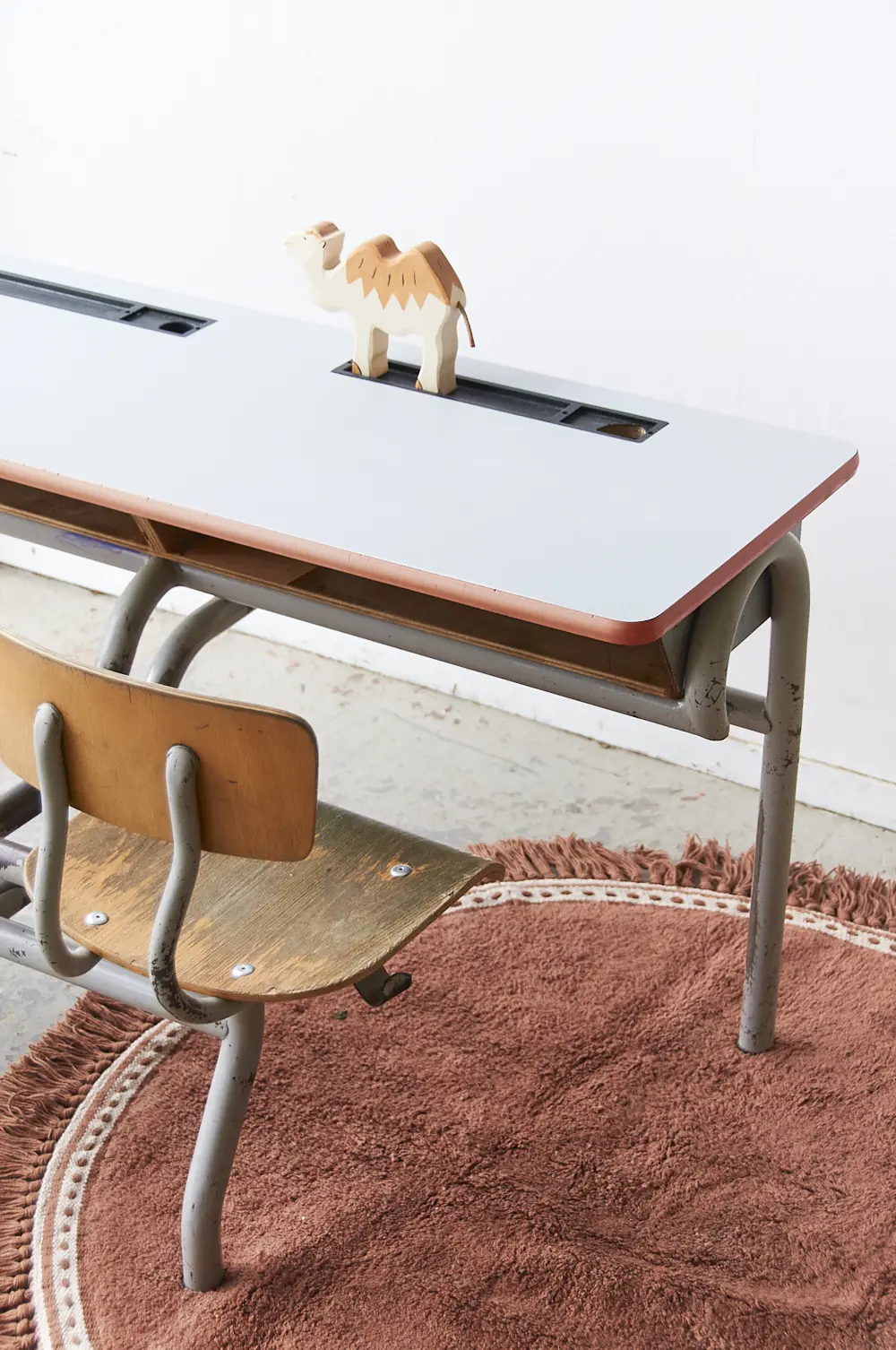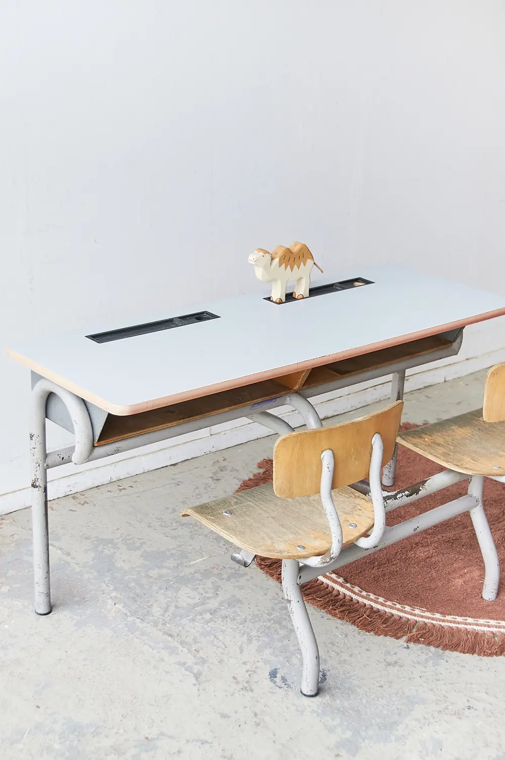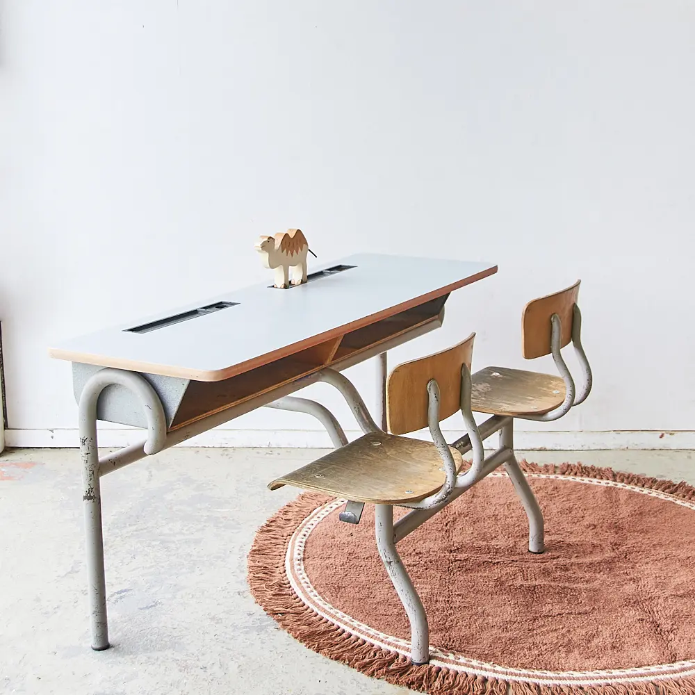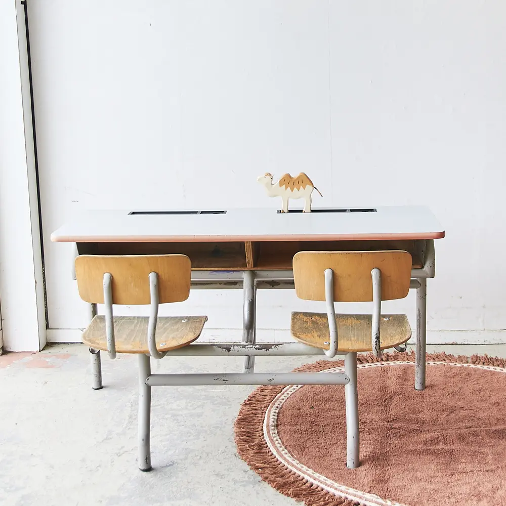 Vintage tweepersoons schoolbank grijs blad