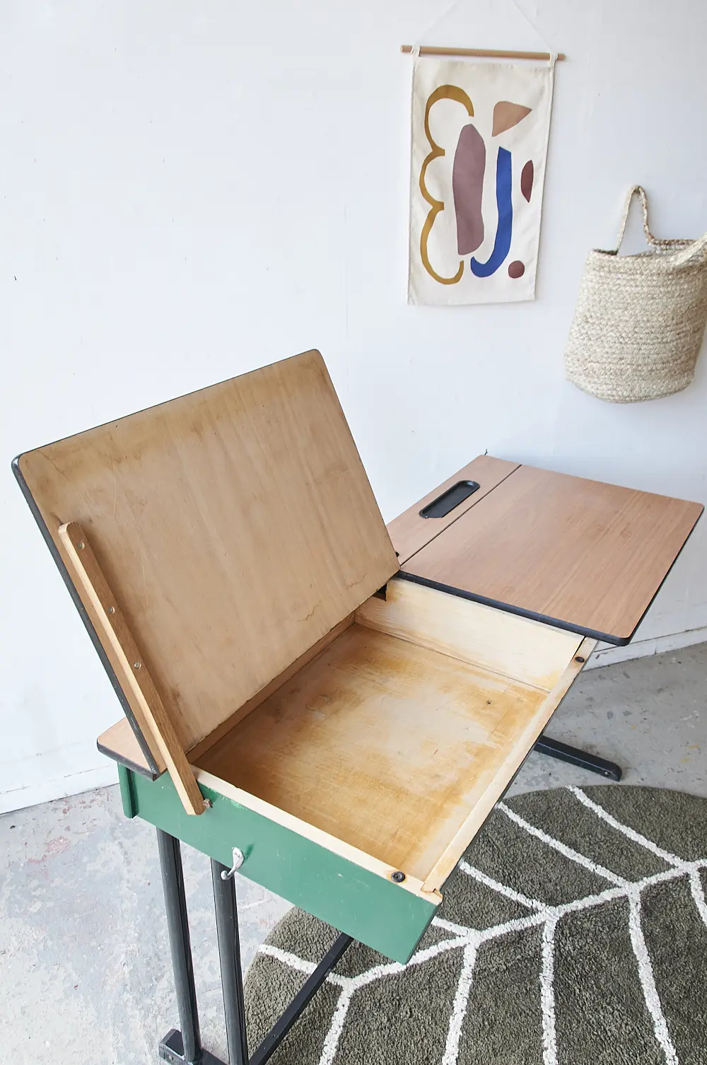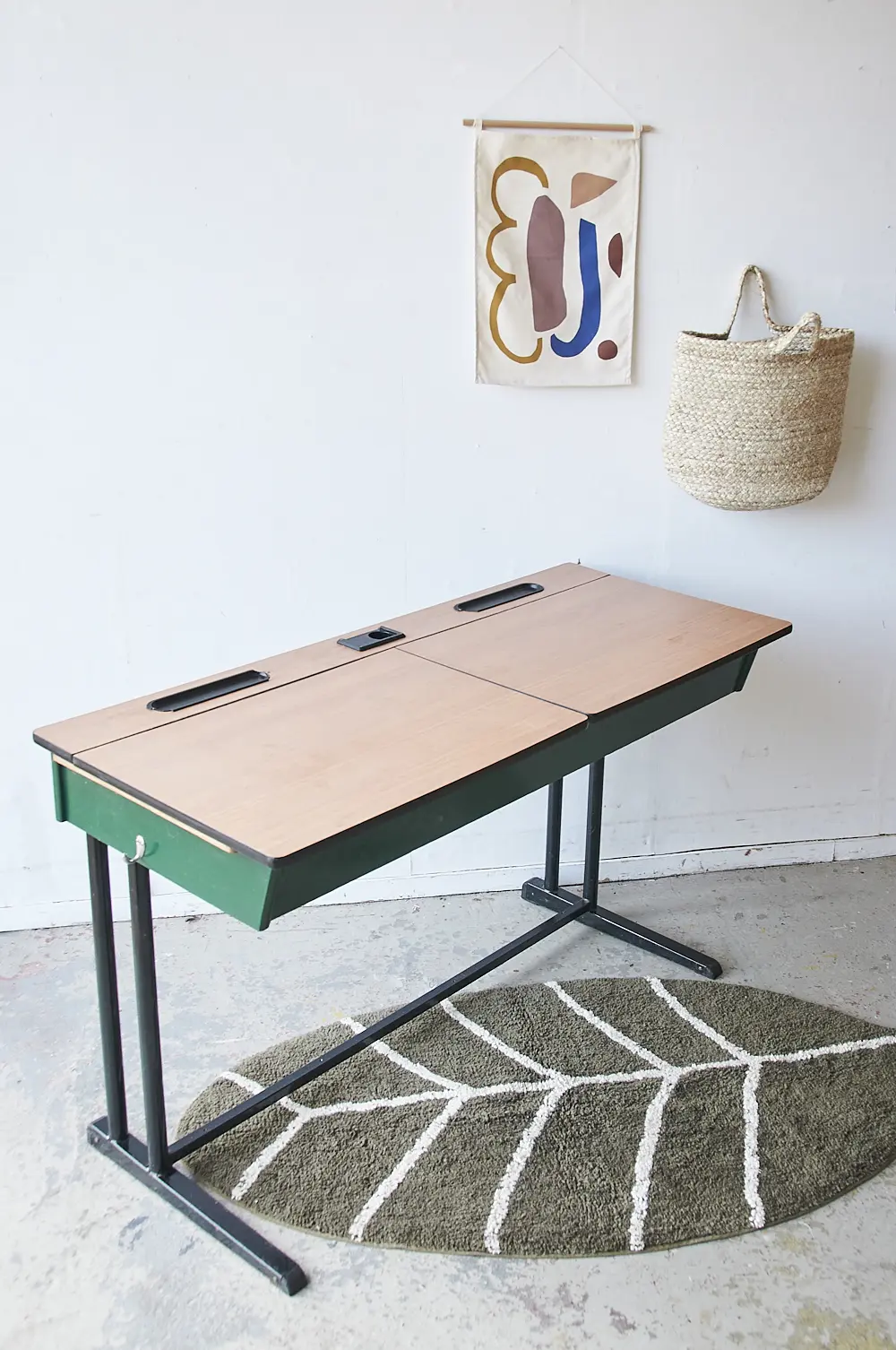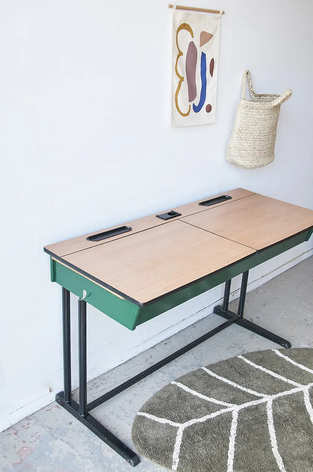 Een tweepersoons schooltafel met twee kleppen van formica. Beide kleppen kunnen open, super leuk om alle knutselspullen in op te bergen! Wat zijn wij blij met deze aanwinst! Wij hebben de tafel goed schoongemaakt. Klaar voor een nieuwe plek.