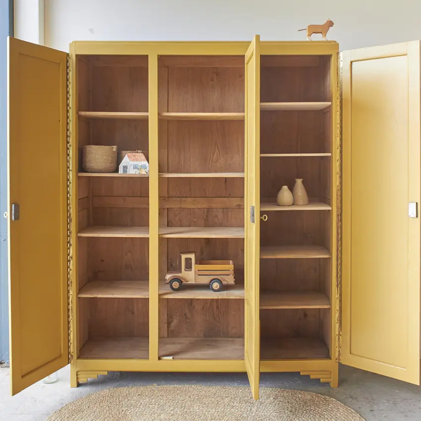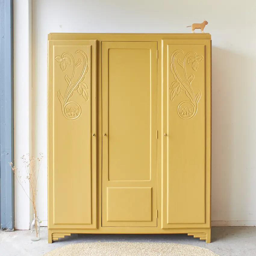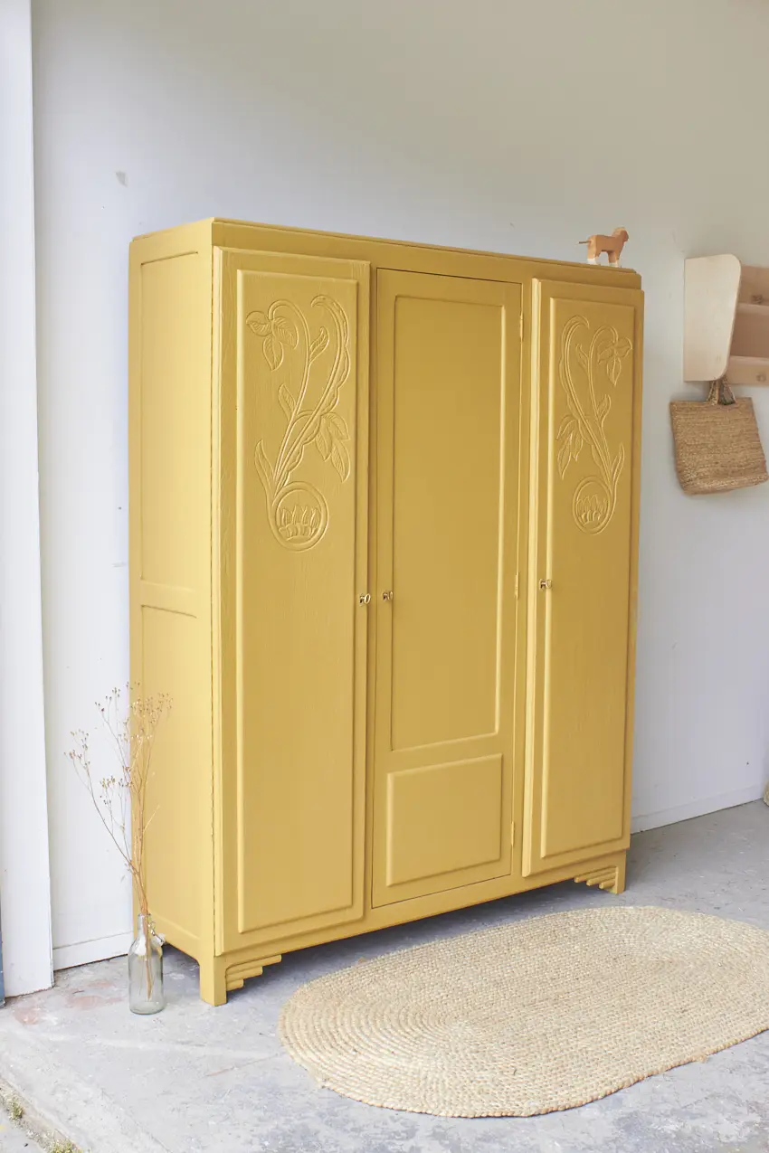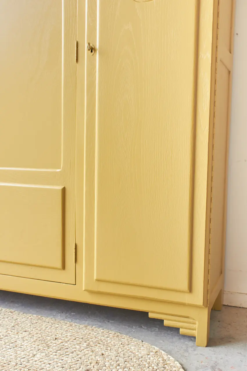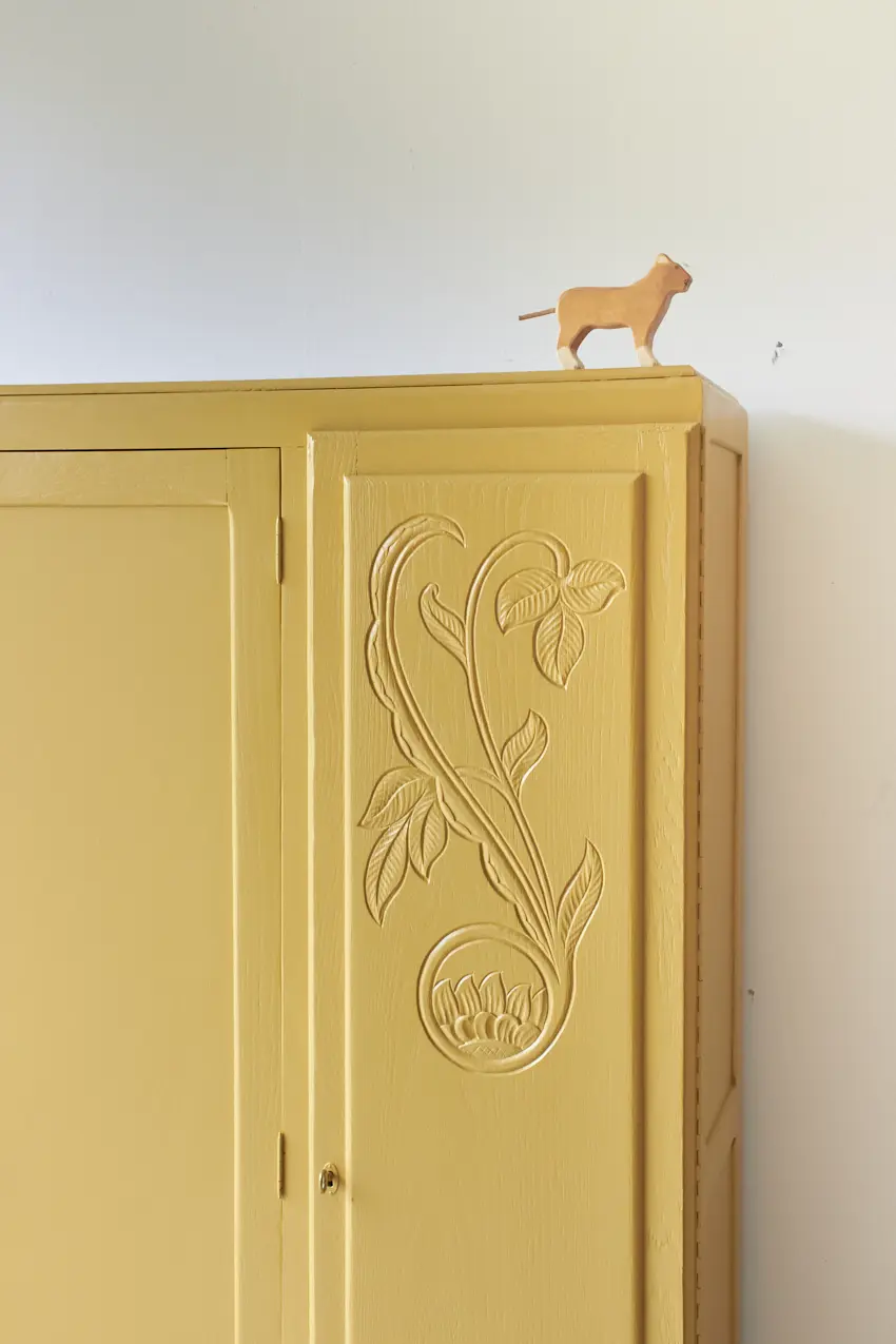 Wauw, wij hebben er weer 1, een mooie unieke kast in Saffraan. Zo vinden wij ze niet vaak. Het hout is van goede kwaliteit. De kast is zwaar en wat een mooie details heeft deze, de poten in combinatie met het houtsnijwerk! Ook de verschillende panelen geeft deze kast veel diepte. Het fijne aan deze kast is dat alle drie de deuren open kunnen, zo kun je overal gemakkelijk bij. Deze kast zal perfect staan in de hal voor alle schoenen en tassen of in de woonkamer voor alle spelletjes.