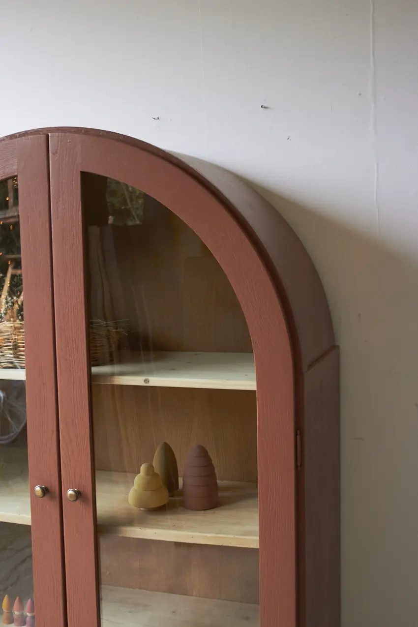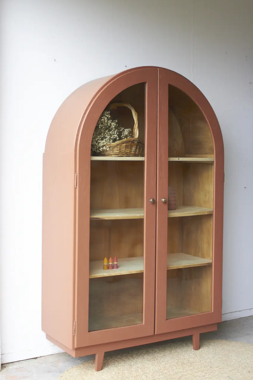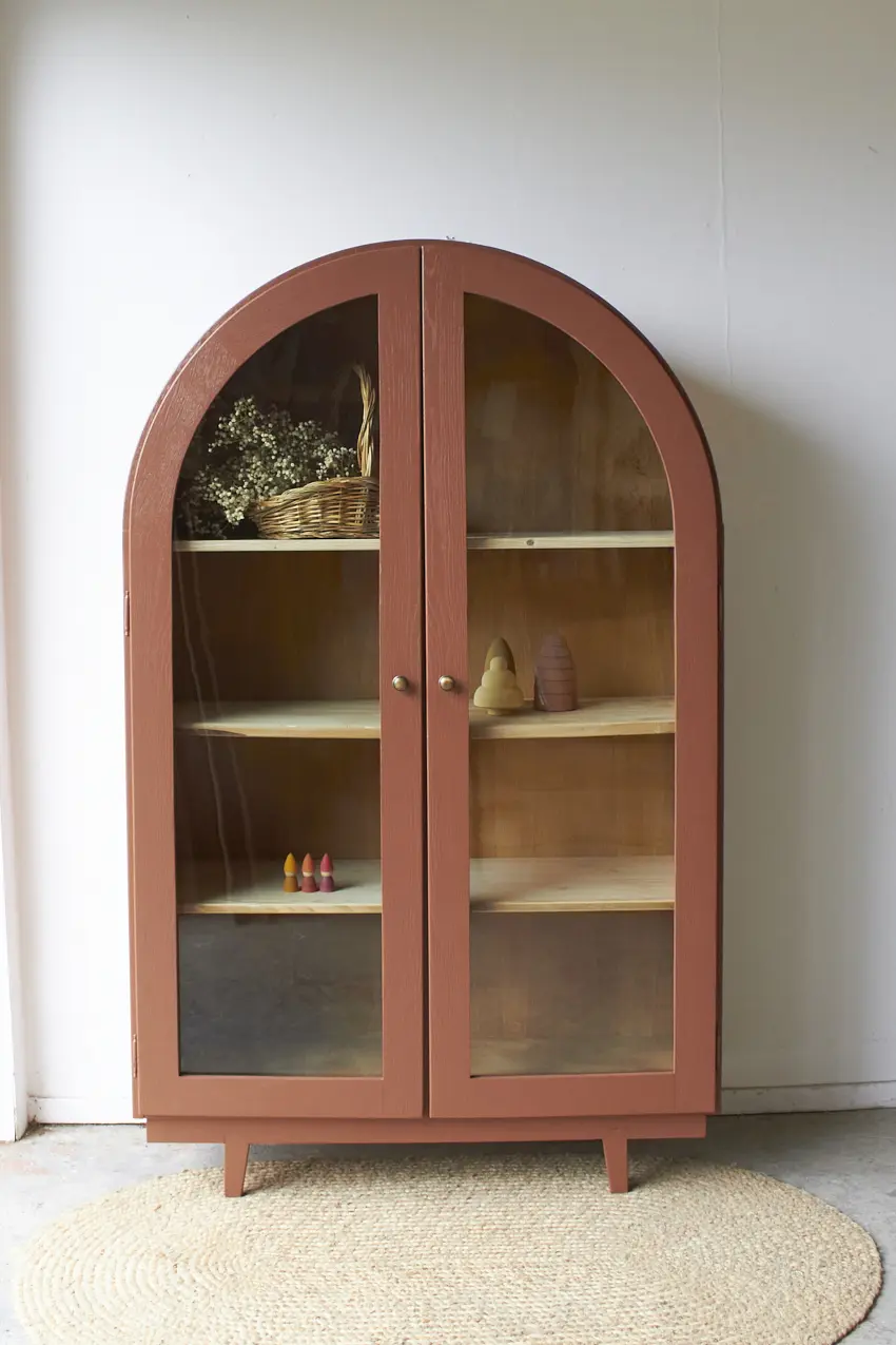 Het is al een tijdje geleden dat we een vitrinekast hebben gehad, maar wat zijn ze toch mooi! Helemaal met dit prachtige bolle dakje. En wat staat onze kleur Roest hem fijn. Oorspronkelijk had deze kast een bruine beits. We hebben deze eraf laten zandstralen en toen ineens kwam deze mooie sierlijke vitrinekast tevoorschijn.