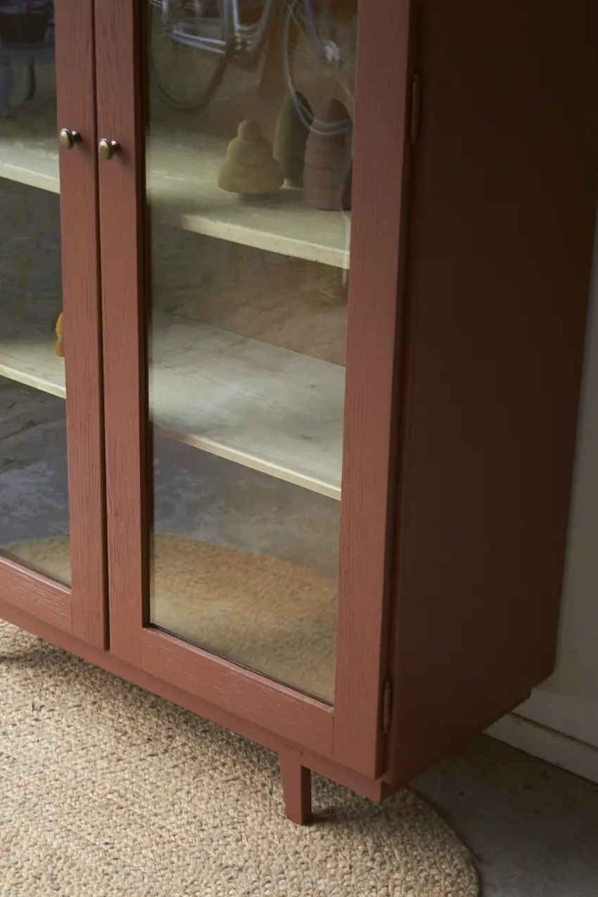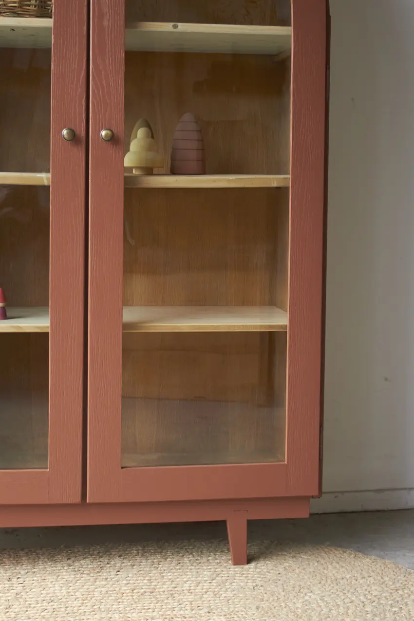We hebben een aantal nieuwe glaslatjes gemaakt, de nodige overige reparaties gedaan en nieuwe poten er onder geplaatst. Uiteindelijk hebben we gekozen voor onze kleur Roest. De deuren sluiten fijn met bijpassende vintage bronzen knoppen en magneetjes. Zo gaan de deuren gemakkelijk open en dicht. Wat zal hij mooi staan in huis!