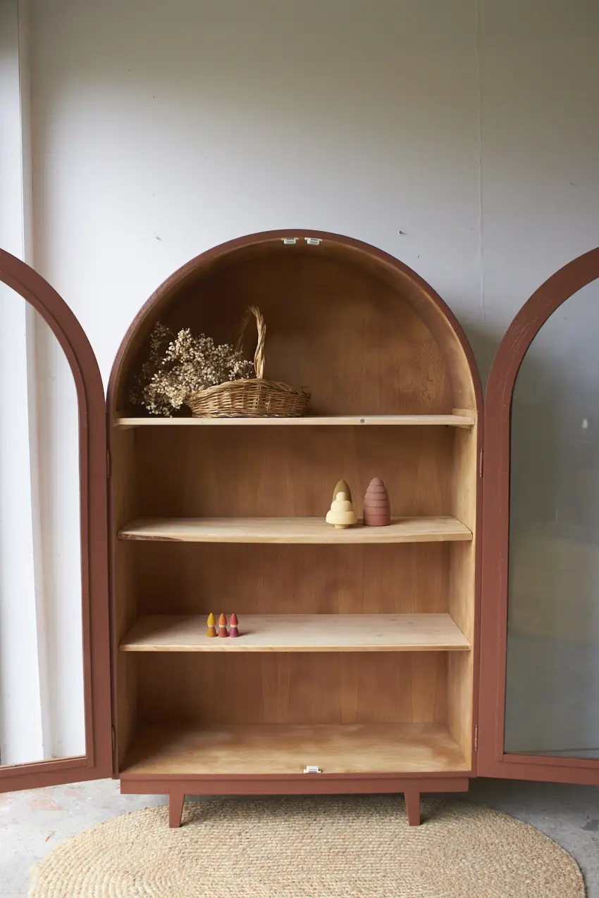 Daarna hebben we hem grondig schoongemaakt en behandeld tegen houtworm. De indeling hebben we opnieuw op maat gemaakt met planken die we ook hebben hergebruikt, elke plak is daarom net wat anders maar stevig en perfect voor deze vitrine kast. Achter het glas is er nu weer genoeg plek voor servies, boeken, of andere mooie spullen.