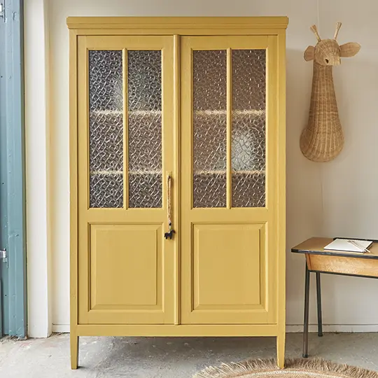 We hebben er weer eentje, een vitrinekast! En niet zomaar een, het geribbelde glas maakt het net weer een beetje anders. Wat is hij leuk geworden. De kast zelf is van eikenhout gemaakt, echt prachtig. We hebben de kast grondig schoongemaakt en behandeld tegen houtworm. Vervolgens kreeg hij de nodige reparaties. De originele planken zitten er nog in, deze zijn in hoogte verstelbaar. We hebben er voor gekozen de kast in onze mooie Saffraan te schilderen. In combinatie met het glas en de koperkleurige sleutel heel tof. De deuren gaan net anders open dan de meeste kasten, de rechter deur sluit met schuifjes van binnen, de linker deur sluit met het originele slot en sleutel. De kast is weer helemaal klaar voor gebruik! Klik HIER, voor onze kleden en kinderkamer decoratie.