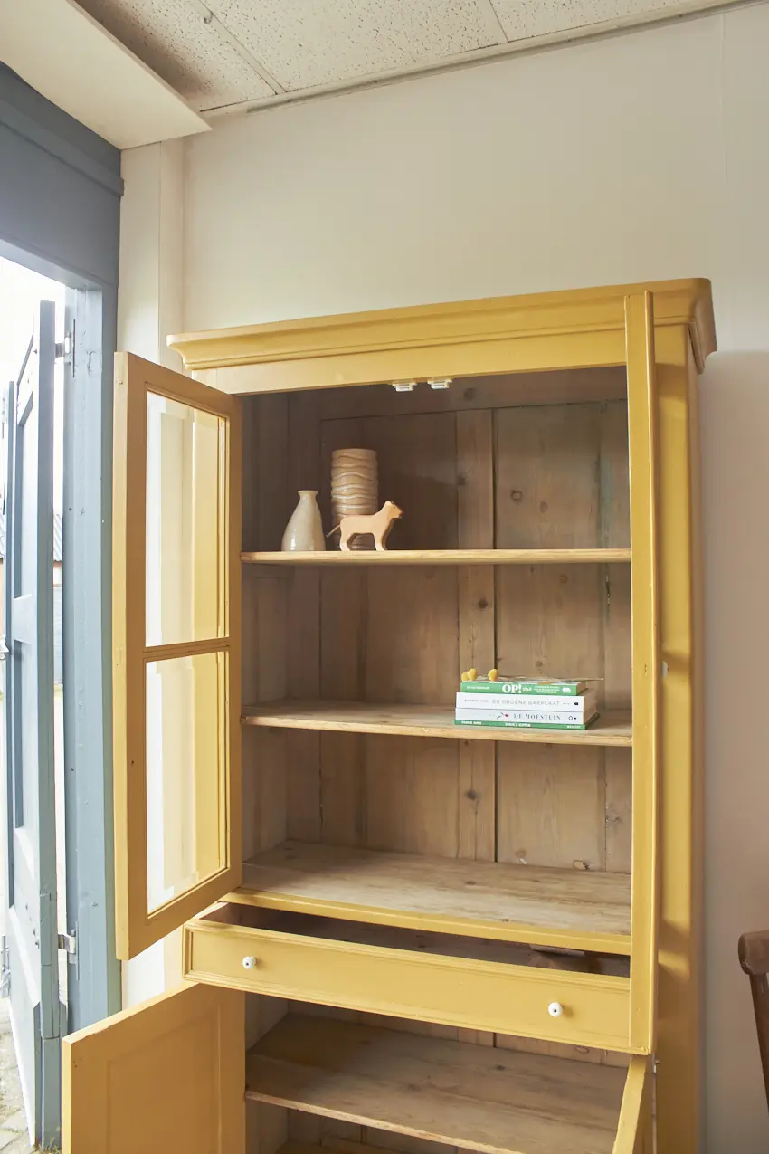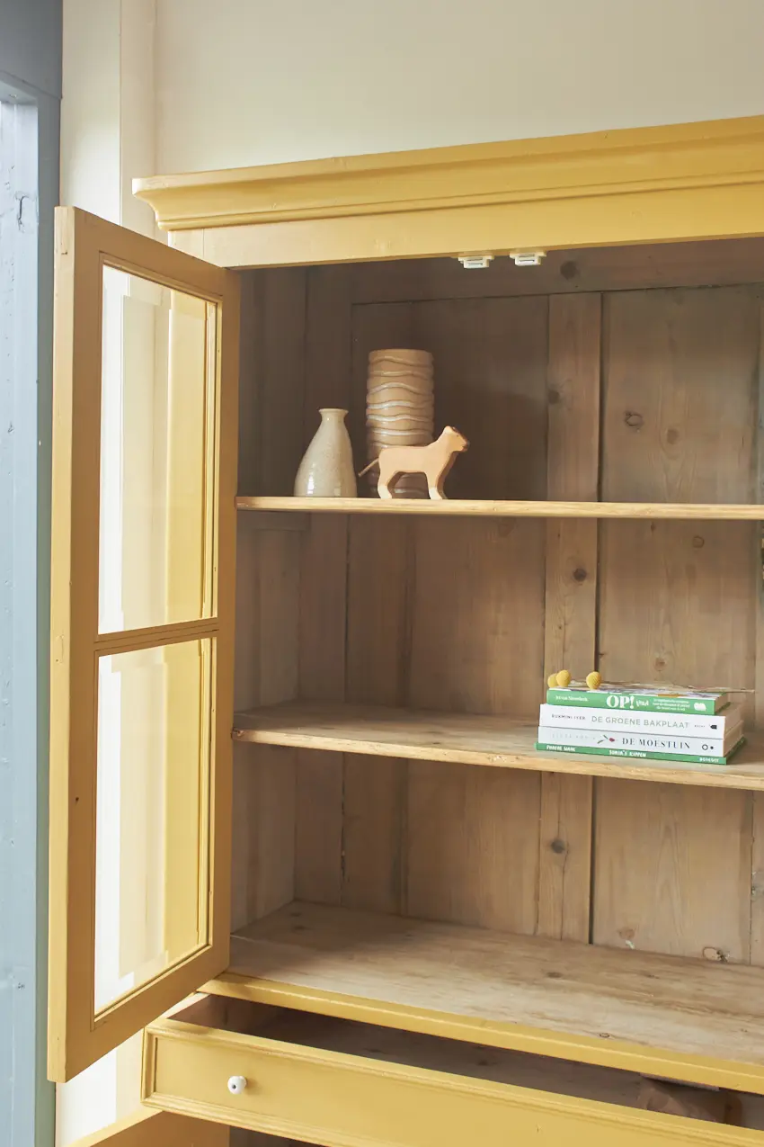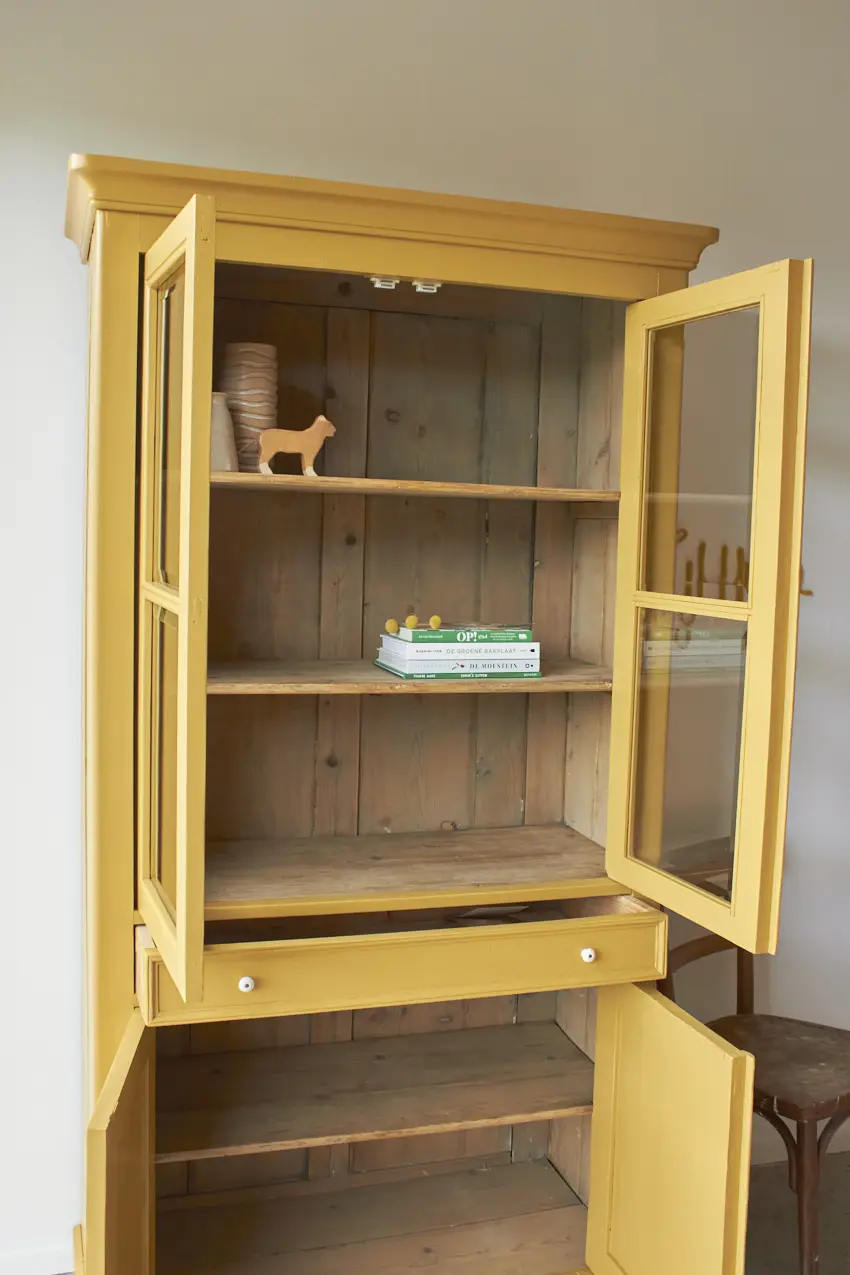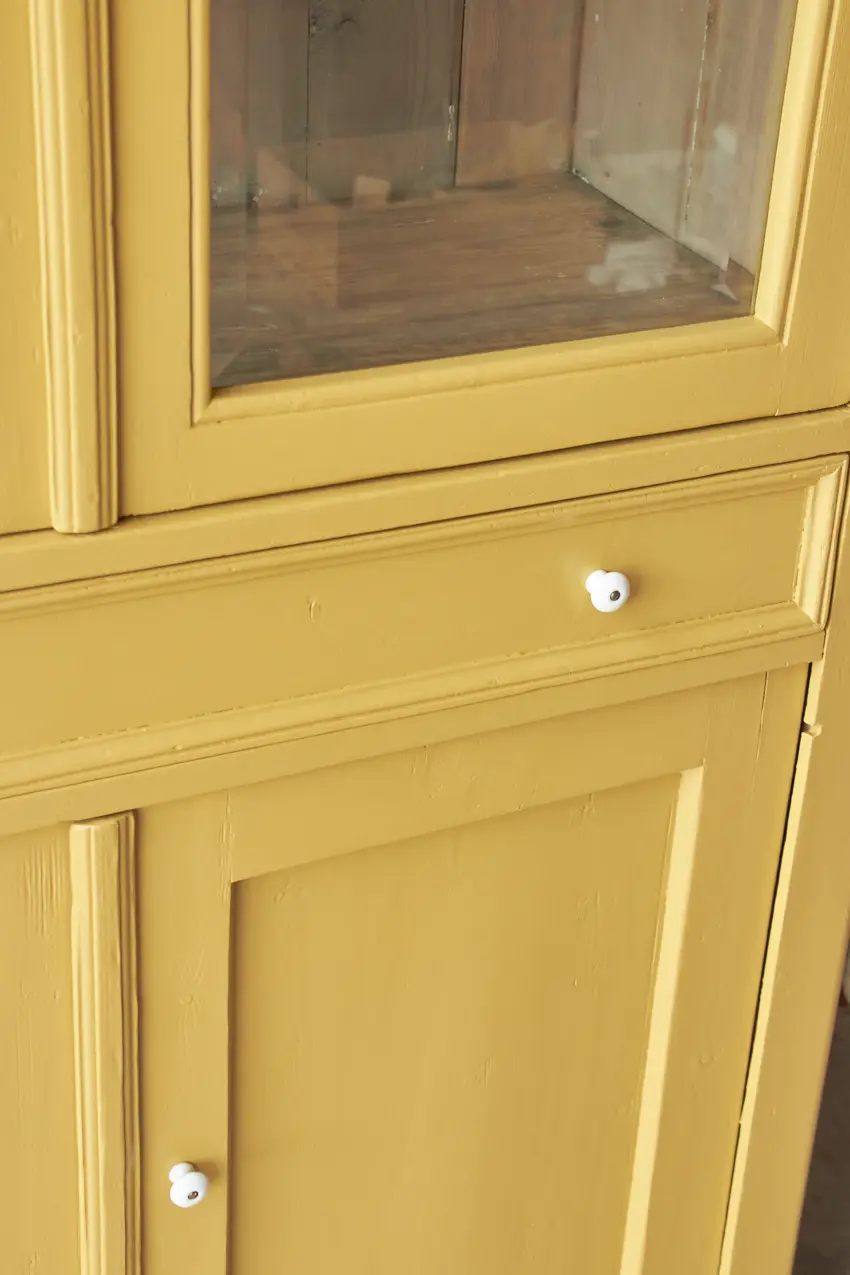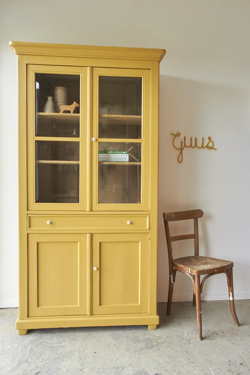 Na alle reparaties en de grondverf laag hebben we gekozen voor onze kleur Saffraan. Een warme, gele tint die prachtig staat op deze vitrinekast. Wat zijn we toch blij met deze kleur! De porseleinen knopjes op de lade en deuren maken hem helemaal af.