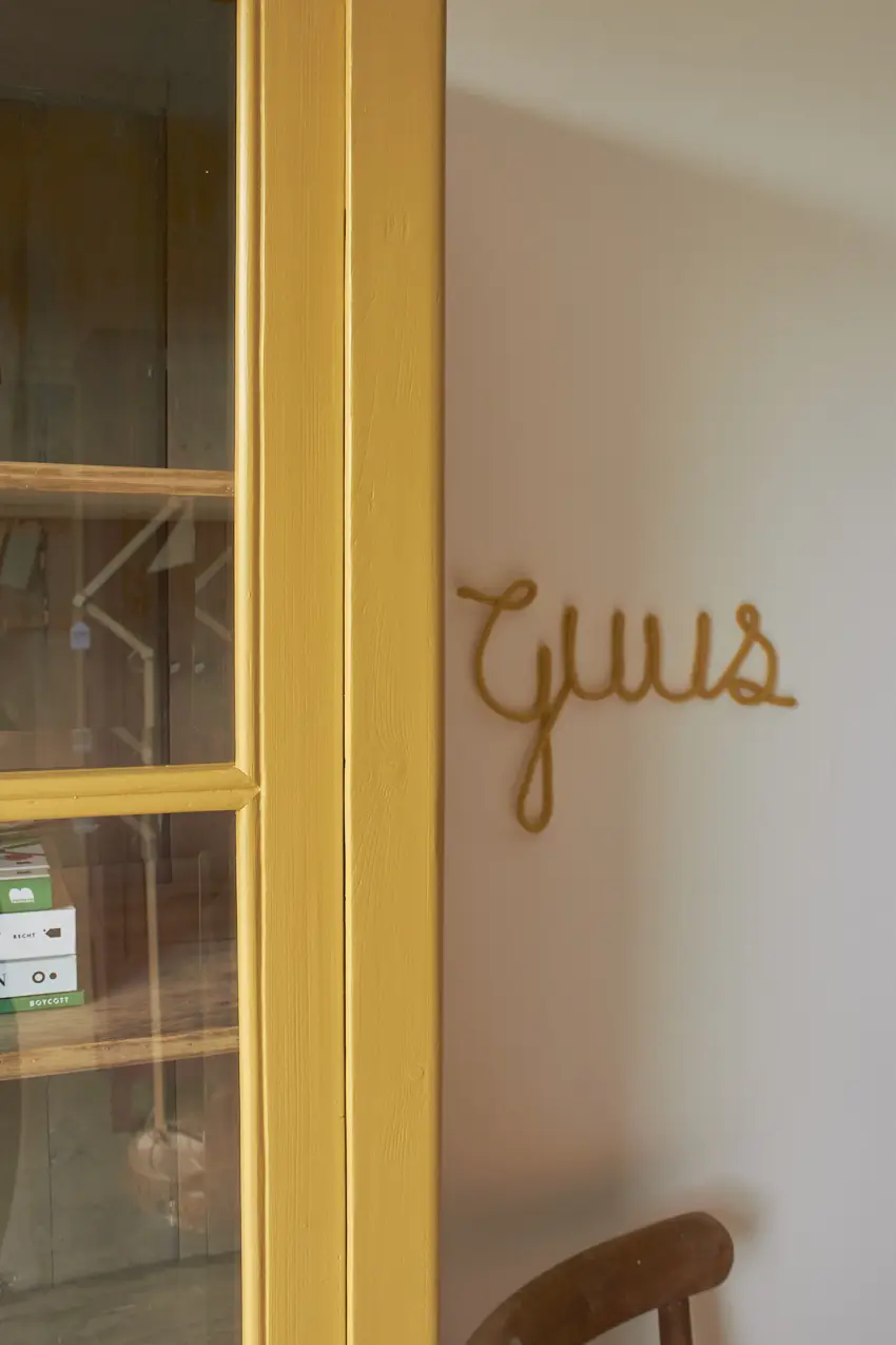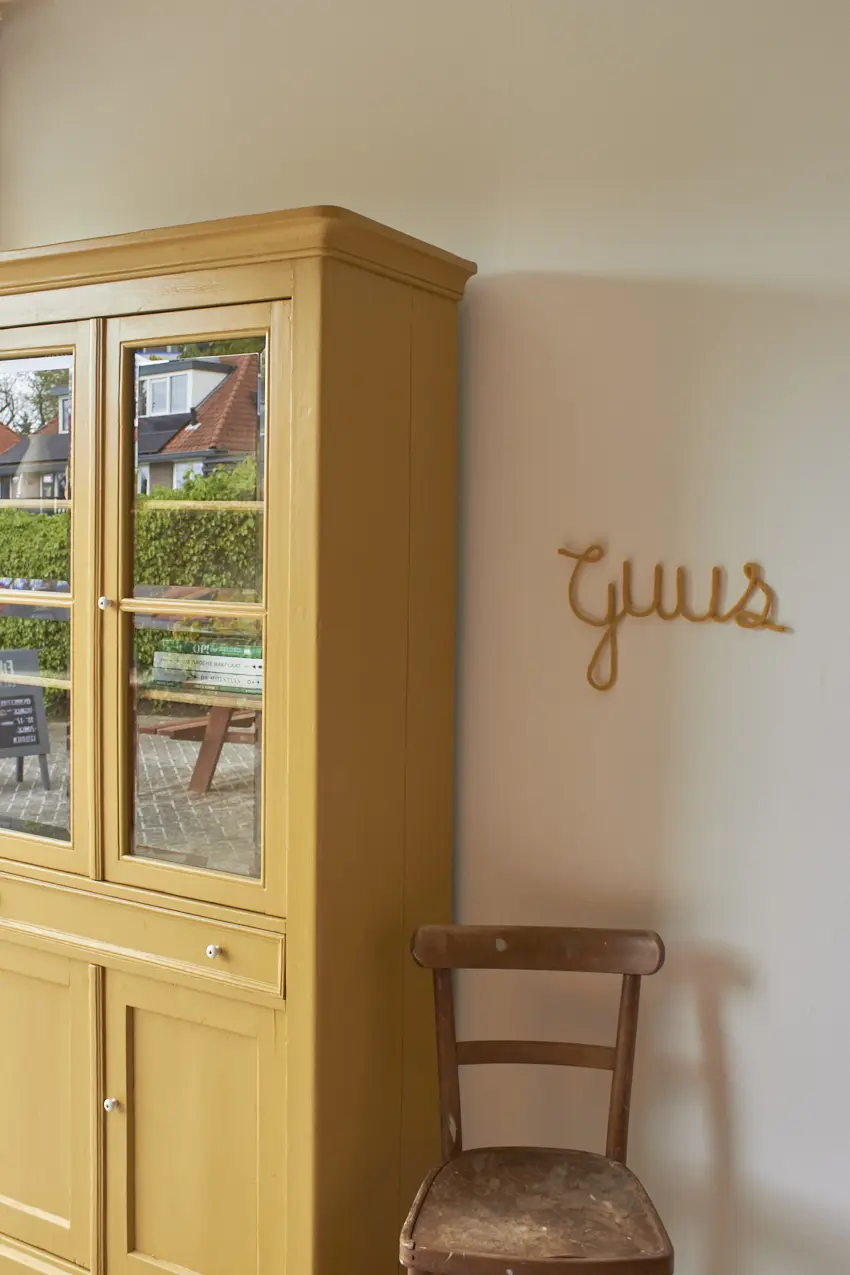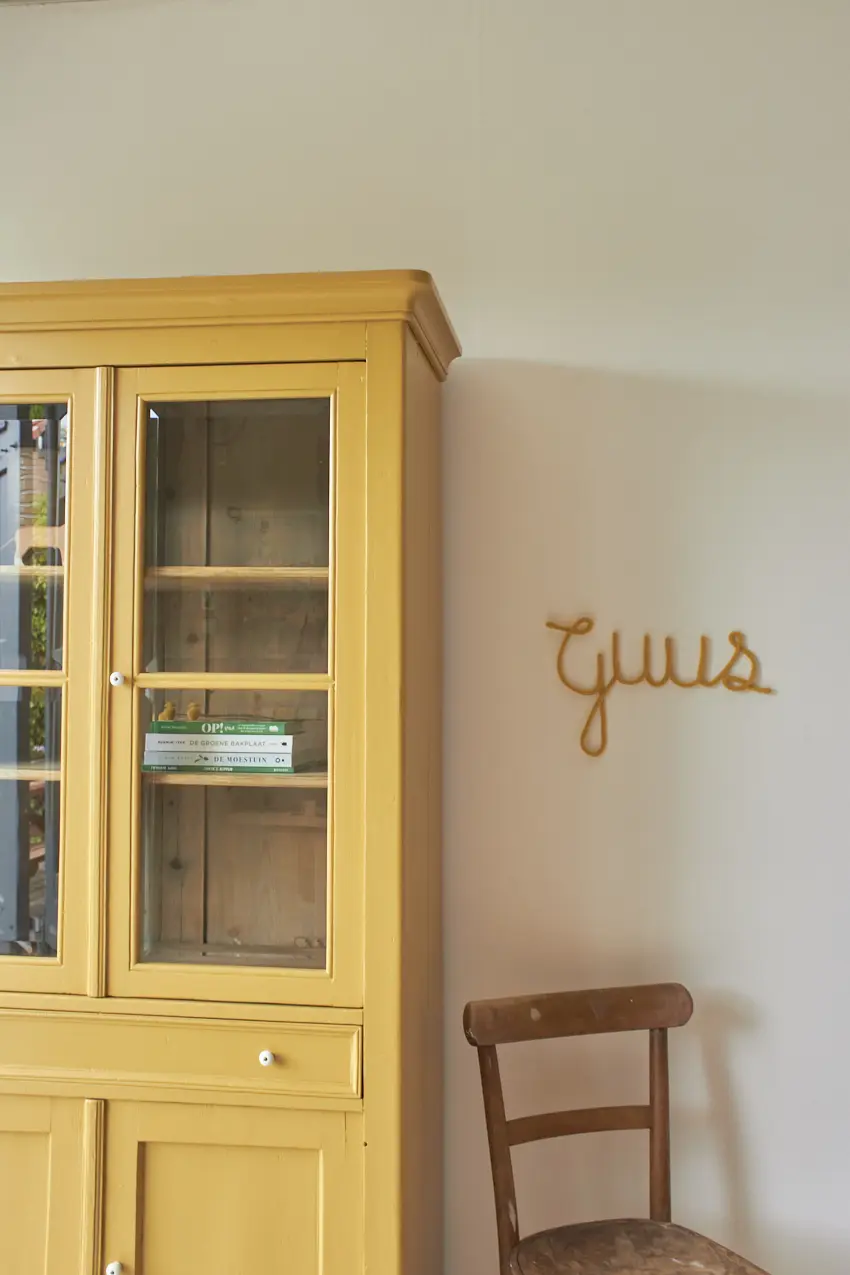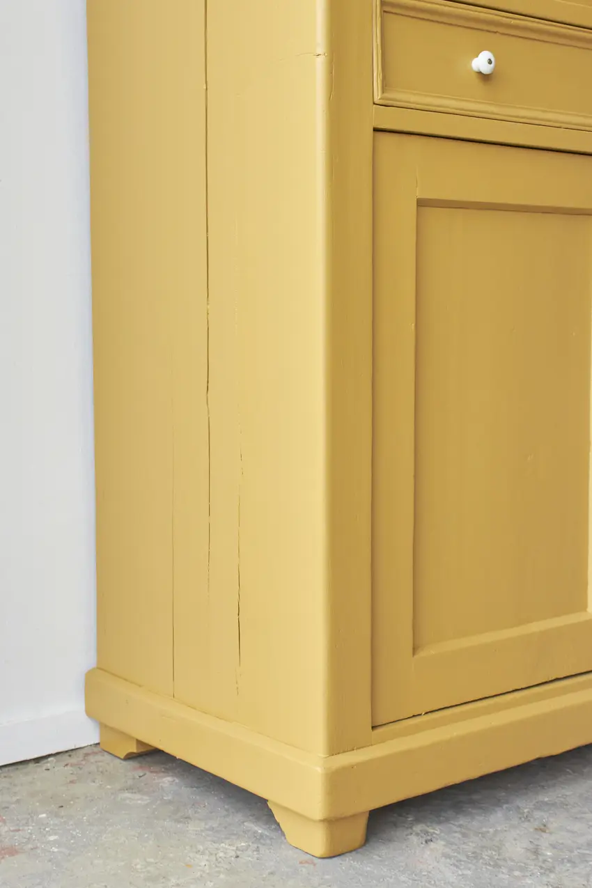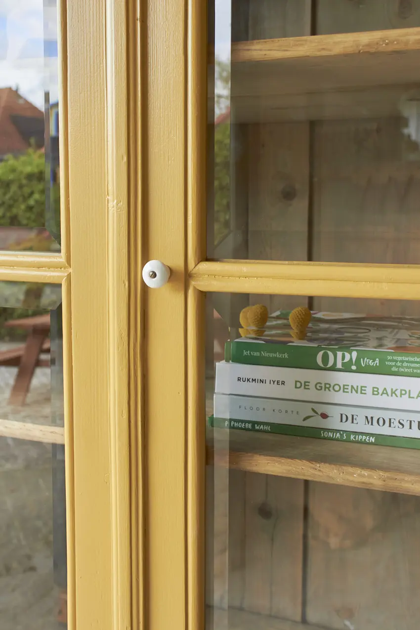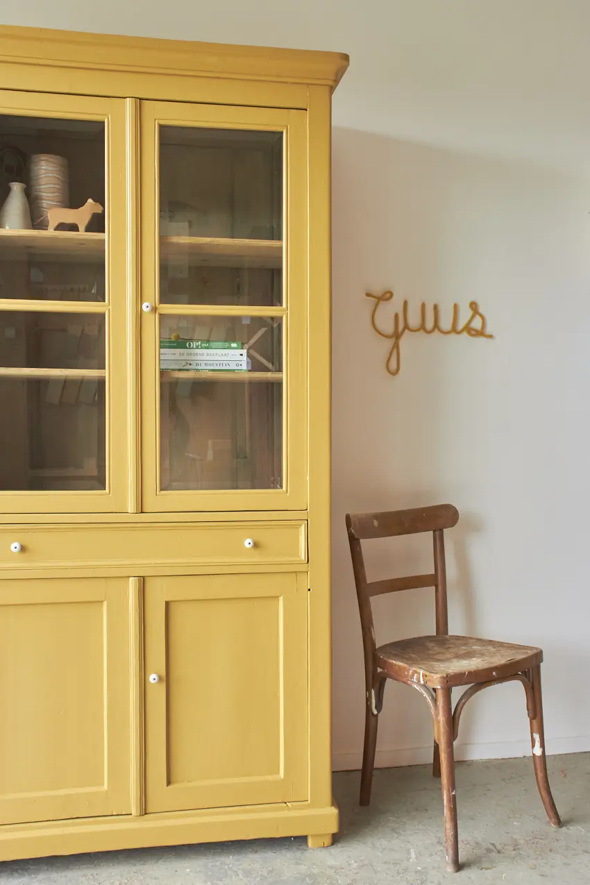 Na alle reparaties en de grondverf laag hebben we gekozen voor onze kleur Saffraan. Een warme, gele tint die prachtig staat op deze vitrinekast. Wat zijn we toch blij met deze kleur! De porseleinen knopjes op de lade en deuren maken hem helemaal af.