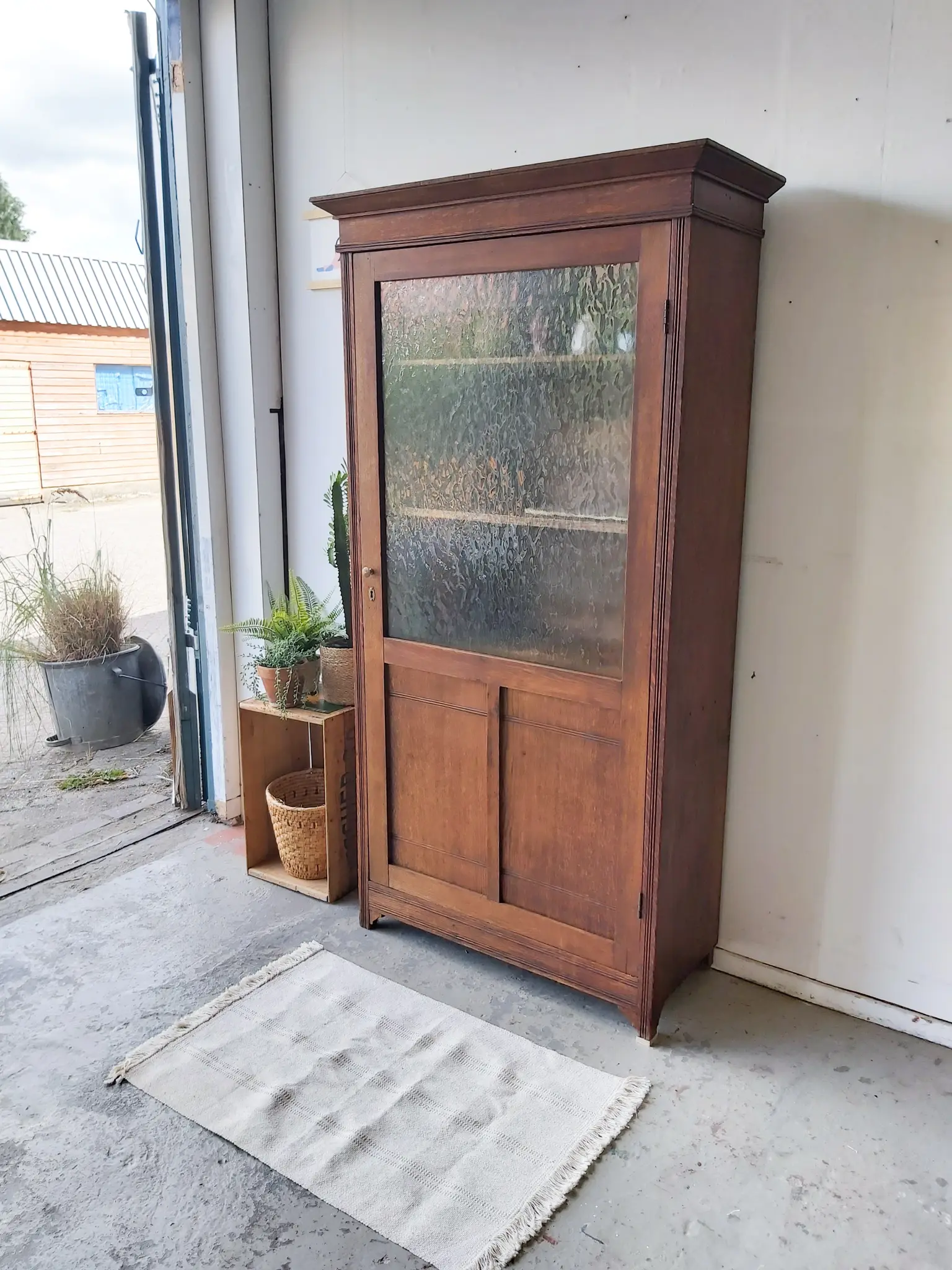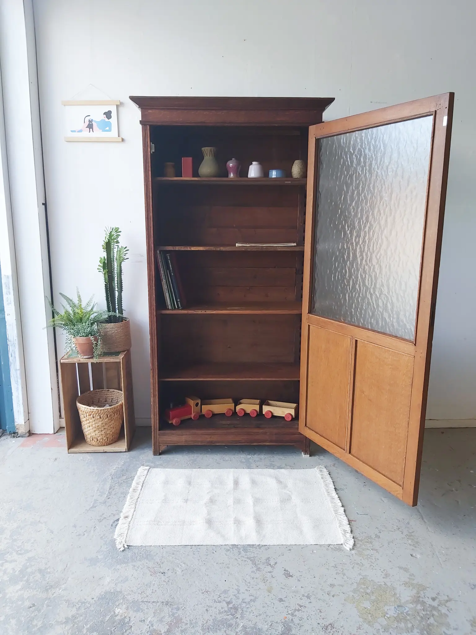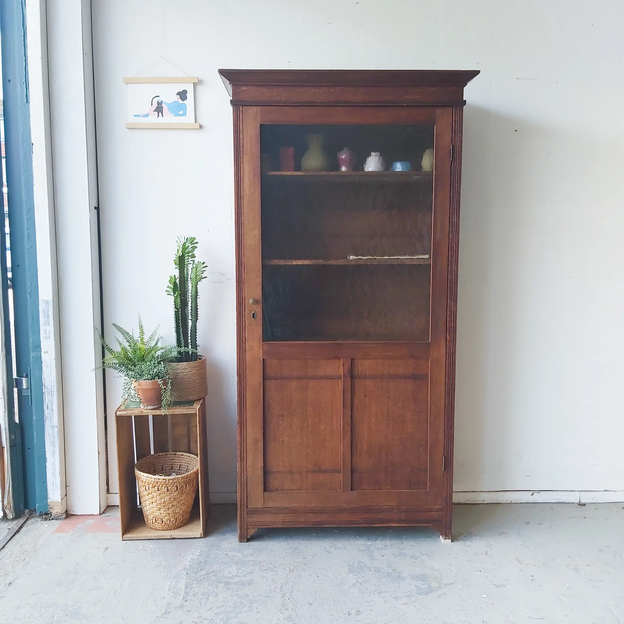 Een prachtige, authentieke vitrinekast! We vonden het hout nog zo mooi, zeker in combinatie met het bobbeltjes glas, dat we besloten de kast zo te laten. We hebben van resthout nieuwe planken gemaakt in de kast, welke in hoogte verstelbaar zijn. De kast heeft hier en daar wel wat gebruikssporen, een gaatje van een oud sleutelplaatje bijvoorbeeld of aan de zijkant twee gaatjes waar waarschijnlijk een haakje heeft gezeten. We vonden dit niet zo storend, juist charmant en karakteristiek. Het maakt de kast vintage. We hebben alles nagelopen, gerepareerd waar nodig en behandeld tegen houtworm. De deur is voorzien van een nieuwe knop en een bijpassend sleutelplaatje. Hij sluit door middel van een magneet. We hebben het hout behandeld met een voedende olie en zo is hij weer helemaal klaar voor gebruik!
