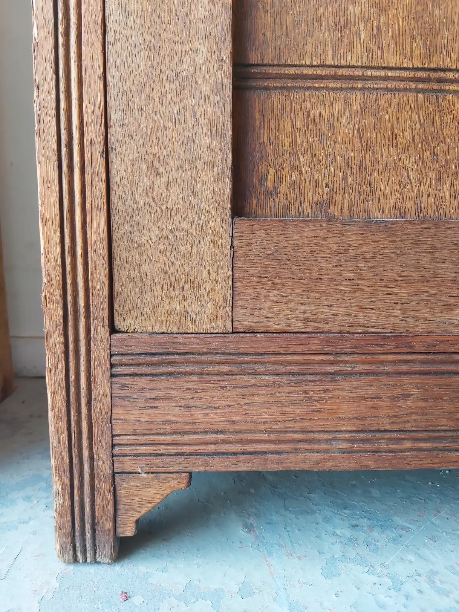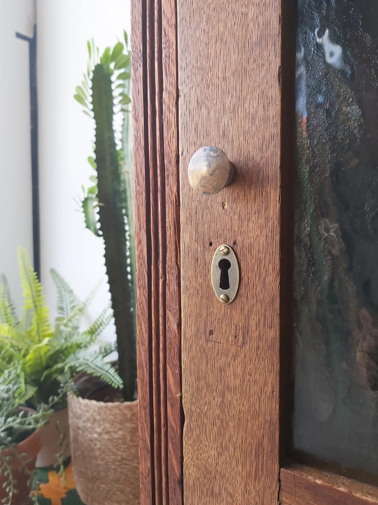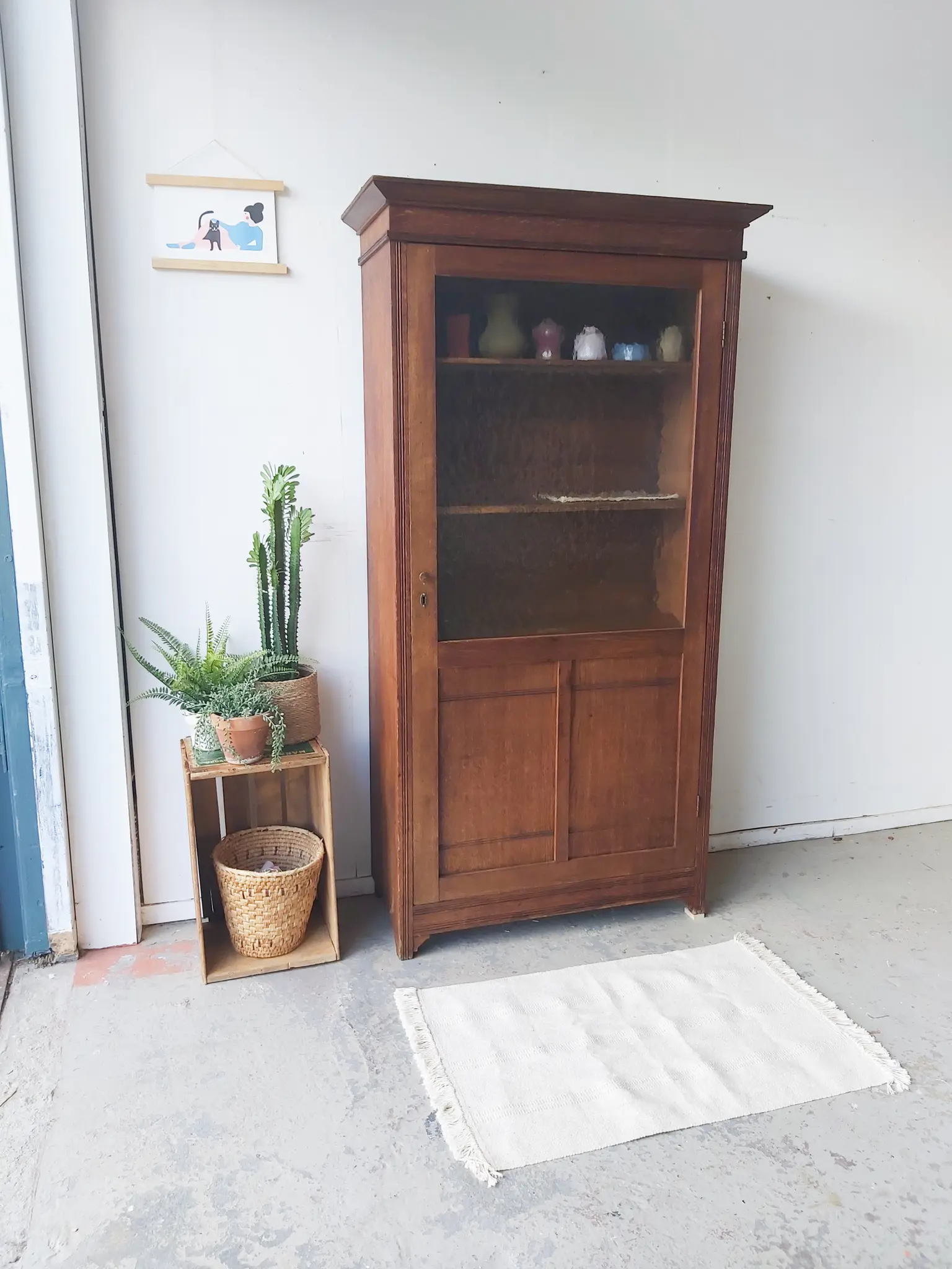 Een prachtige, authentieke vitrinekast! We vonden het hout nog zo mooi, zeker in combinatie met het bobbeltjes glas, dat we besloten de kast zo te laten. We hebben van resthout nieuwe planken gemaakt in de kast, welke in hoogte verstelbaar zijn. De kast heeft hier en daar wel wat gebruikssporen, een gaatje van een oud sleutelplaatje bijvoorbeeld of aan de zijkant twee gaatjes waar waarschijnlijk een haakje heeft gezeten. We vonden dit niet zo storend, juist charmant en karakteristiek. Het maakt de kast vintage. We hebben alles nagelopen, gerepareerd waar nodig en behandeld tegen houtworm. De deur is voorzien van een nieuwe knop en een bijpassend sleutelplaatje. Hij sluit door middel van een magneet. We hebben het hout behandeld met een voedende olie en zo is hij weer helemaal klaar voor gebruik!