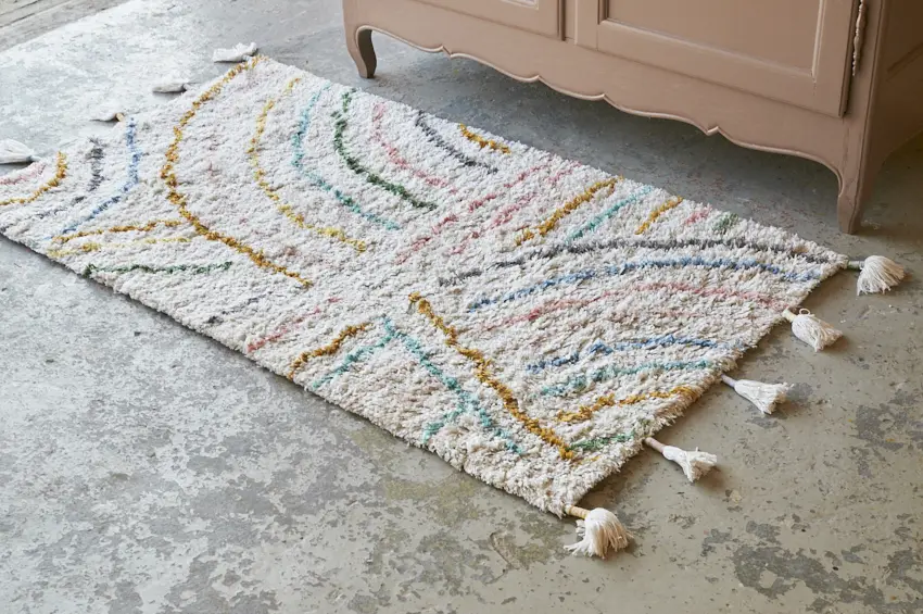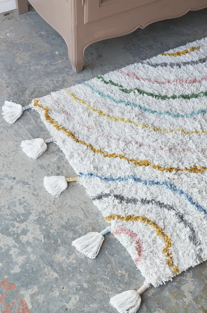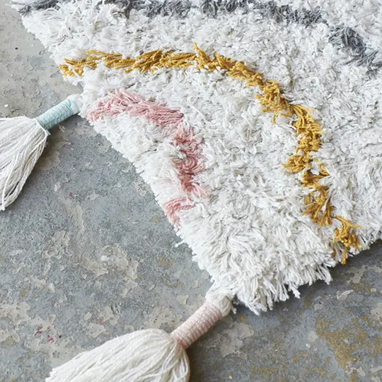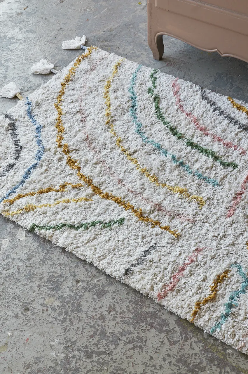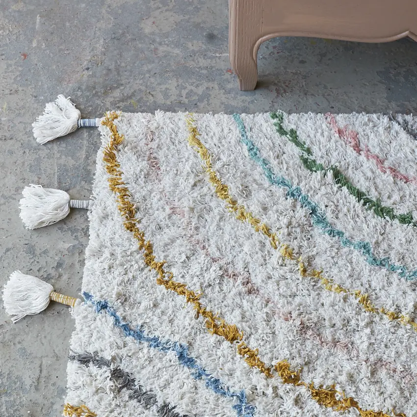 Dit vloerkleed met zijn leuke, speelse kwastjes is gemaakt van zacht katoen. Fijn voor onder de commode of om je kindje lekker op te laten spelen! De print is geïnspireerd op een traditioneel berber kleed. De pastel kleuren zijn goed te combineren en passen in iedere kamer. Het vloerkleed geeft een fijne sfeer aan elke kamer in huis.