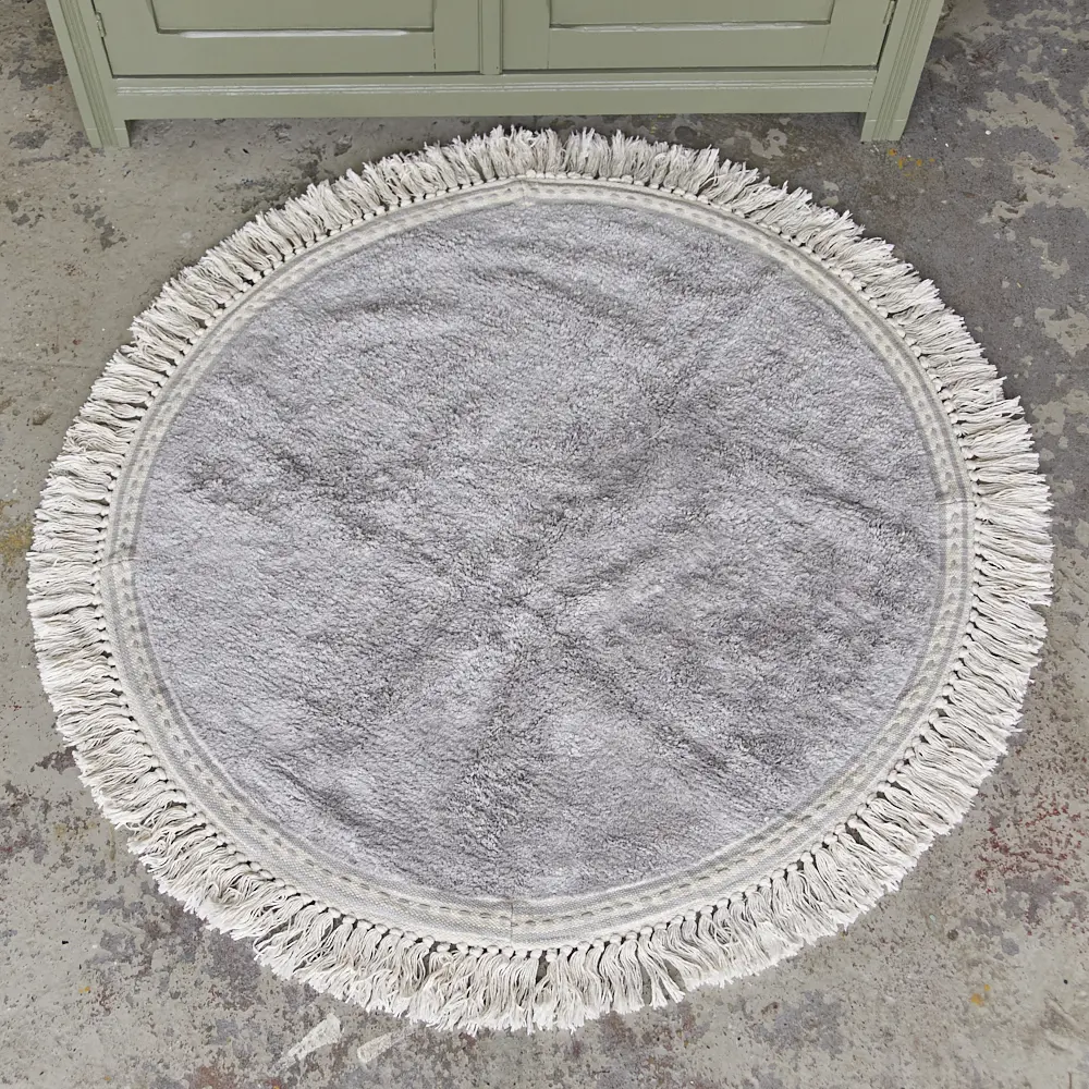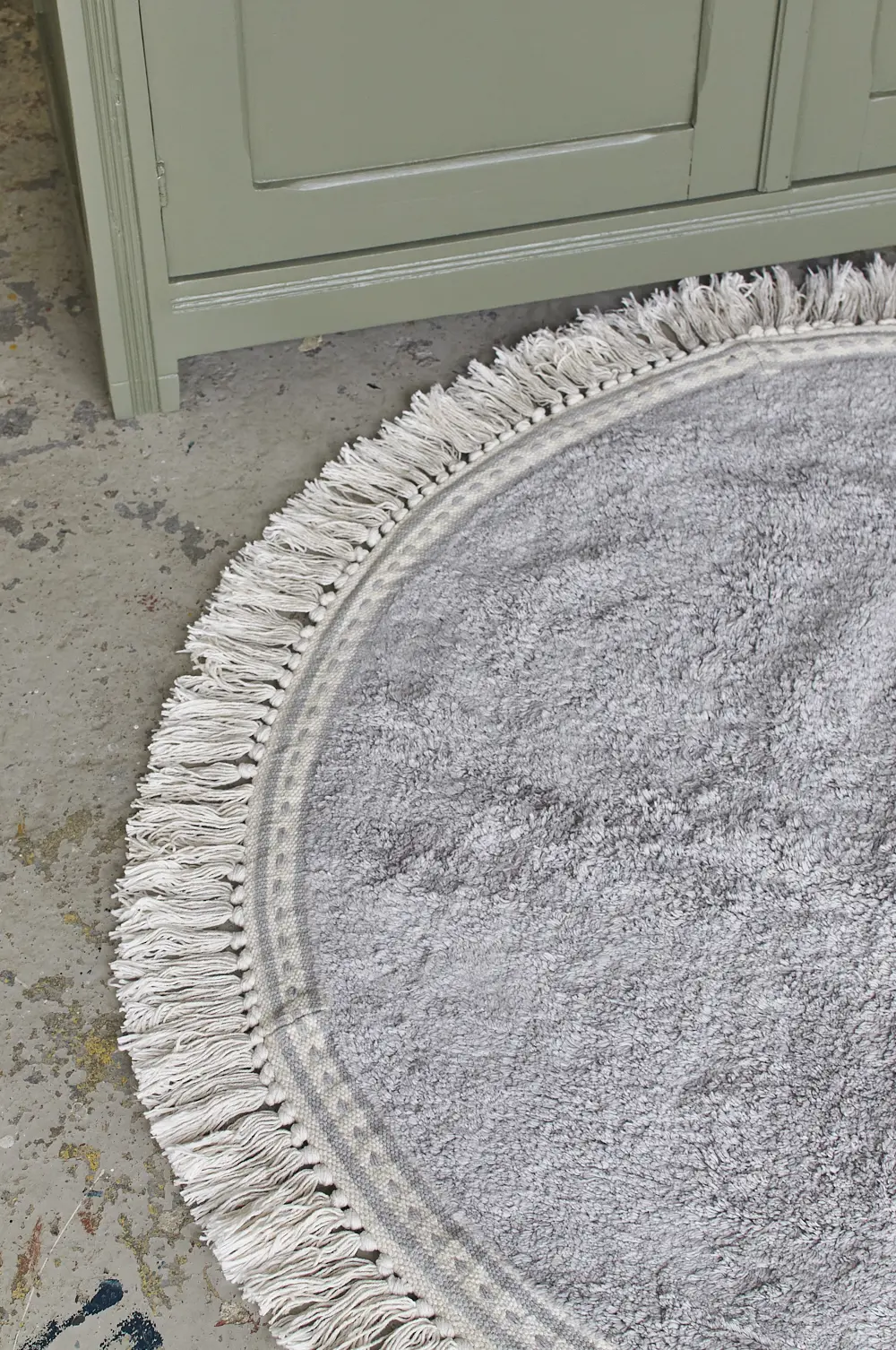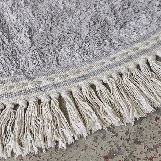 Dit ronde vloerkleed past echt overal. Op de kinderkamer onder de commode, het bedje of gewoon in de woonkamer of hal. Door de fijne zachte grijstinten is dit kleed heel fijn te combineren. En hoe leuk zijn de speelse kwastjes rondom! Dit vloerkleed ziet er heerlijk zacht uit en dat is hij ook. Fijn om met je blote voeten op te lopen of om op te spelen. Het kleed is gemaakt van gerecycled katoen en kun je met de hand wassen op 30 graden.