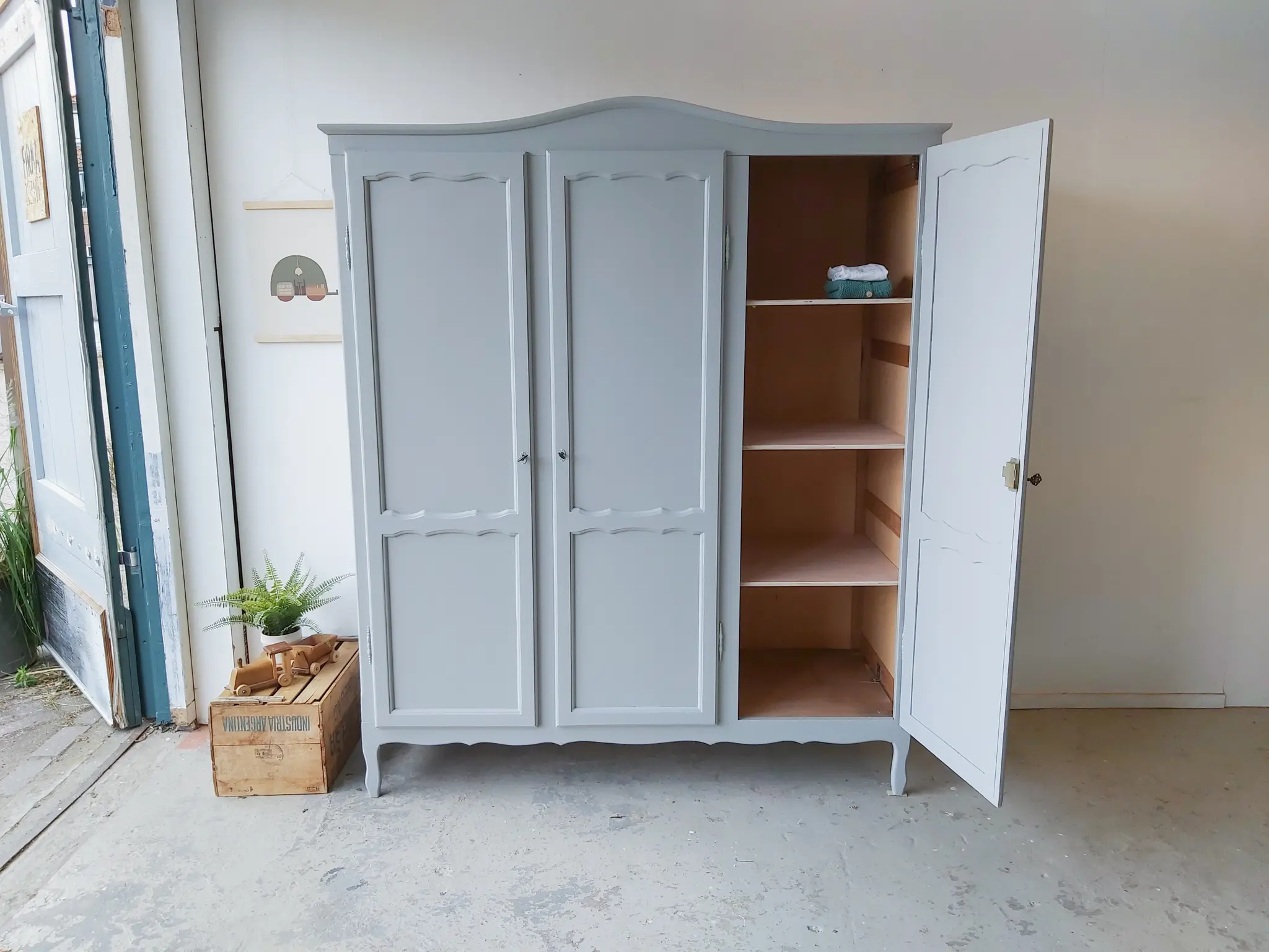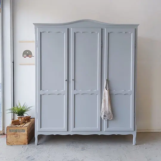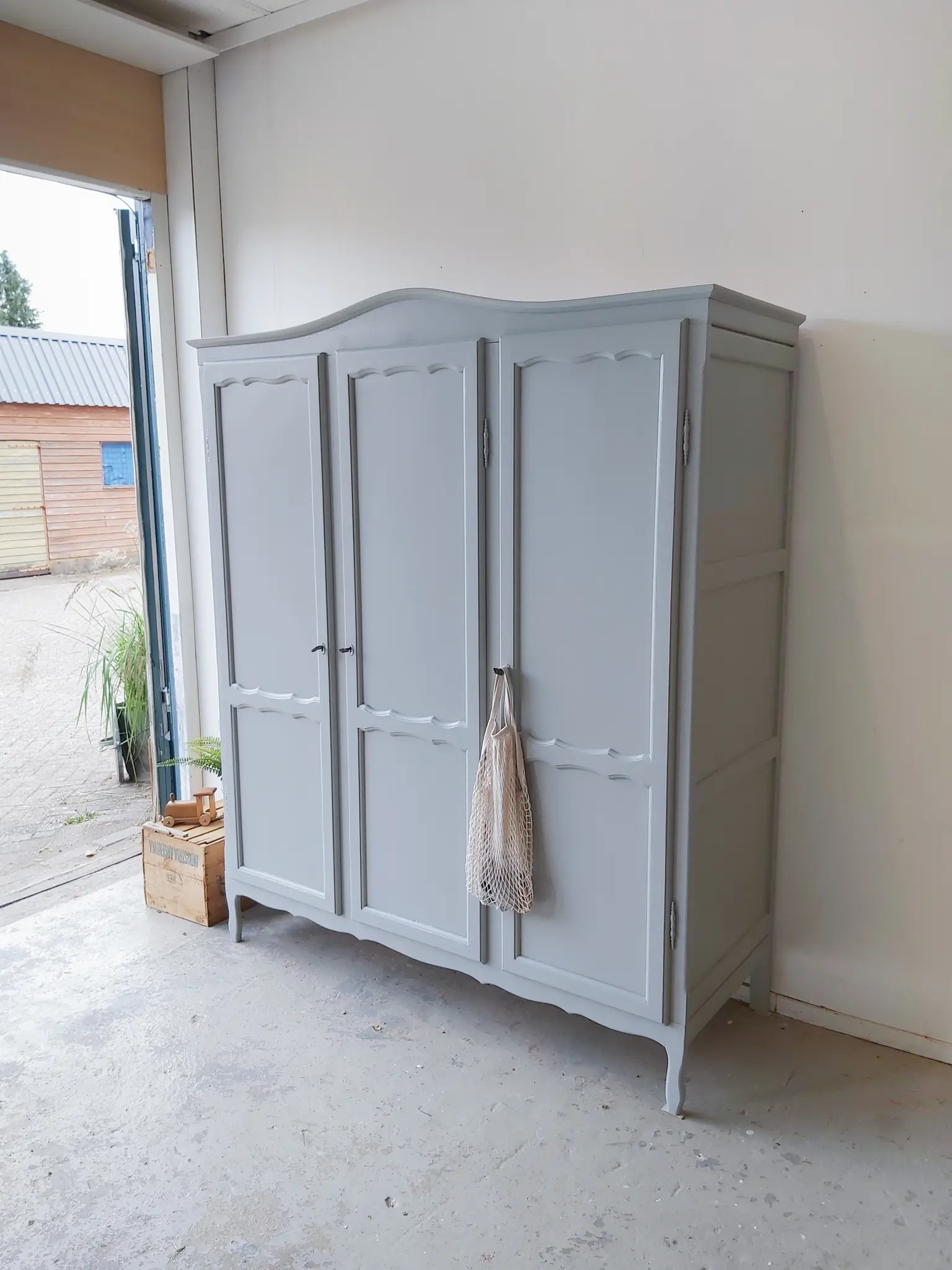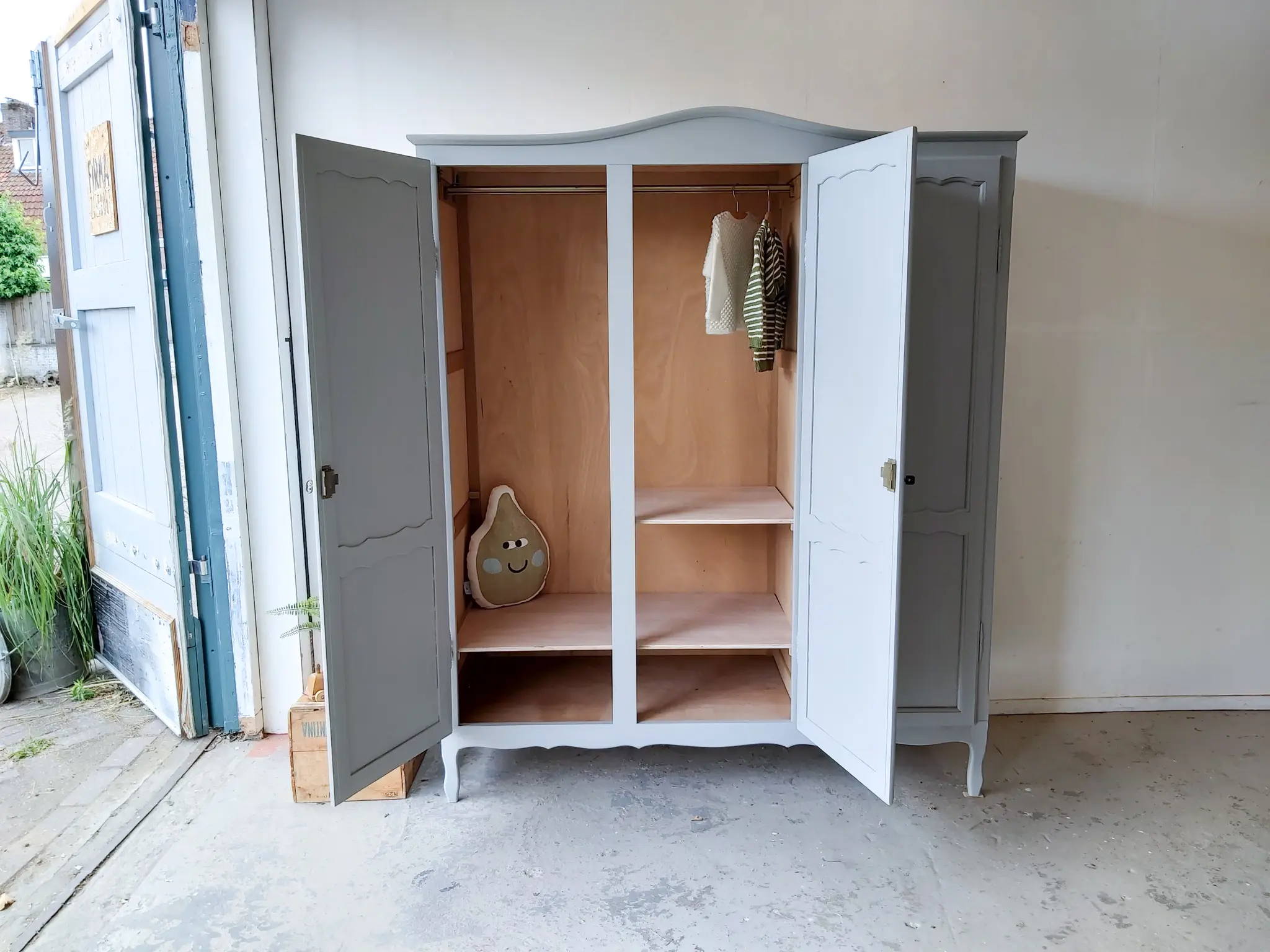 Een prachtige warm grijze sierlijke kast. Achter de linker twee deuren zit een roede, een brede en een smalle plank. En achter het rechter deurtje drie plankjes. Na de grote schoonmaakbeurt, anti houtworm behandeling en de nodige reparaties, hebben we er voor gekozen hem in deze warme grijs te schilderen. Een kleur die we nog niet vast in ons assortiment hebben, maar wellicht wel gaan toevoegen, want wat staat hij prachtig op deze kast! De kast had drie goedwerkende slotjes, maar hij had geen sleutels meer. We vonden drie sleutels die perfect pasten, weliswaar all drie anders, maar dat vonden we juist heel leuk staan. Hij sluit naar behoren. Deze kast is demontabel, dus kan ook gemakkelijk naar boven. Kortom, een ideale ruime kledingkast!