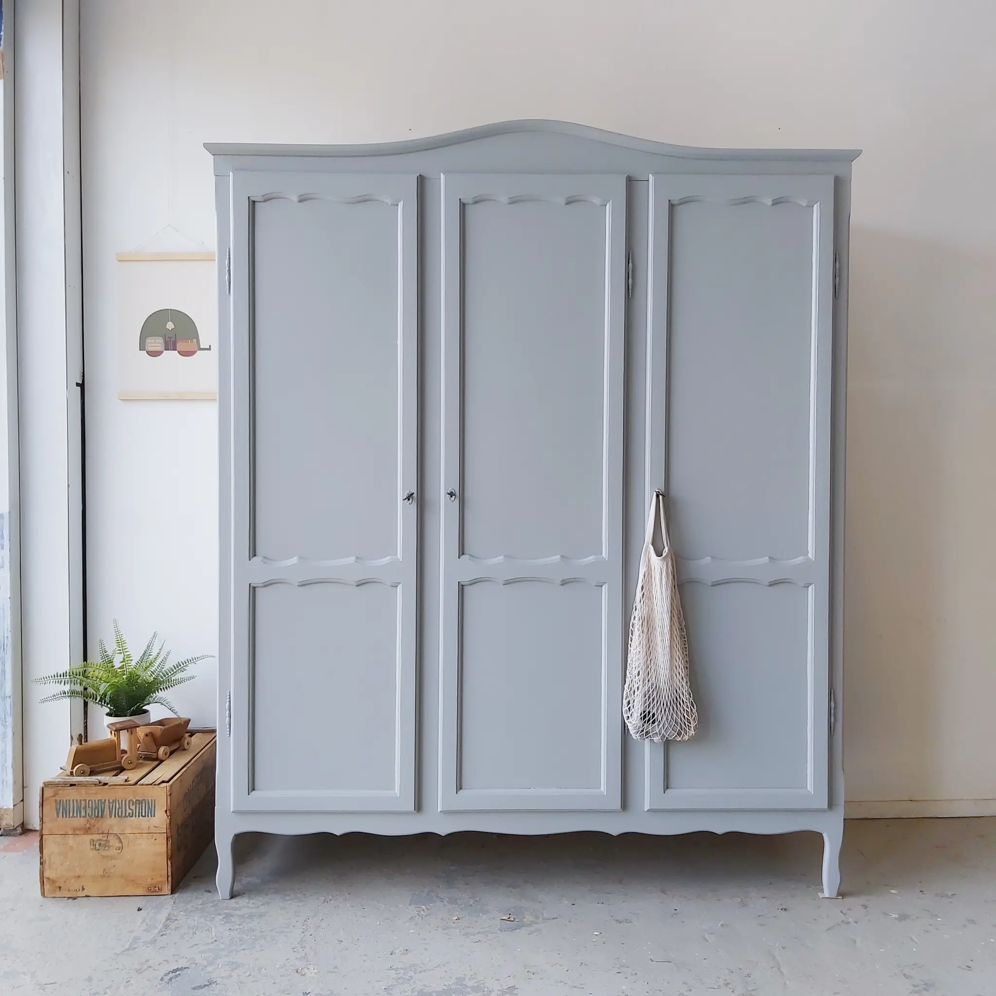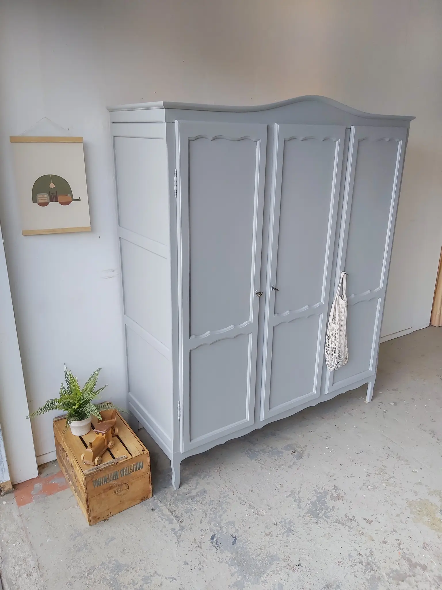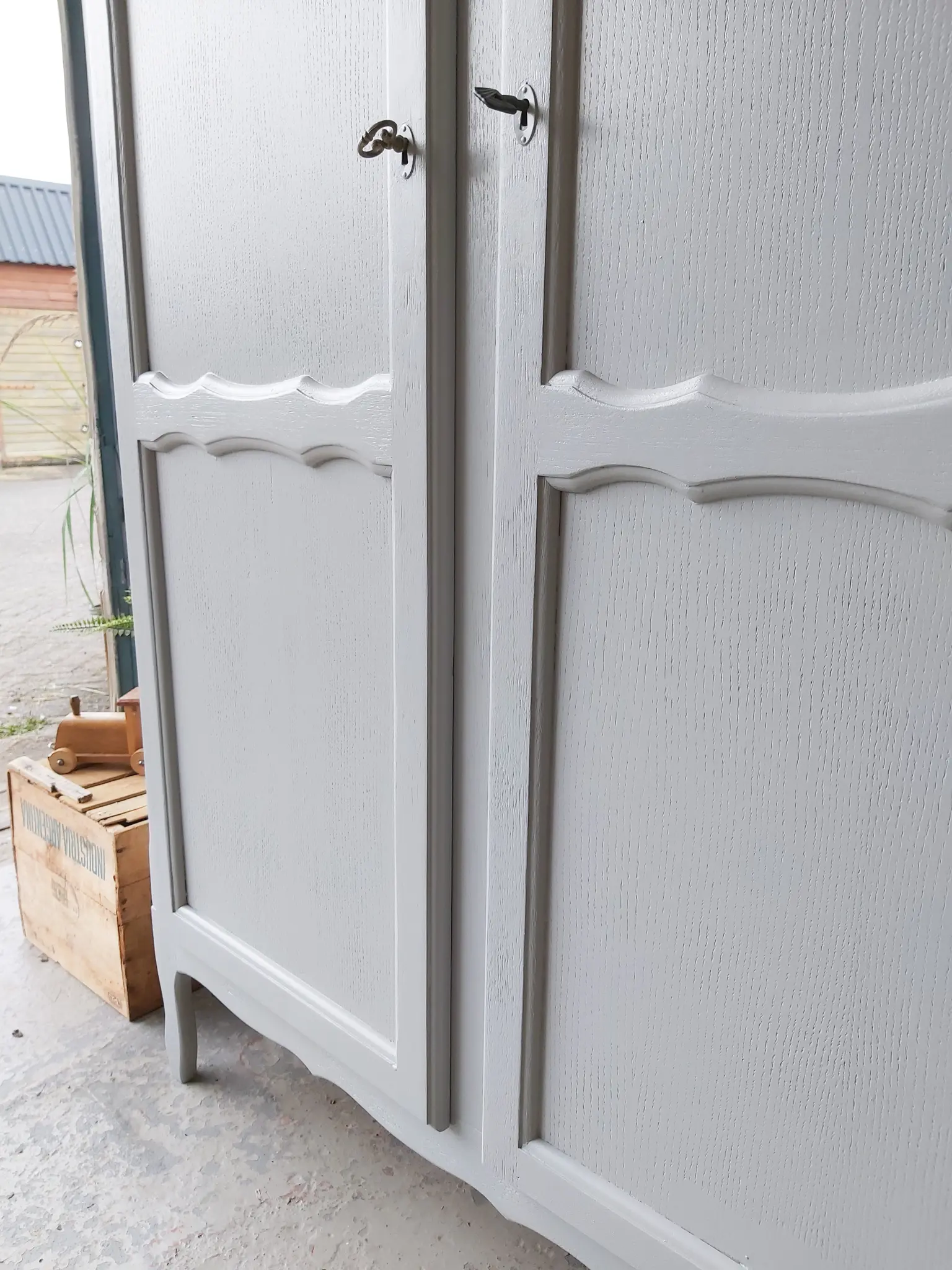 Een prachtige warm grijze sierlijke kast. Achter de linker twee deuren zit een roede, een brede en een smalle plank. En achter het rechter deurtje drie plankjes. Na de grote schoonmaakbeurt, anti houtworm behandeling en de nodige reparaties, hebben we er voor gekozen hem in deze warme grijs te schilderen. Een kleur die we nog niet vast in ons assortiment hebben, maar wellicht wel gaan toevoegen, want wat staat hij prachtig op deze kast! De kast had drie goedwerkende slotjes, maar hij had geen sleutels meer. We vonden drie sleutels die perfect pasten, weliswaar all drie anders, maar dat vonden we juist heel leuk staan. Hij sluit naar behoren. Deze kast is demontabel, dus kan ook gemakkelijk naar boven. Kortom, een ideale ruime kledingkast!