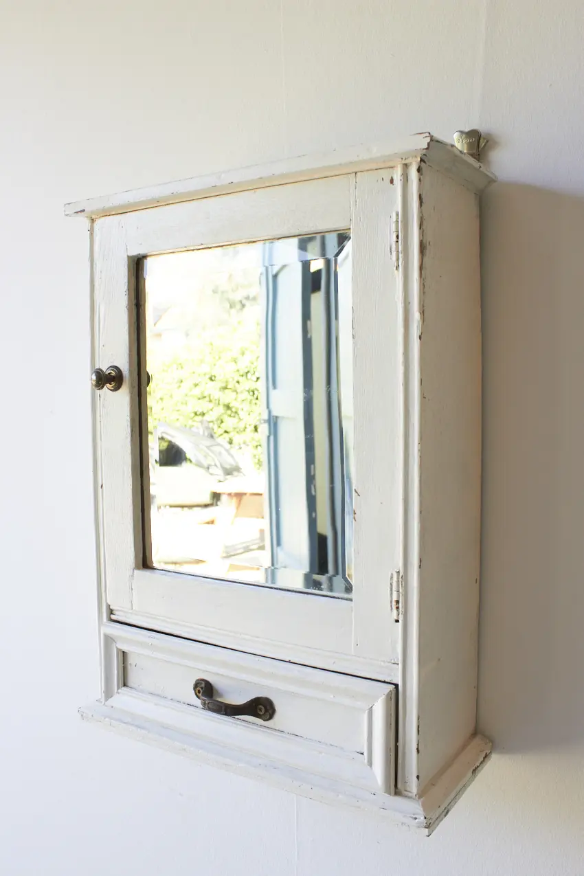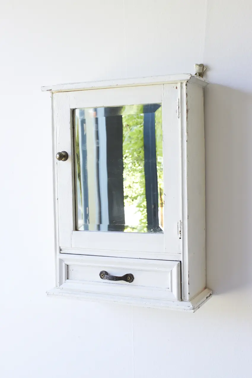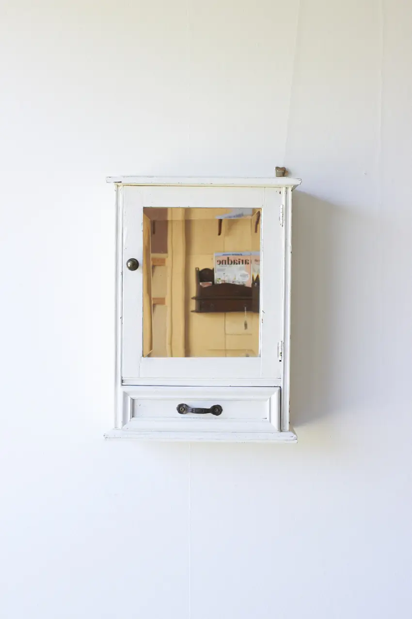 Dit witte hangkastje heeft een oud spiegeltje. Het kastje is goed schoongemaakt en behandeld tegen houtworm. En nu is hij weer helemaal klaar voor een nieuwe plek!
