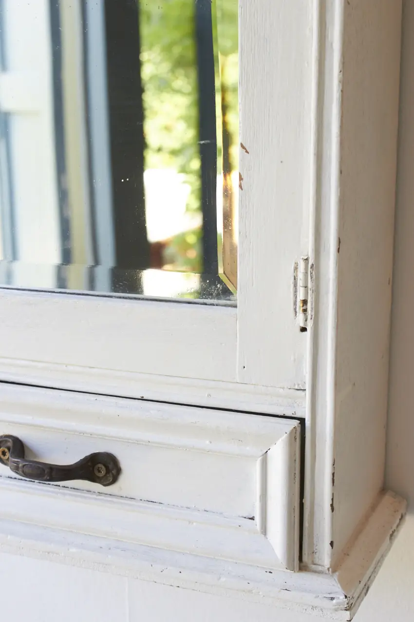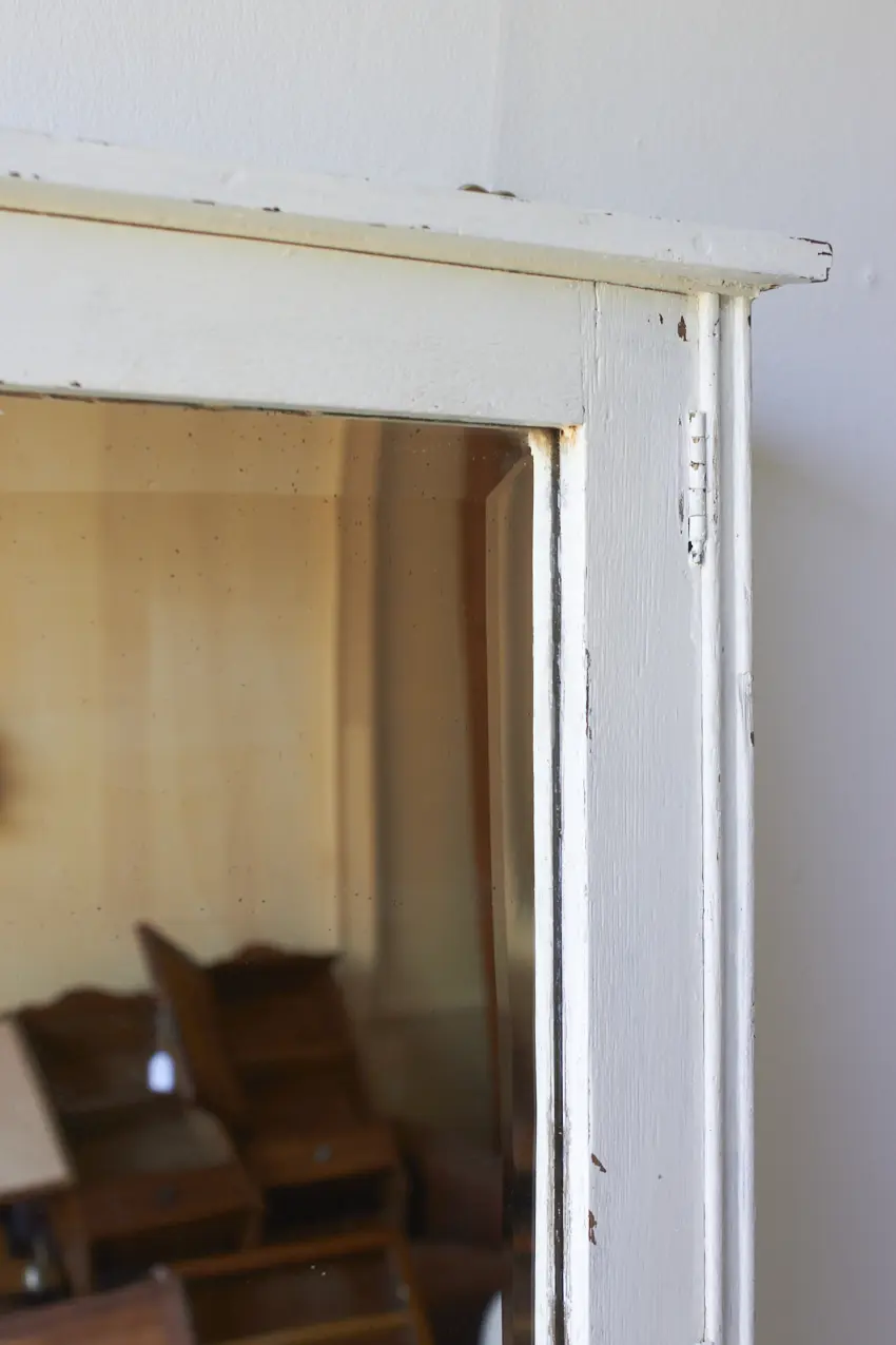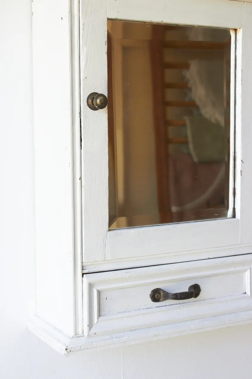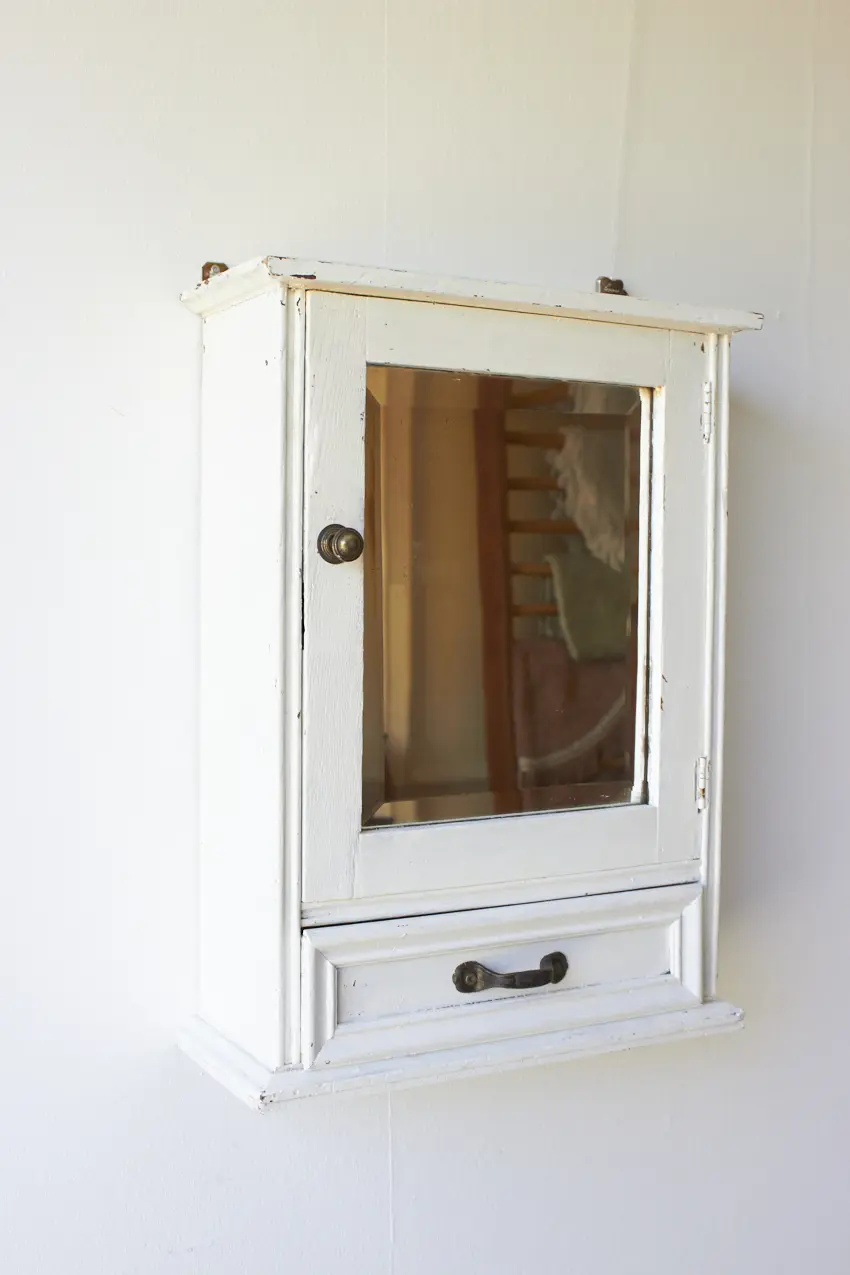 Dit witte hangkastje heeft een oud spiegeltje. Het kastje is goed schoongemaakt en behandeld tegen houtworm. En nu is hij weer helemaal klaar voor een nieuwe plek!