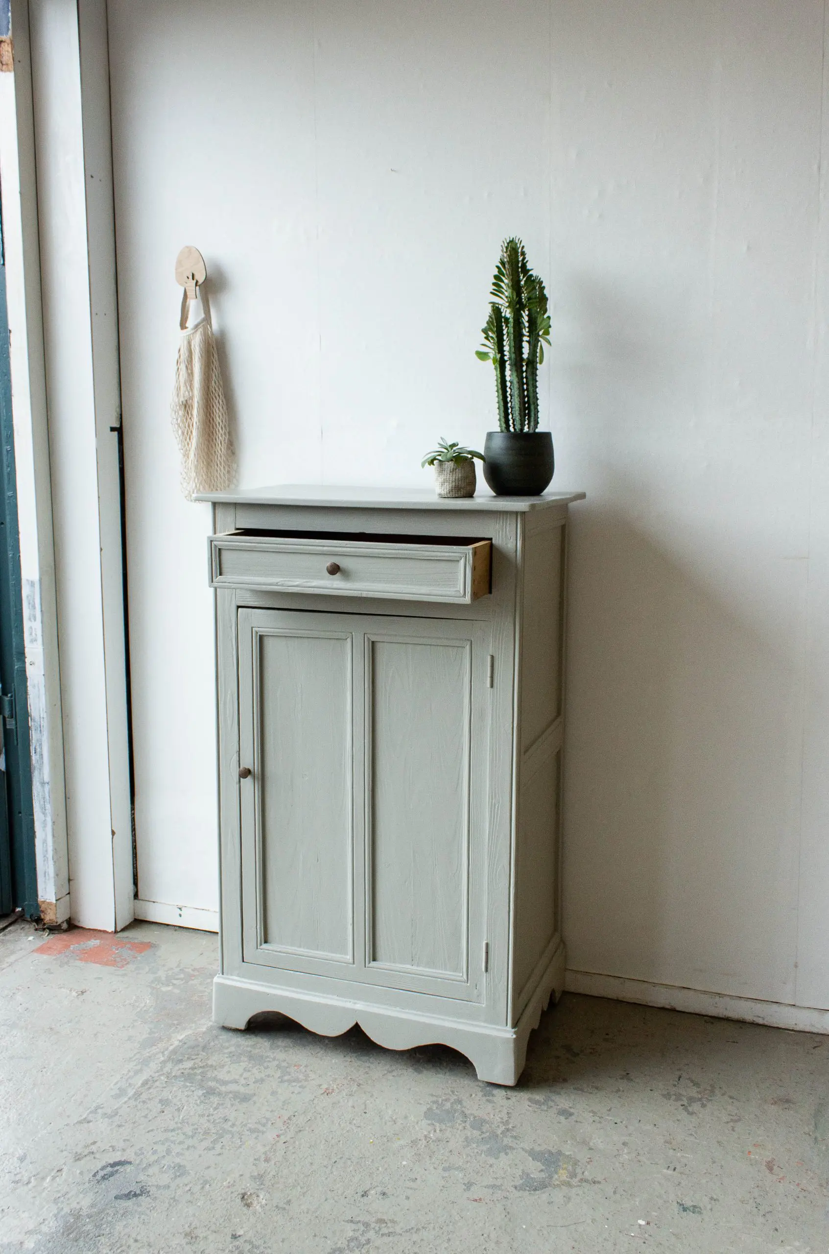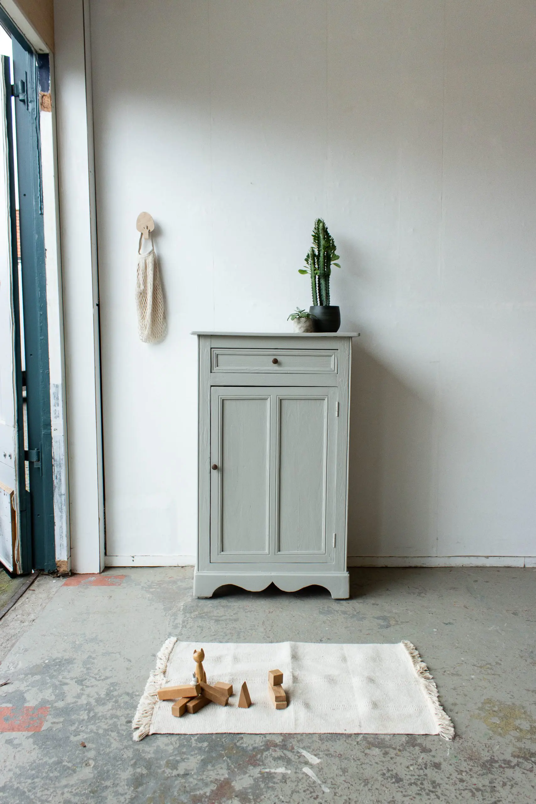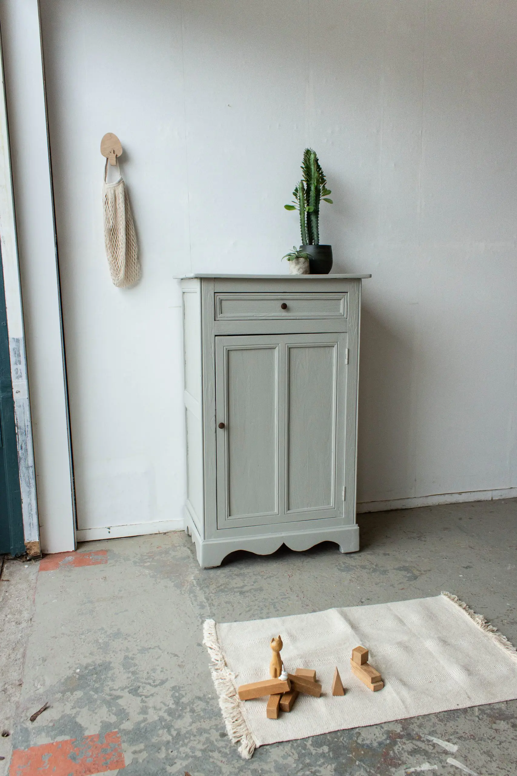 Wat een lief, klein kastje is dit! We hebben dit Franse kastje eerst laten zandstralen, waarmee de vorige vernislaag volledig verwijderd is. Daarna is hij helemaal nagelopen, schoongemaakt en in deze lieve zachtgrijze kleur geschilderd. Op het deurtje en laatje zijn tot slot mooie knopjes van brons gezet. Een mooi, klein kastje voor op de kinderkamer. Leuk om speelgoedjes of boekjes in op te bergen bijvoorbeeld.