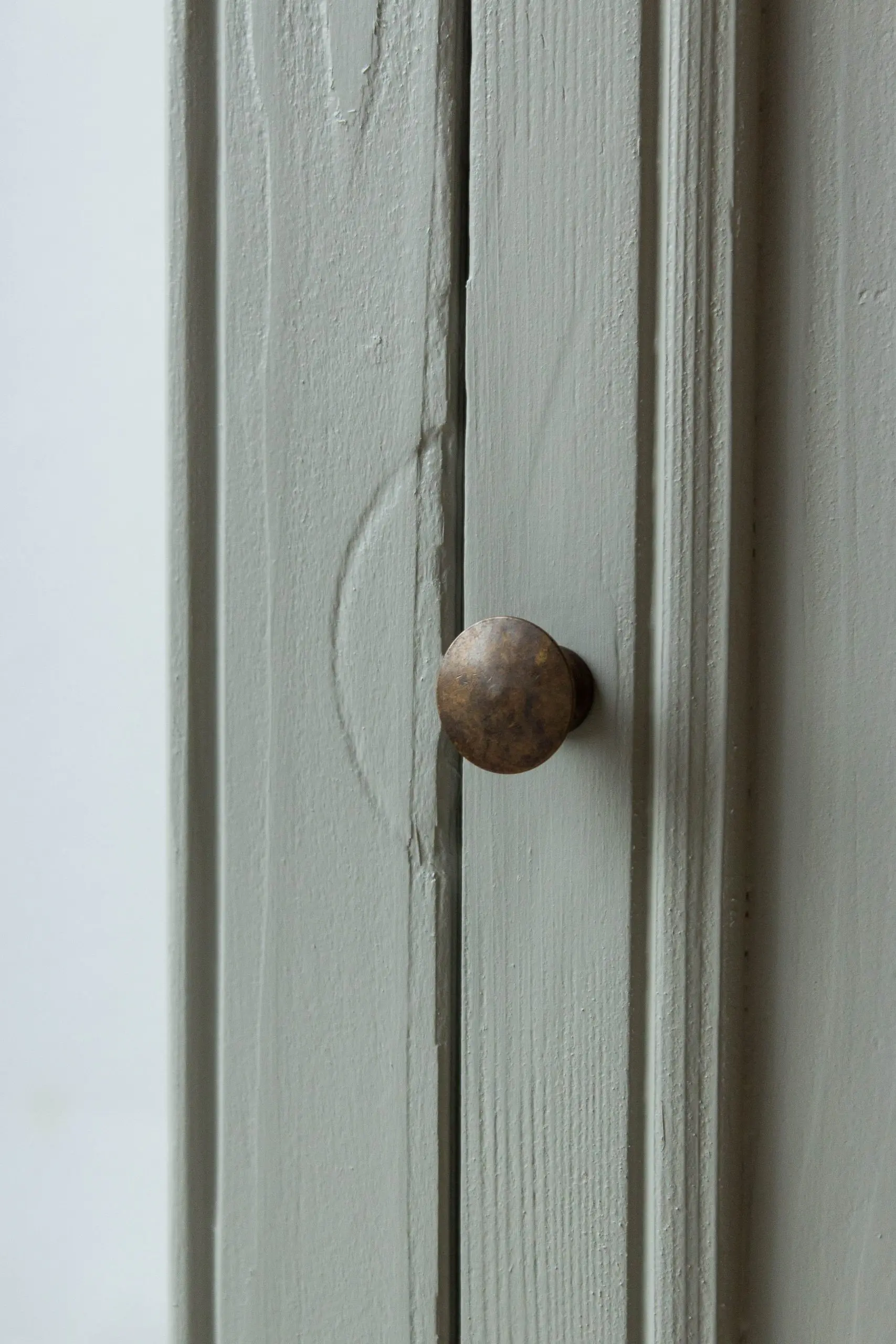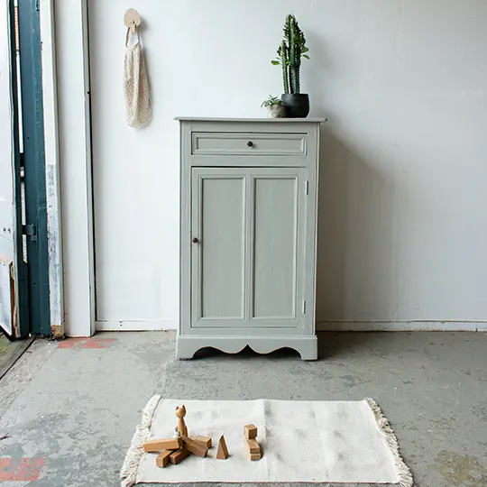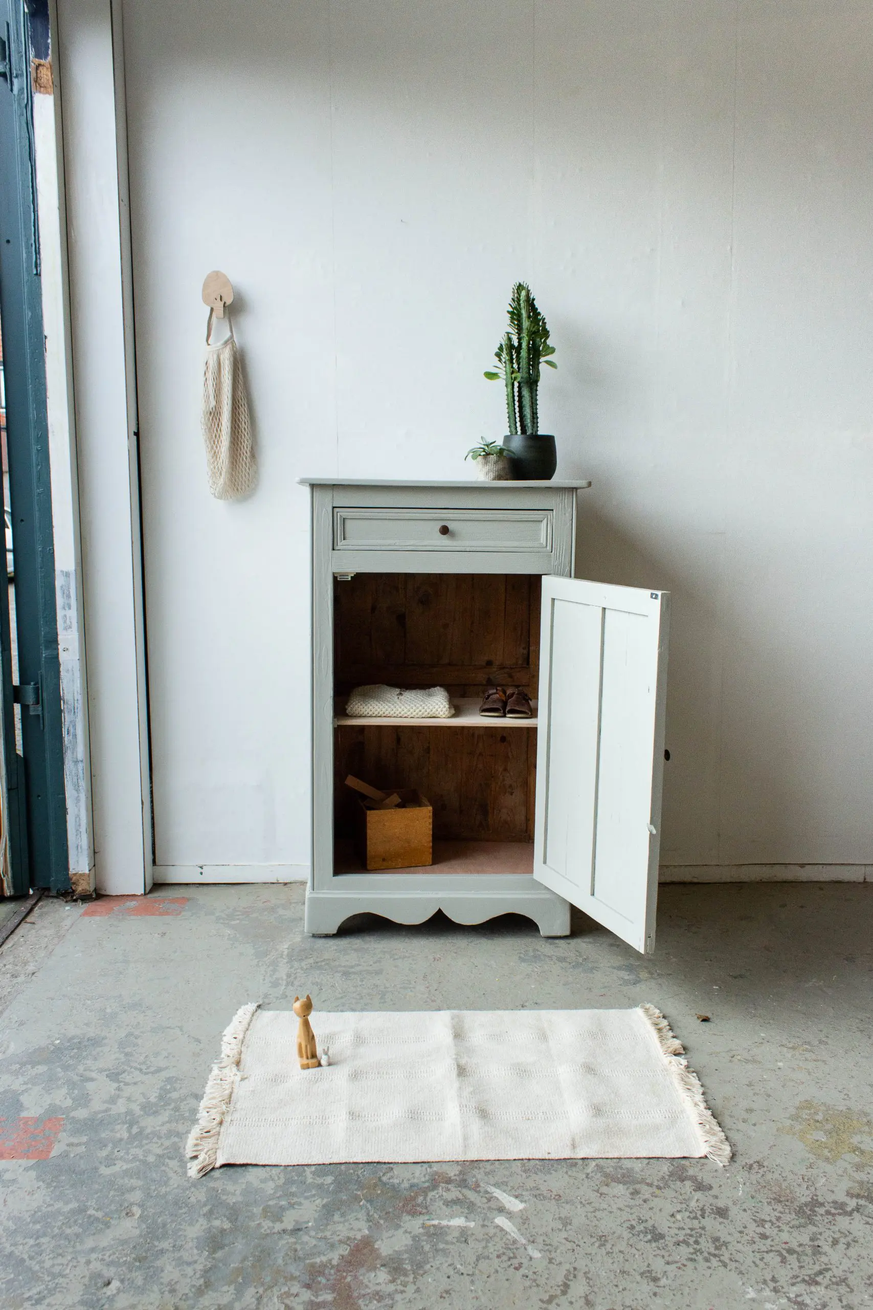 Wat een lief, klein kastje is dit! We hebben dit Franse kastje eerst laten zandstralen, waarmee de vorige vernislaag volledig verwijderd is. Daarna is hij helemaal nagelopen, schoongemaakt en in deze lieve zachtgrijze kleur geschilderd. Op het deurtje en laatje zijn tot slot mooie knopjes van brons gezet. Een mooi, klein kastje voor op de kinderkamer. Leuk om speelgoedjes of boekjes in op te bergen bijvoorbeeld.