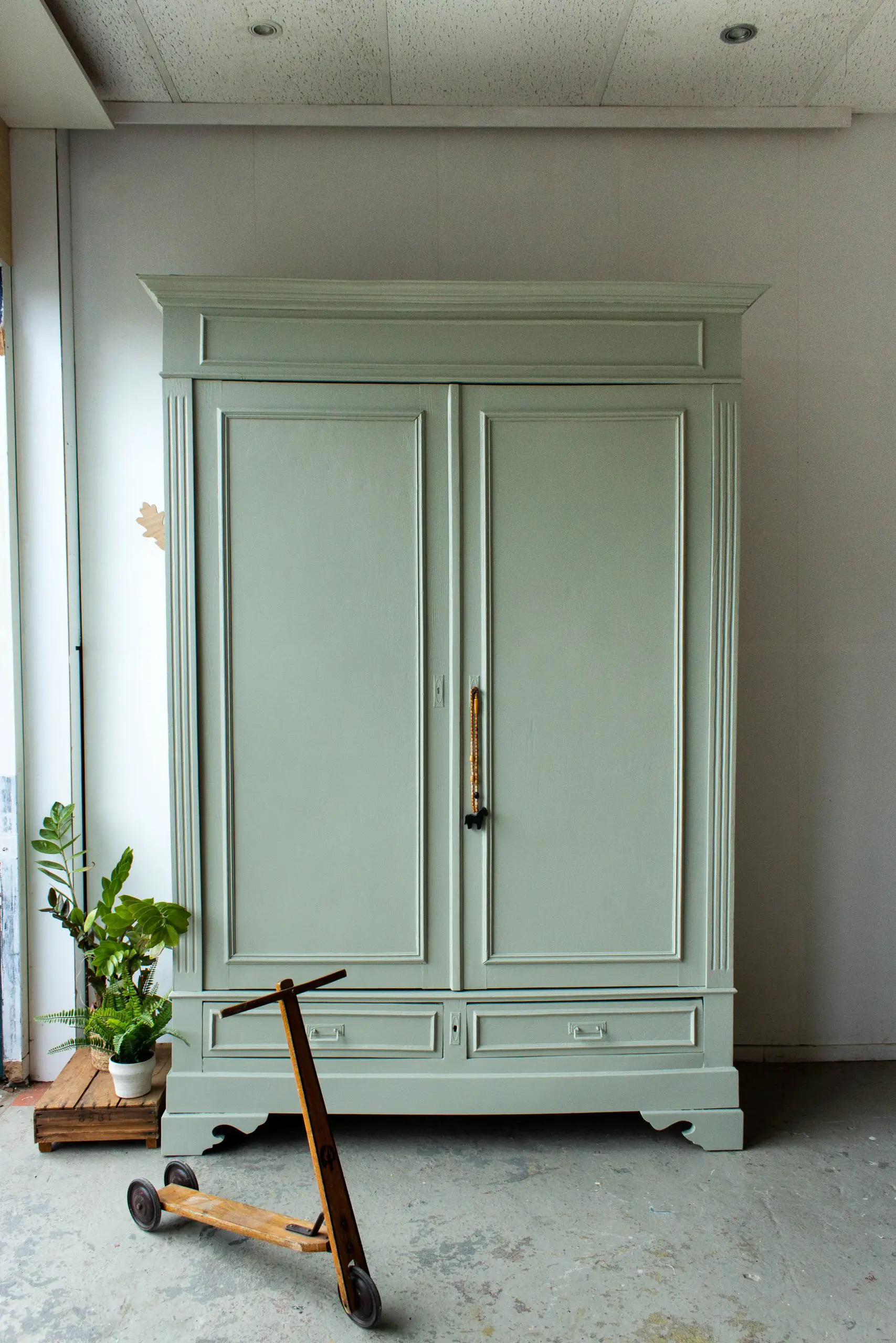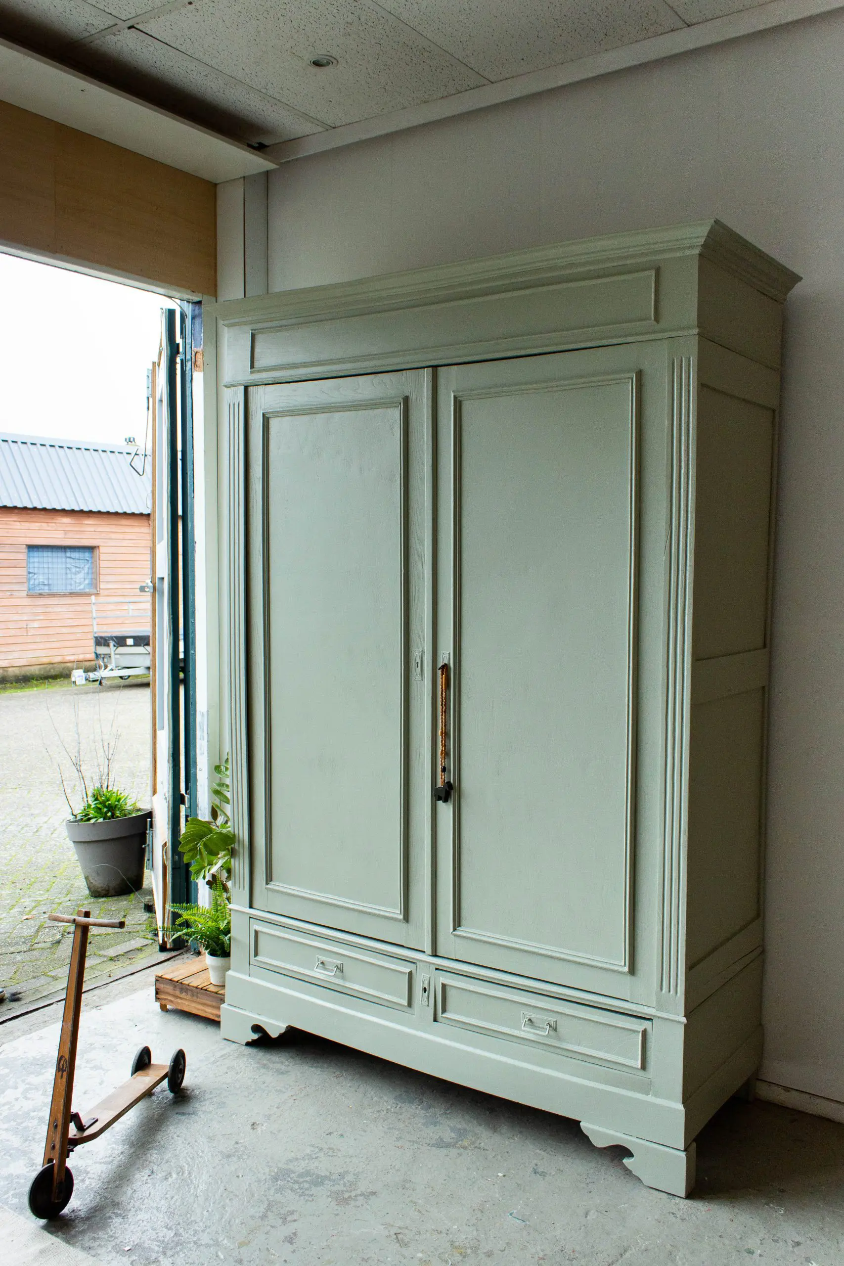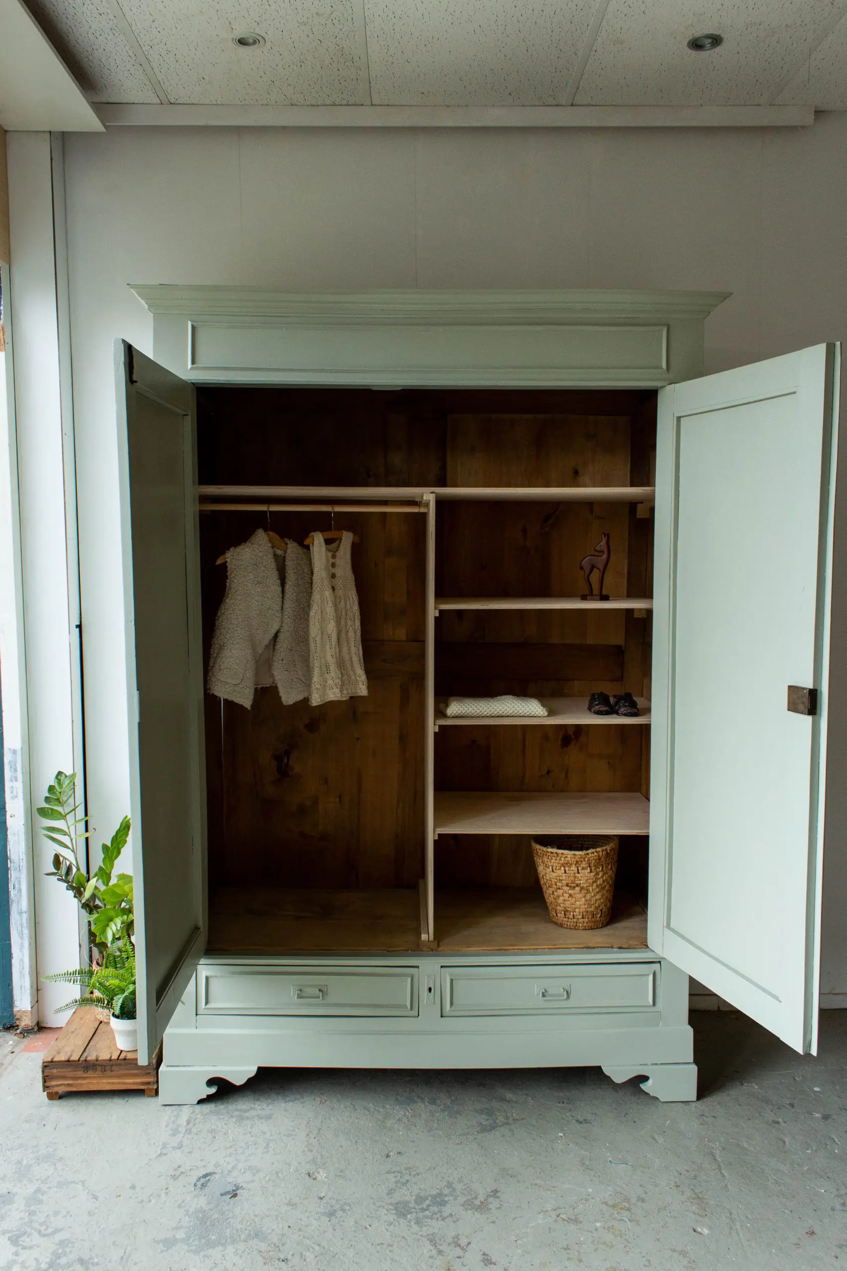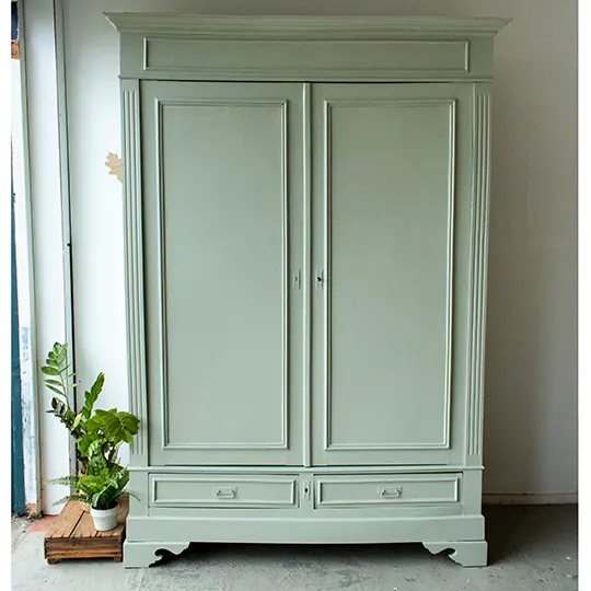 Een prachtige, demontabele kledingkast uit Frankrijk. We hebben deze vintage kast weer helemaal stevig gemaakt, en de deuren en laden weer soepel laten openen en sluiten. Ook hebben we hem een nieuwe indeling gegeven. En nu biedt de sierlijke kast voldoende ruimte voor zowel hangkleding als legkleding. Ideaal dus! We vonden dat hij wel een lieve, zachte kleur kon gebruiken en hebben hem daarom in deze warme zachtgroene kleur geschilderd. De originele sleutel zat er nog mee, dus hiermee is de kast eenvoudig te openen en sluiten. Wat ons betreft een geweldige, ruime kast voor op de kinderkamer. En de kast is demontabel, dus hij kan met gemak op een bovenverdieping geplaatst worden.