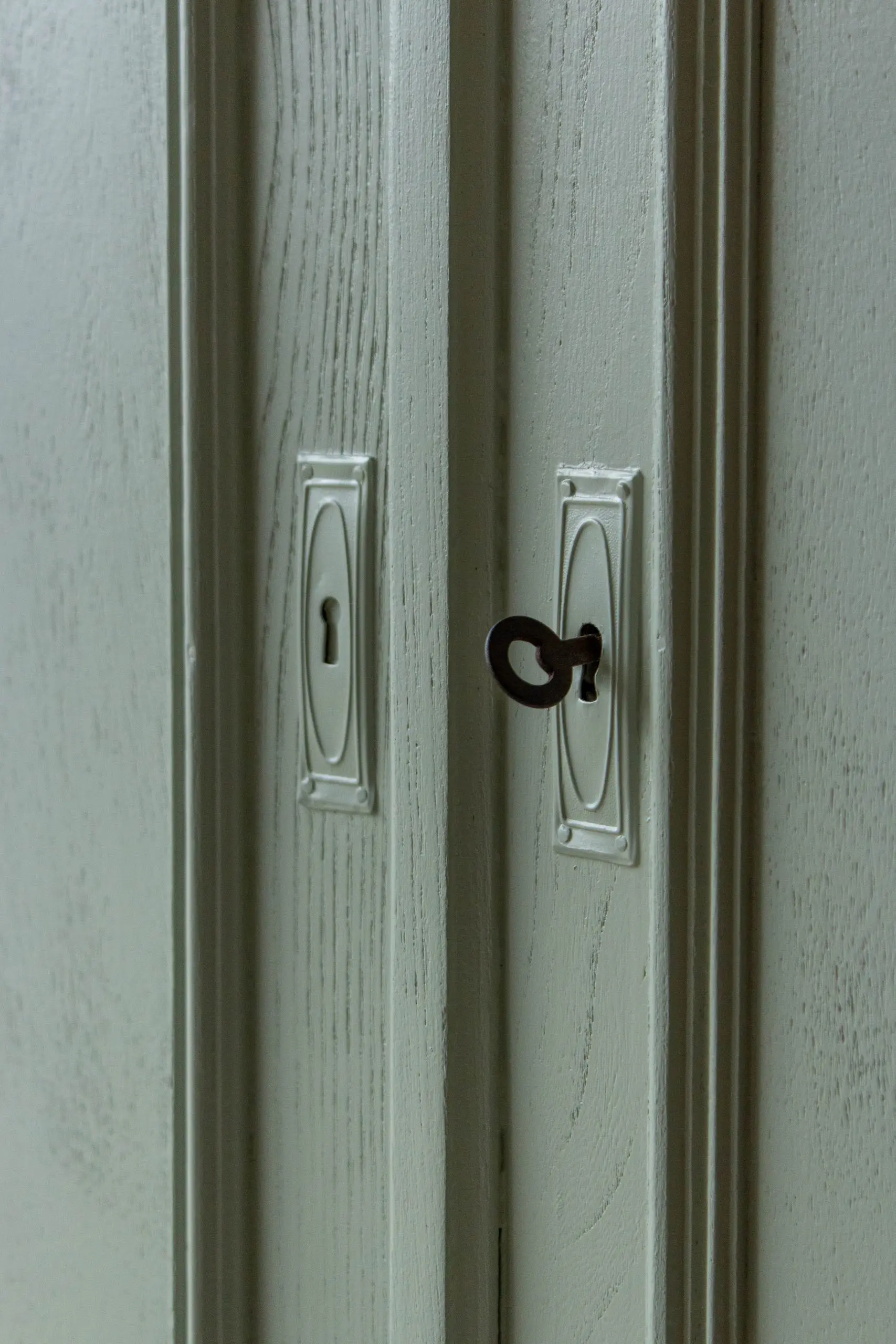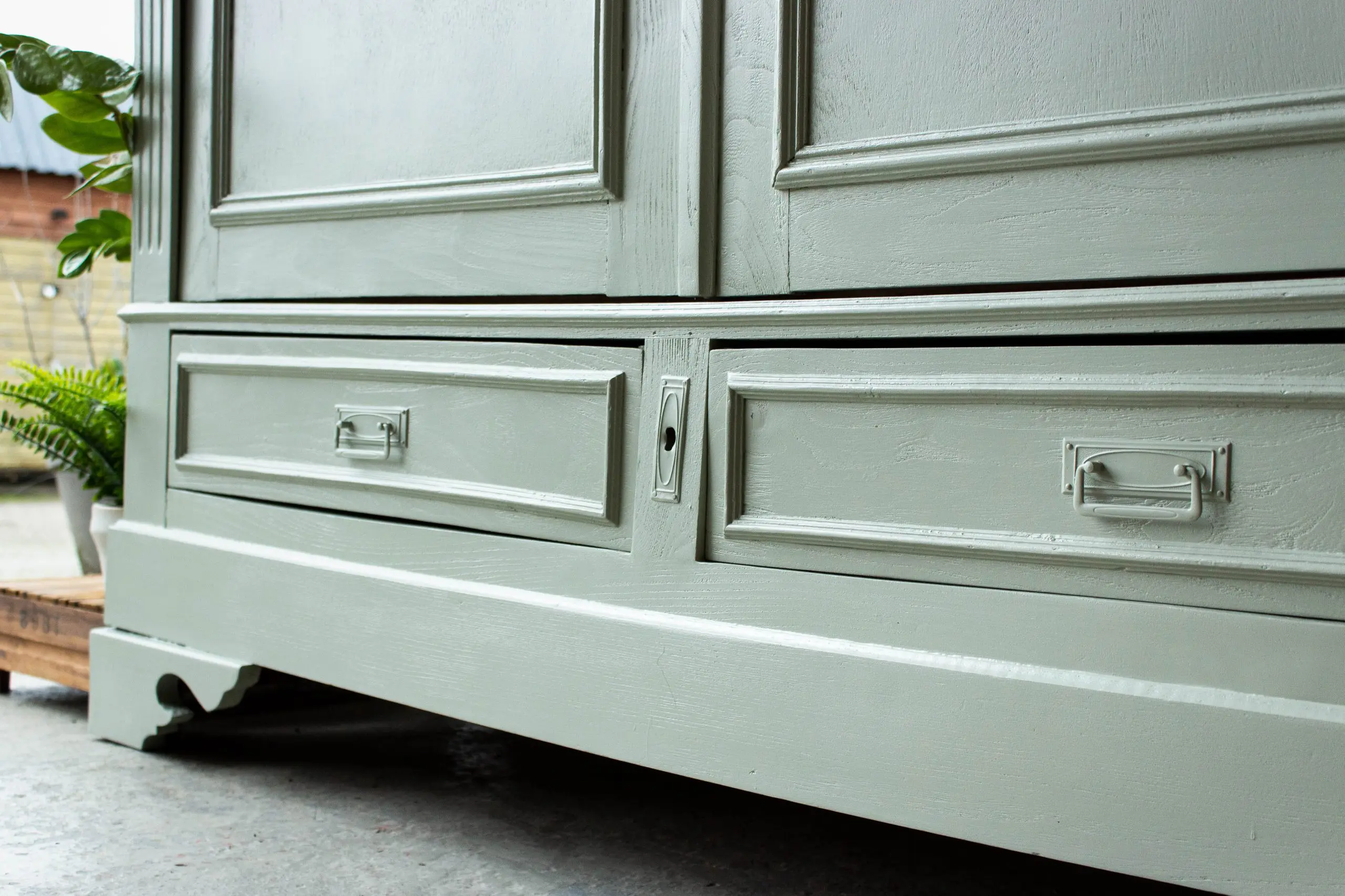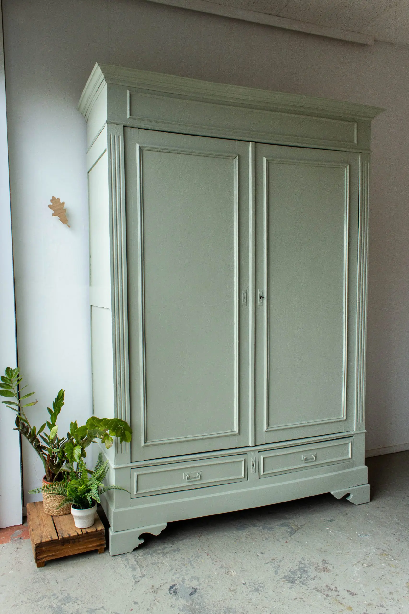 Een prachtige, demontabele kledingkast uit Frankrijk. We hebben deze vintage kast weer helemaal stevig gemaakt, en de deuren en laden weer soepel laten openen en sluiten. Ook hebben we hem een nieuwe indeling gegeven. En nu biedt de sierlijke kast voldoende ruimte voor zowel hangkleding als legkleding. Ideaal dus! We vonden dat hij wel een lieve, zachte kleur kon gebruiken en hebben hem daarom in deze warme zachtgroene kleur geschilderd. De originele sleutel zat er nog mee, dus hiermee is de kast eenvoudig te openen en sluiten. Wat ons betreft een geweldige, ruime kast voor op de kinderkamer. En de kast is demontabel, dus hij kan met gemak op een bovenverdieping geplaatst worden.