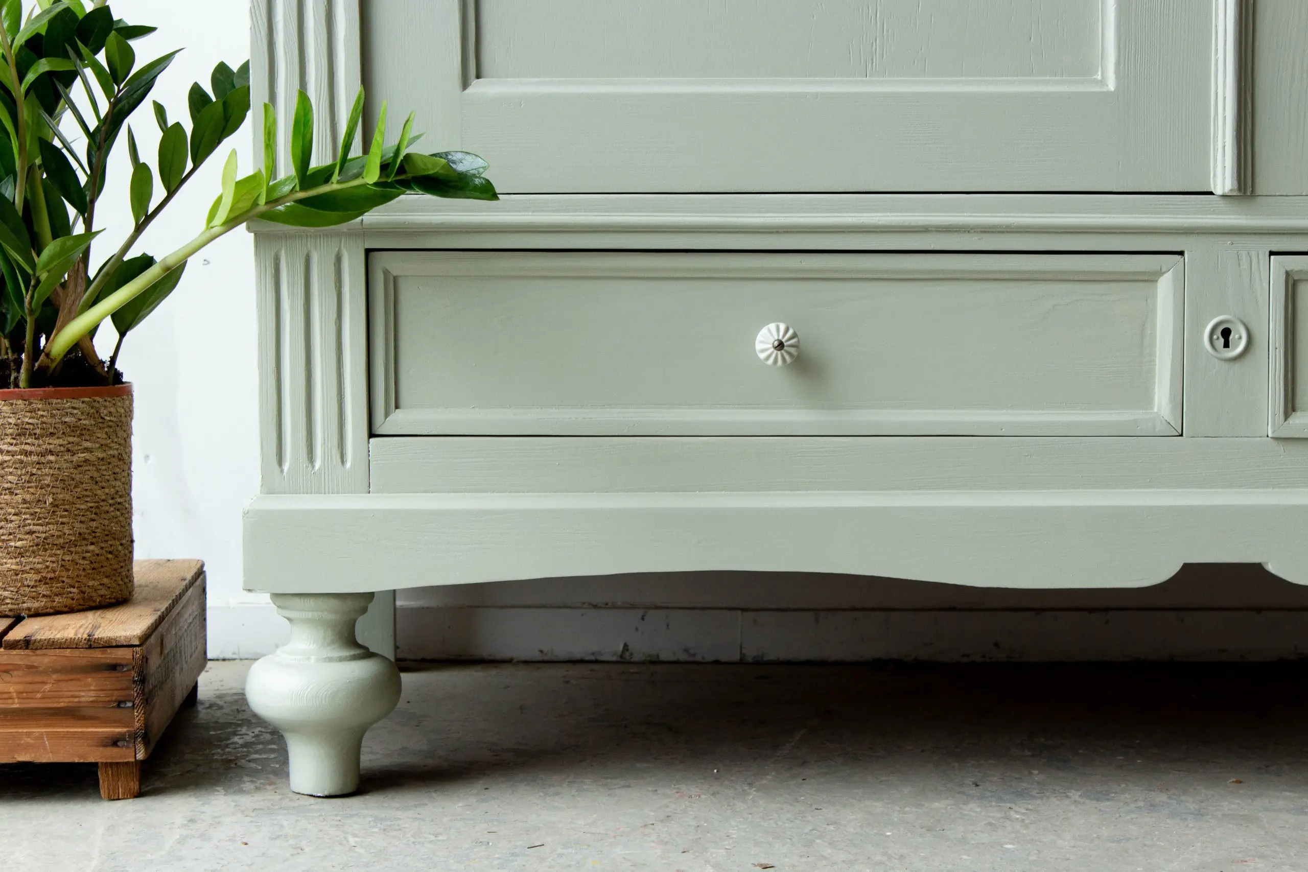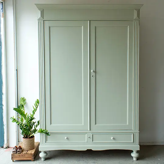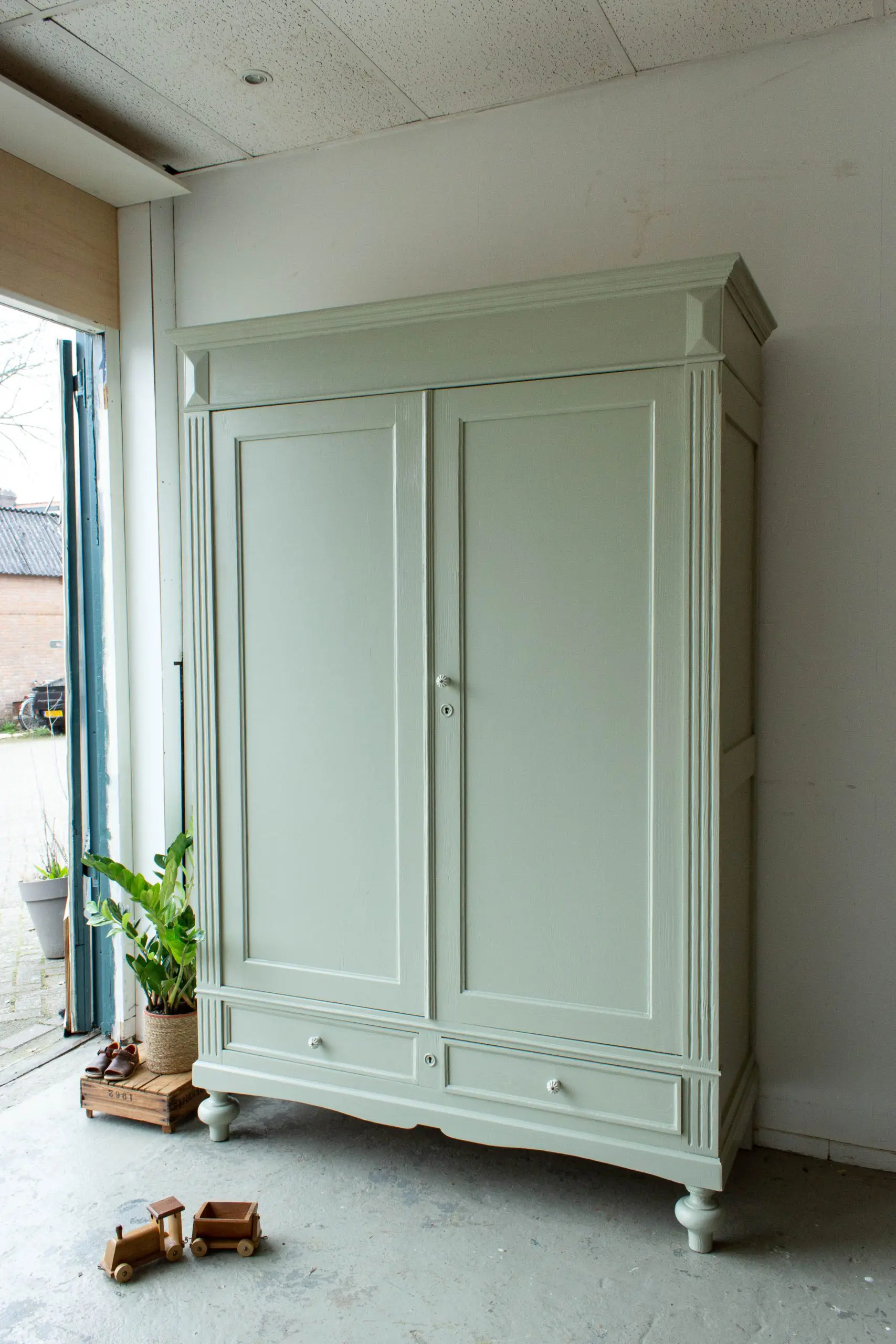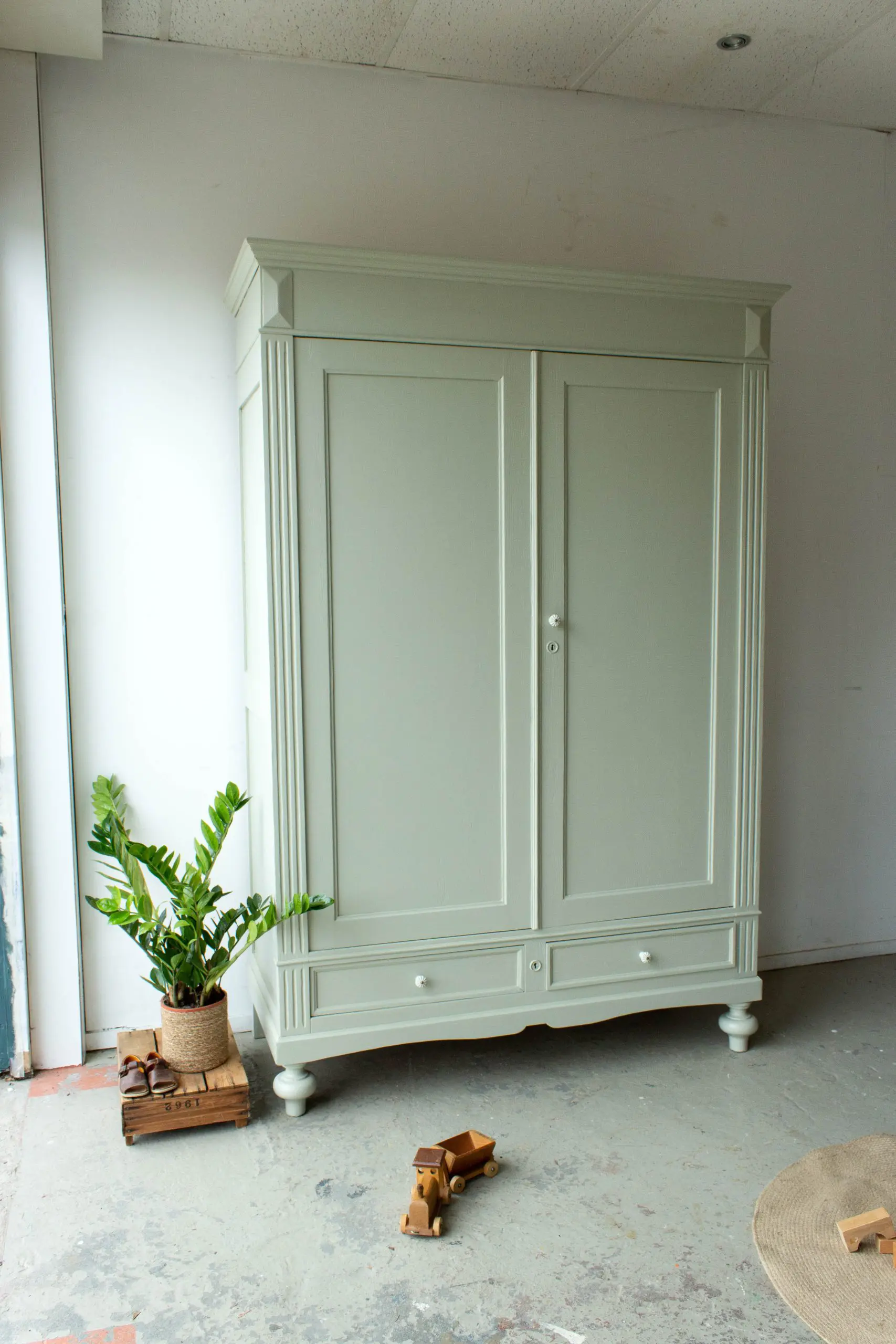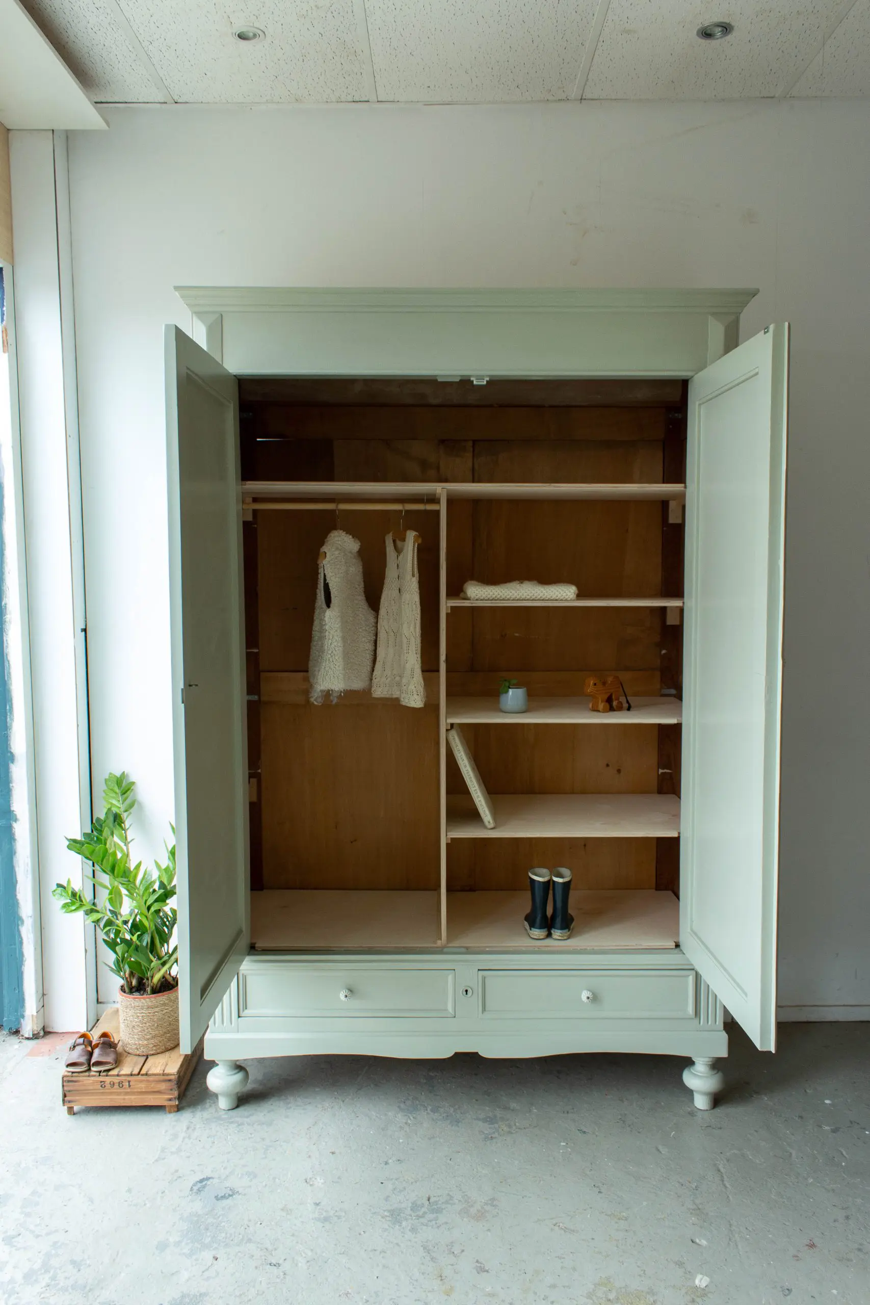 Deze prachtige, vintage kledingkast komt uit Noord Frankrijk. Toen we de kast binnenkregen, zaten er in de twee deuren grote spiegels. Heel mooi, maar de kast leek ons nóg mooier zonder spiegels. Dus nadat hij helemaal kaal gestraald en schoongemaakt was, hebben we de deuren voorzien van nieuwe houten panelen. Daarna hebben we hem een mooie indeling gegeven: met links ruimte om kleding op te hangen en rechts ruimte voor legkleding. We vonden dat deze grote kast wel een rustig kleurtje kon gebruiken en hebben hem daarom in een zachtgroene kleur geschilderd. Op de rechter deur en de twee laden onderin zijn tot slot klassieke knopjes van porselein gezet. De linker deur sluit met een haakje, rechts hebben we een magneetje geplaatst. En zo is deze ruime, demontabele kledingkast weer helemaal klaar voor gebruik. Een prachtige kast om heel veel kinderkleding in op te bergen!