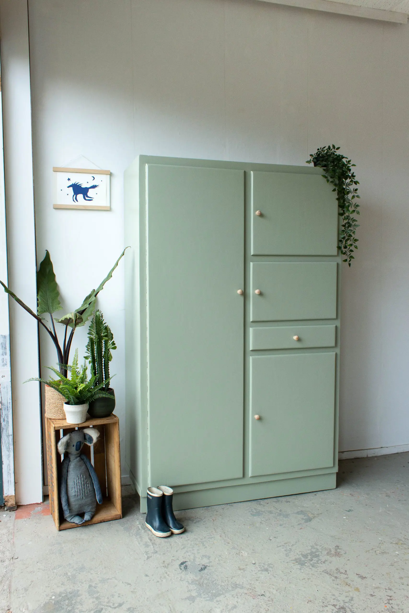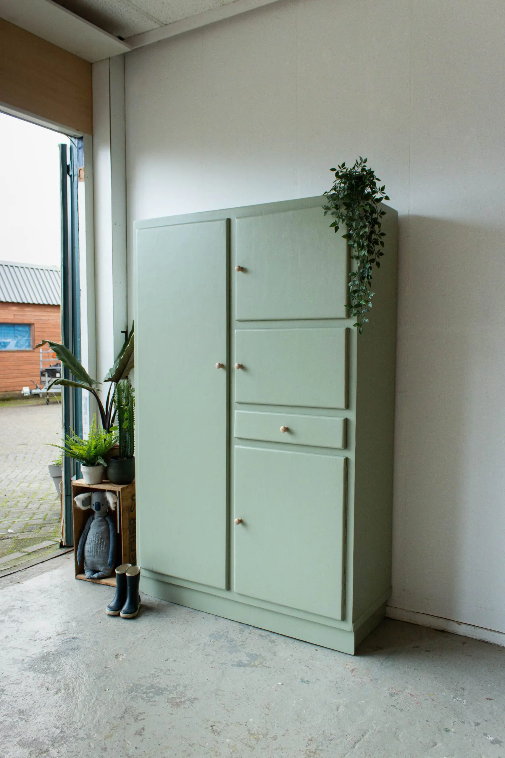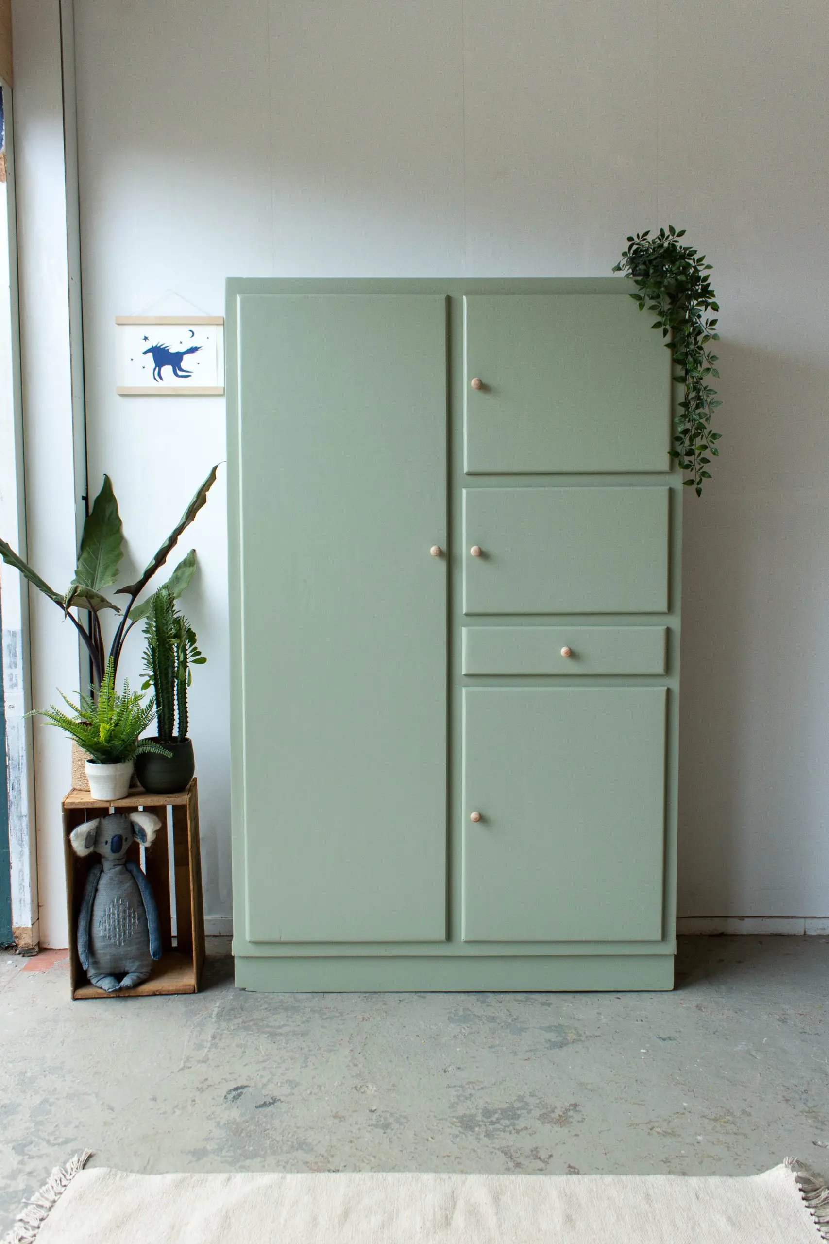 Wat een geweldige retro kledingkast is dit! In de jaren zestig werden dit soort kasten in de keuken als voorraadkast gebruikt. Maar wij hebben hem omgetoverd tot een prachtige kledingkast! Na de schoonmaakbeurt en de nodige reparaties, hebben we de kast voorzien van en nieuwe indeling, met links een roede en daarboven en onder planken. Nu biedt de kast volop ruimte voor alle kleding van je kleine. Daarna is hij in deze zachtgroene kleur geschilderd. Tot slot zijn er mooie beukenhouten knopjes op alle deuren en het laatje gezet. De deurtjes sluiten door middel van magneetjes. Wat ons betreft een prachtige, originele kast voor op de kinderkamer!