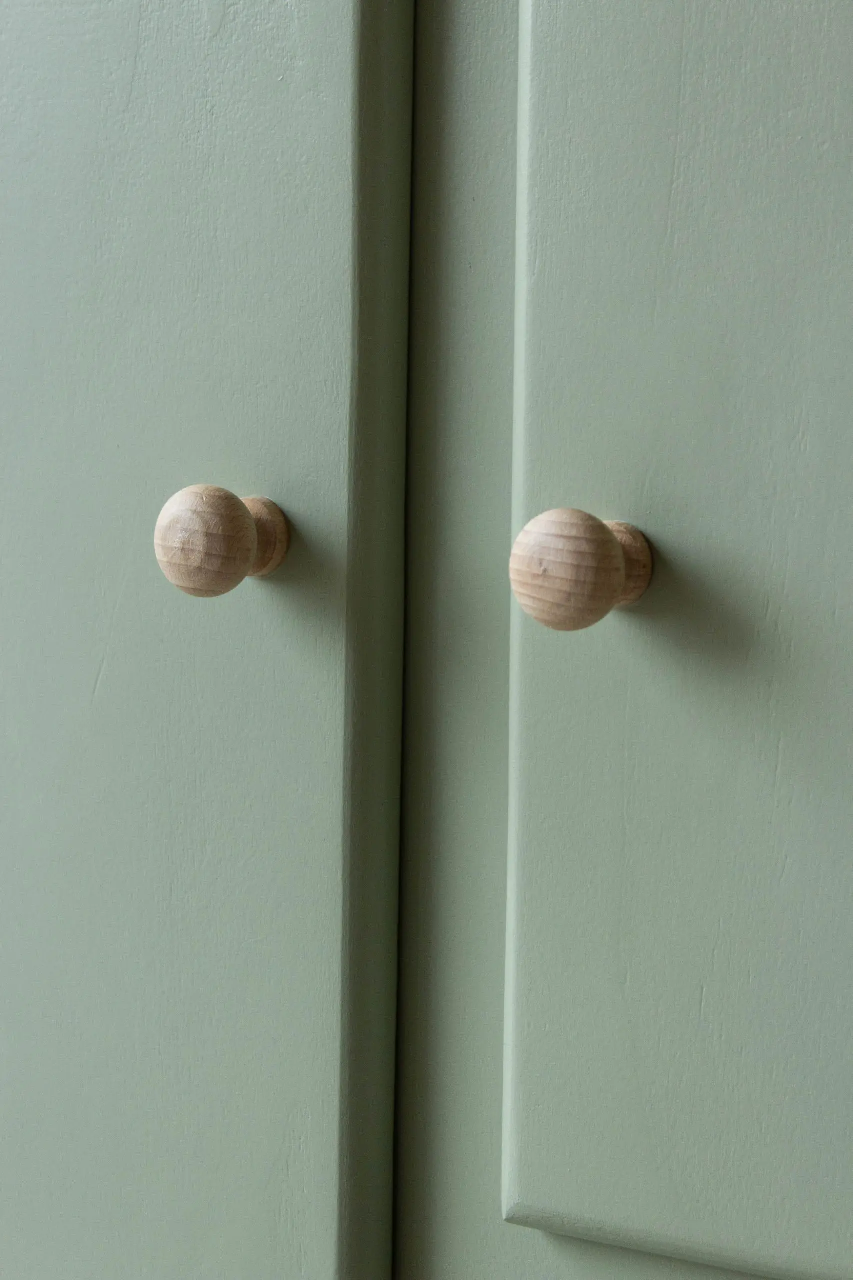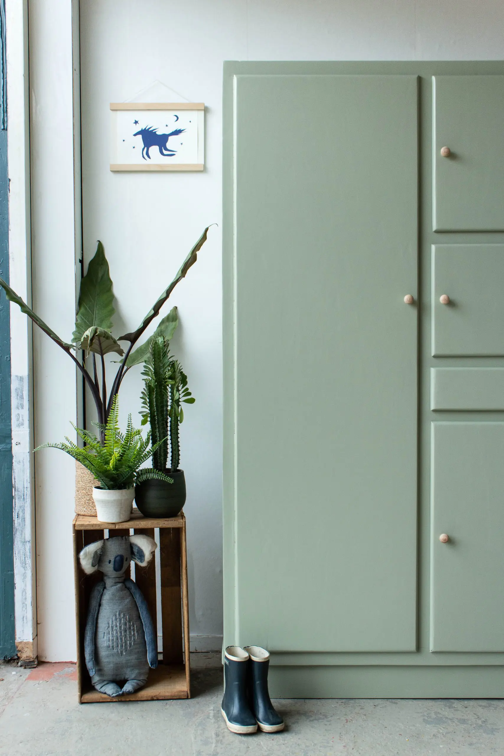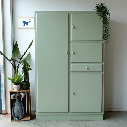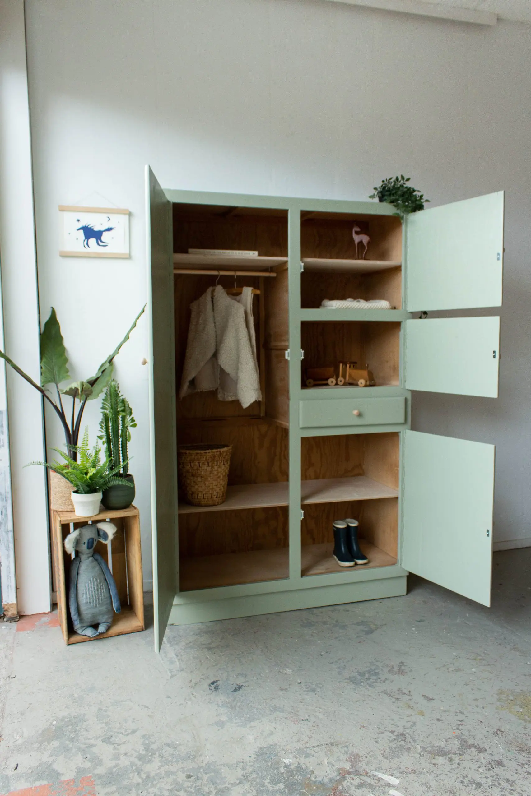 Wat een geweldige retro kledingkast is dit! In de jaren zestig werden dit soort kasten in de keuken als voorraadkast gebruikt. Maar wij hebben hem omgetoverd tot een prachtige kledingkast! Na de schoonmaakbeurt en de nodige reparaties, hebben we de kast voorzien van en nieuwe indeling, met links een roede en daarboven en onder planken. Nu biedt de kast volop ruimte voor alle kleding van je kleine. Daarna is hij in deze zachtgroene kleur geschilderd. Tot slot zijn er mooie beukenhouten knopjes op alle deuren en het laatje gezet. De deurtjes sluiten door middel van magneetjes. Wat ons betreft een prachtige, originele kast voor op de kinderkamer!
