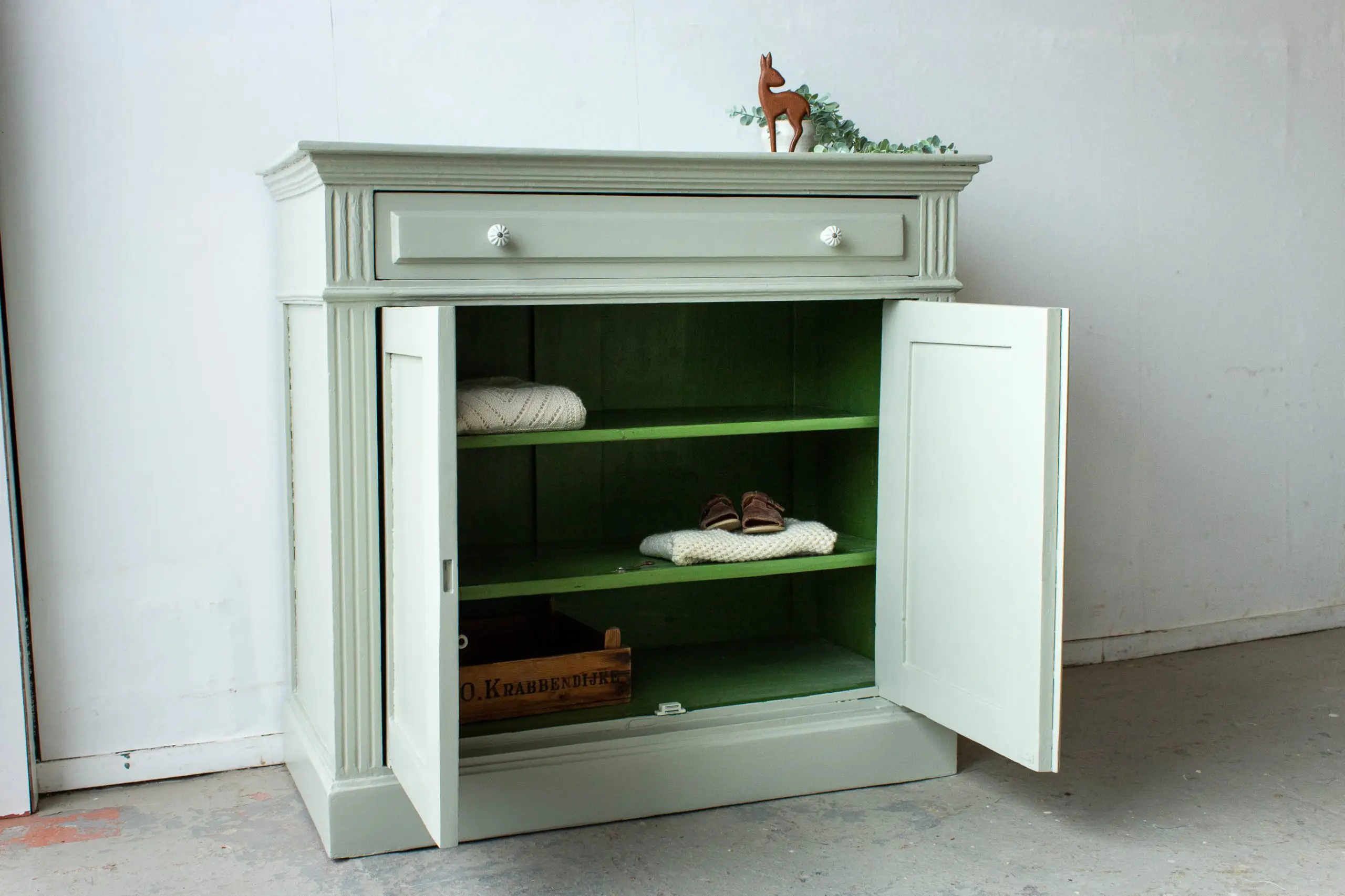 Een prachtige sierlijke commode uit Noord Frankrijk. Wij hebben hem in onze werkplaats grondig schoongemaakt en helemaal nagelopen. De binnenkant had een mooie frisgroene kleur, dus voor de buitenkant hebben we gezocht naar een kleur die mooi bij de binnenkant past. Het is deze zachtgroene kleur ‘voorjaar’ geworden. De deuren sluiten door middel van een haakje en een magneetje. Tot slot zijn er op de brede la en de rechterdeur sierlijke knopjes van porselein gezet. En zo is deze mooie vintage commode klaar om te schitteren op een lieve babykamer.