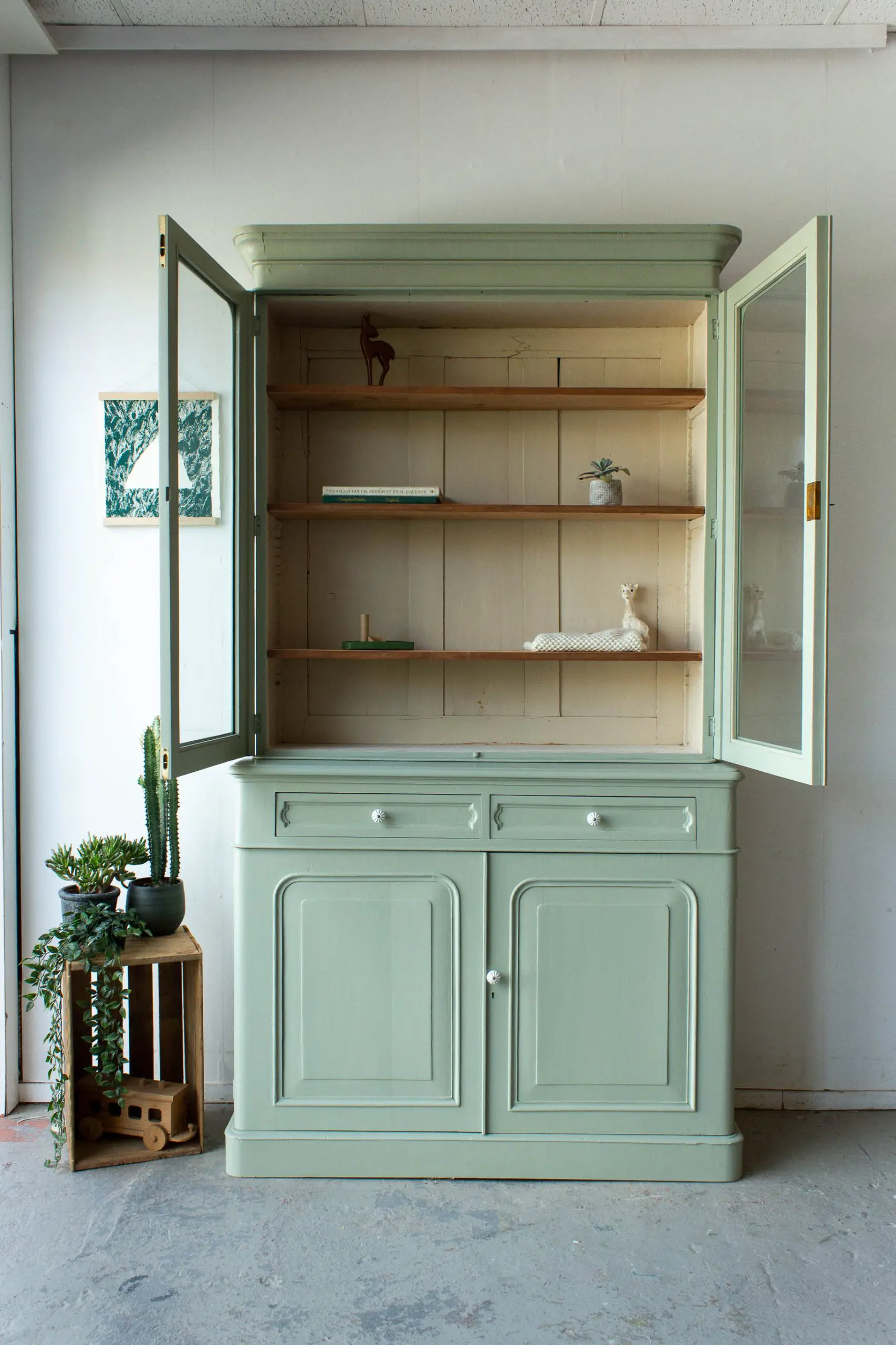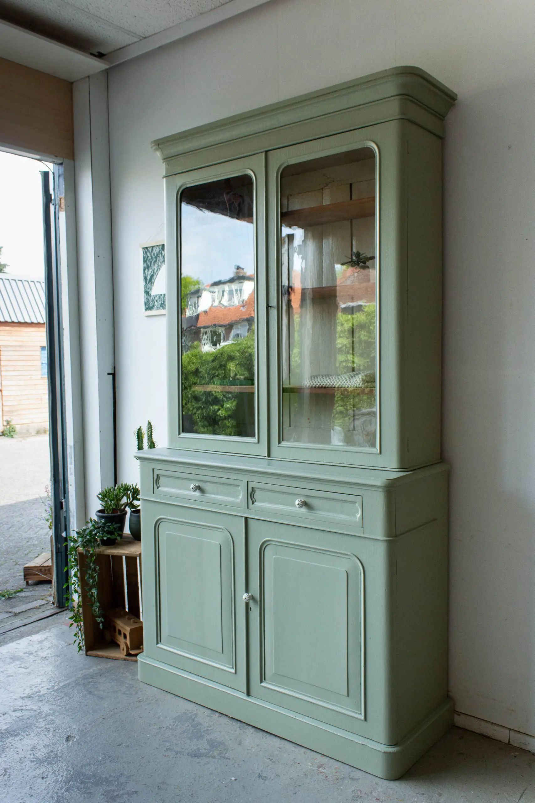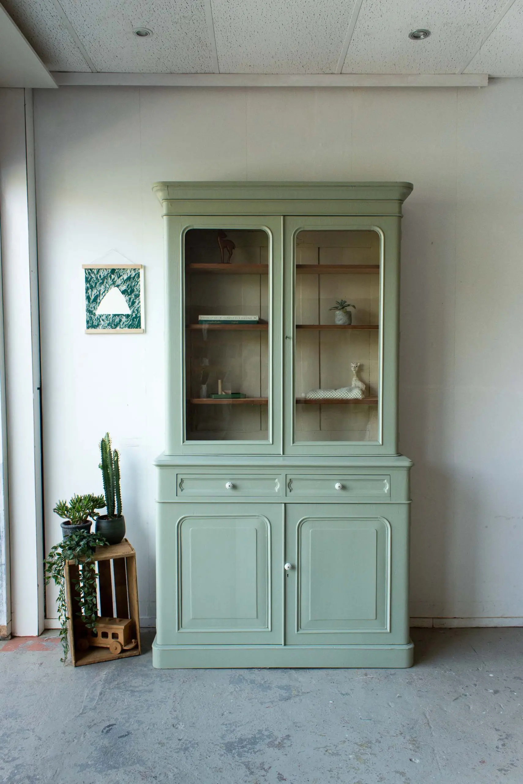 Een prachtige tweedelige buffetkast uit Noord Frankrijk. Deze vintage kast zag er een beetje oubollig uit toen we hem binnen kregen. Maar aan de prachtige vormen en ronde hoeken, zagen we dat hij heel mooi kon worden. Na de grote schoonmaakbeurt, is de kast helemaal nagelopen en waar nodig gerepareerd. De originele planken waren nog erg mooi en stevig, dus die konden erin blijven liggen. Hierna is de kast in deze zachtgroene kleur geschilderd. Tot slot hebben we op de laatjes en de rechter deur sierlijke knopjes van porselein gezet. De deurtjes van de onderkast sluiten door middel van een schuifje en een magneetje. De deuren (met origineel oorlogsglas!) van de bovenkast sluiten door middel van een sleuteltje. En zo is deze prachtige, ruime buffetkast klaar voor een volgend leven!
