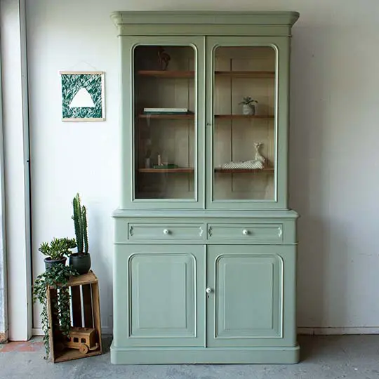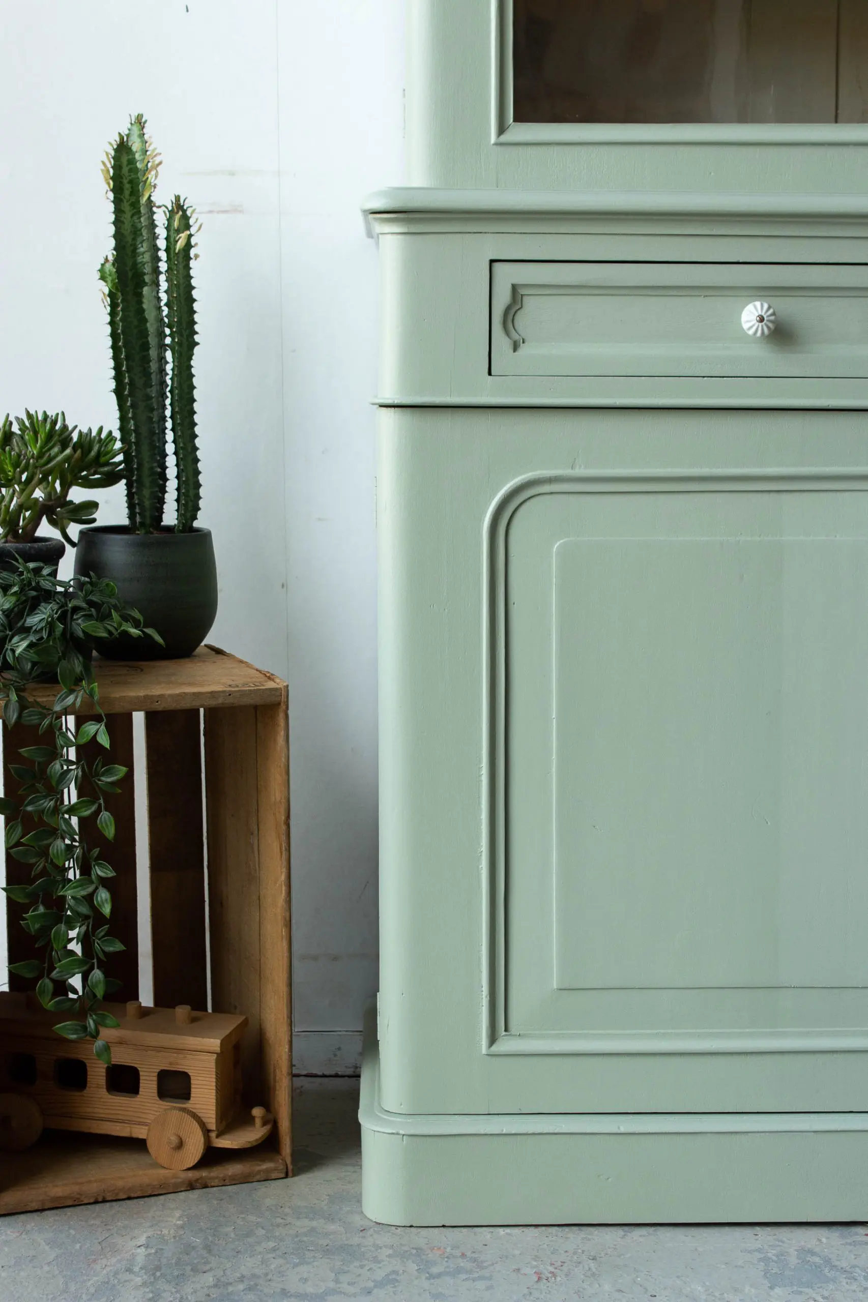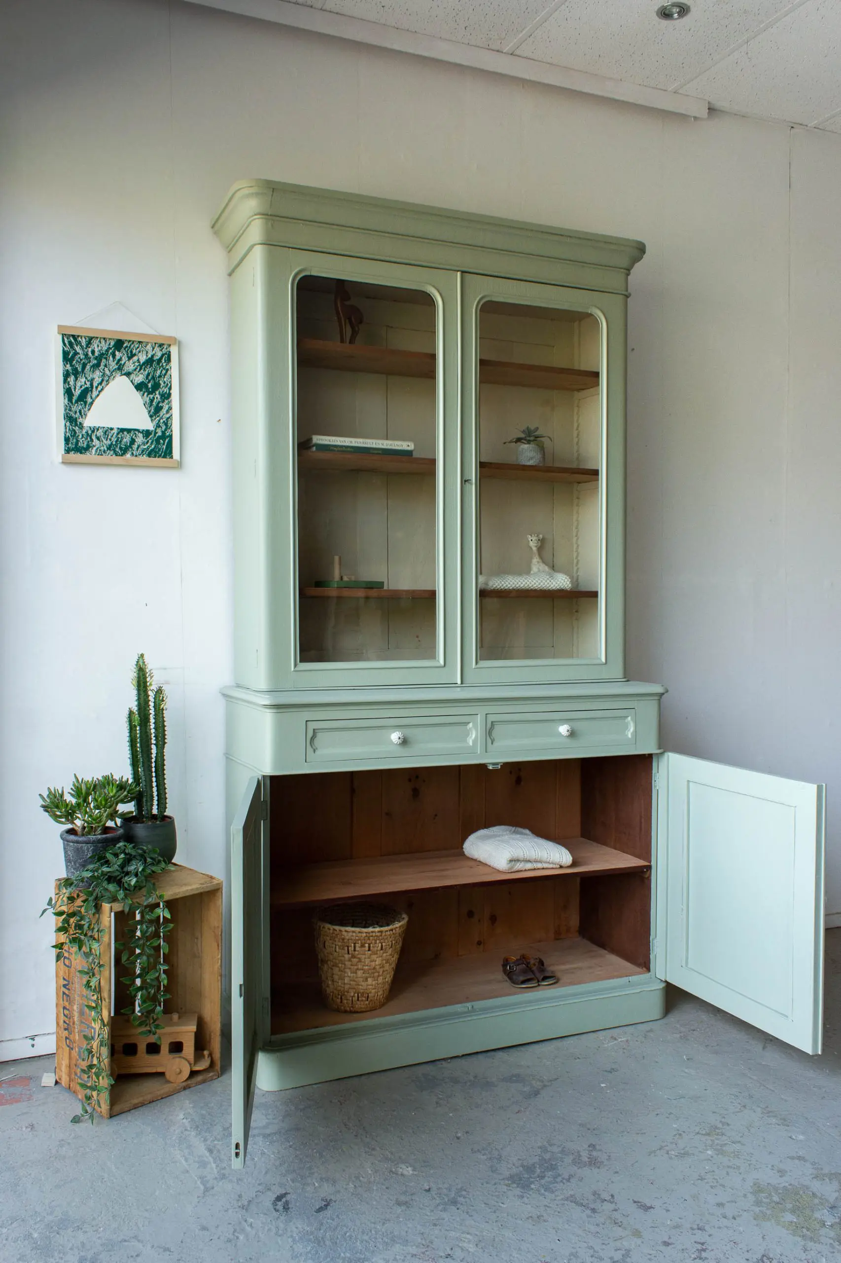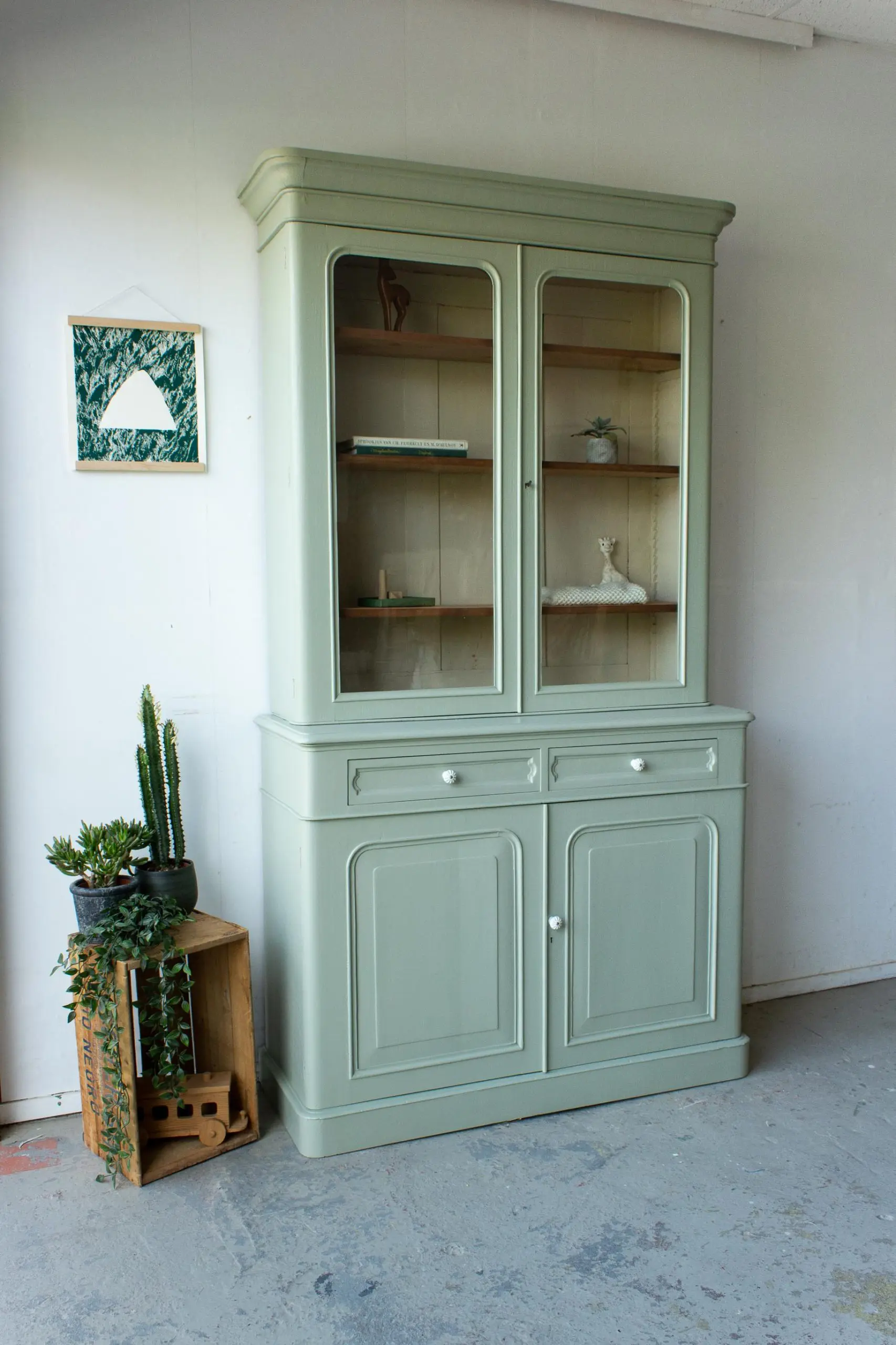Een prachtige tweedelige buffetkast uit Noord Frankrijk. Deze vintage kast zag er een beetje oubollig uit toen we hem binnen kregen. Maar aan de prachtige vormen en ronde hoeken, zagen we dat hij heel mooi kon worden. Na de grote schoonmaakbeurt, is de kast helemaal nagelopen en waar nodig gerepareerd. De originele planken waren nog erg mooi en stevig, dus die konden erin blijven liggen. Hierna is de kast in deze zachtgroene kleur geschilderd. Tot slot hebben we op de laatjes en de rechter deur sierlijke knopjes van porselein gezet. De deurtjes van de onderkast sluiten door middel van een schuifje en een magneetje. De deuren (met origineel oorlogsglas!) van de bovenkast sluiten door middel van een sleuteltje. En zo is deze prachtige, ruime buffetkast klaar voor een volgend leven!