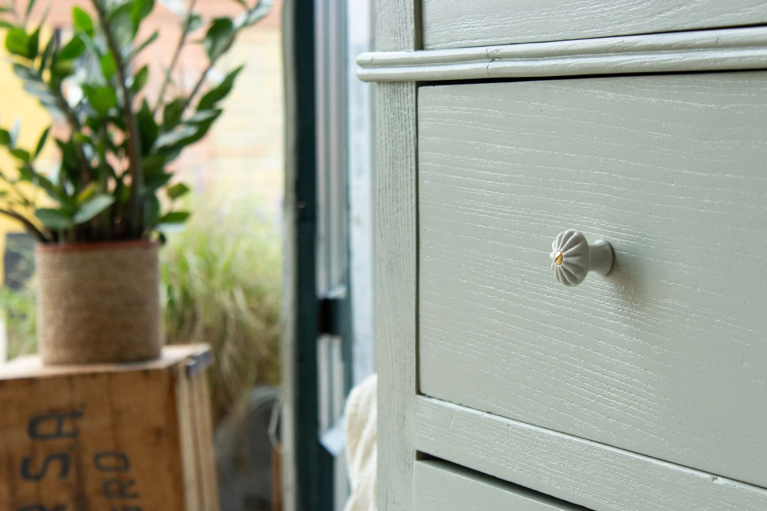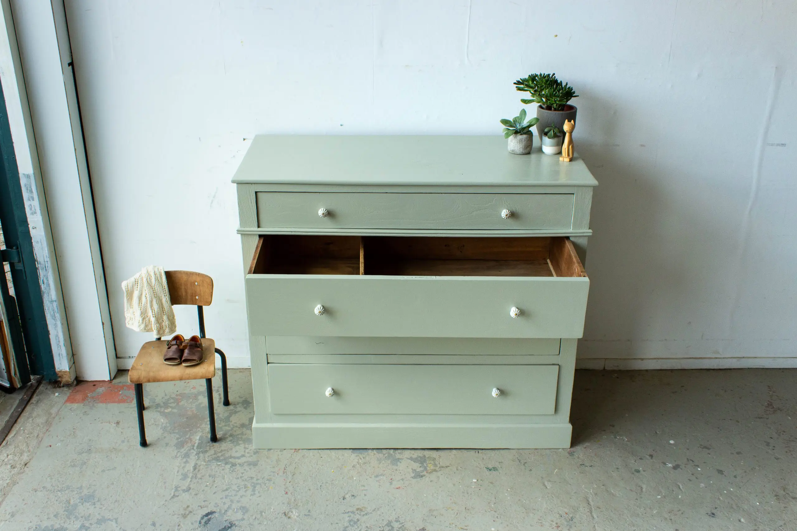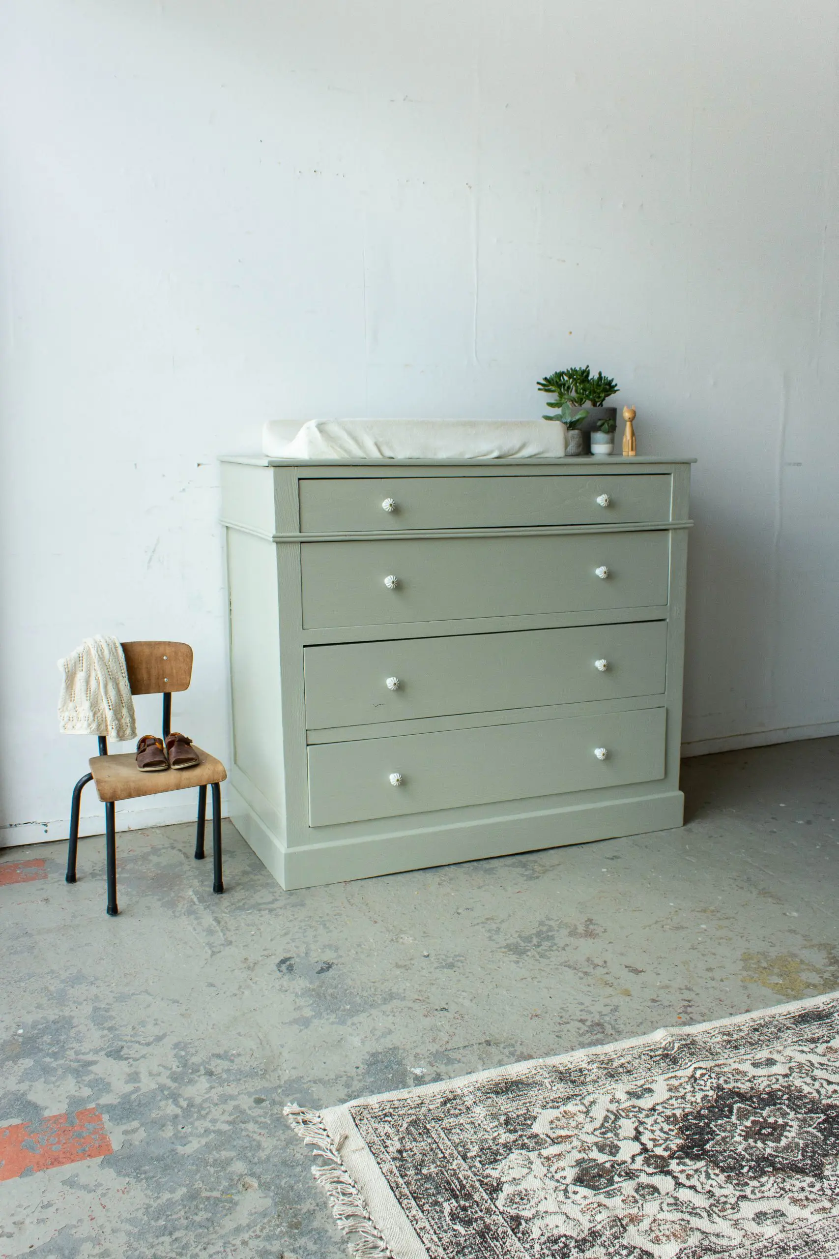 Deze mooie ladenkast komt uit Noord Frankrijk. Omdat hij erg hoog was toen we hem binnen kregen, hebben we de poten eraf gehaald, en staat hij nu op de plint. We hebben de commode verder helemaal nagelopen en hier en daar verstevigd. Een rustig kleurtje leek ons mooi voor deze ladencommode en hebben hem daarom in deze zachtgroene kleur geschilderd. Op de laden zijn tot slot sierlijke knopjes van porselein gezet. Twee van de vier laden hebben een tussenschot. Heel handig om de kleertjes en babyspulletjes te ordenen. Wat ons betreft een prachtige, ruime commode voor op de babykamer!