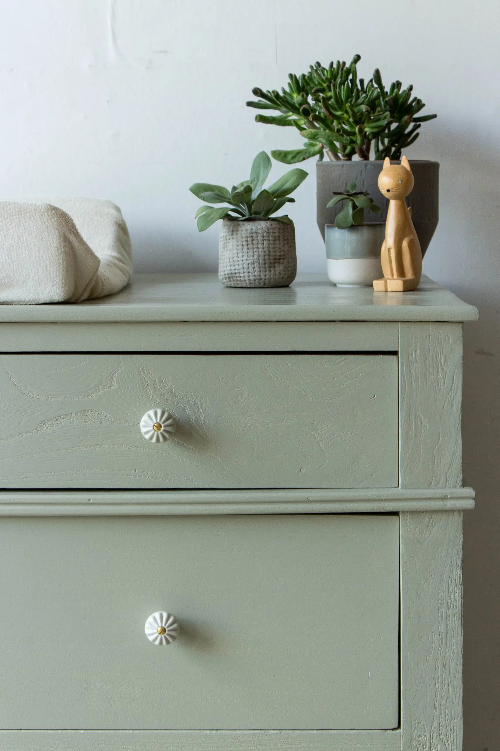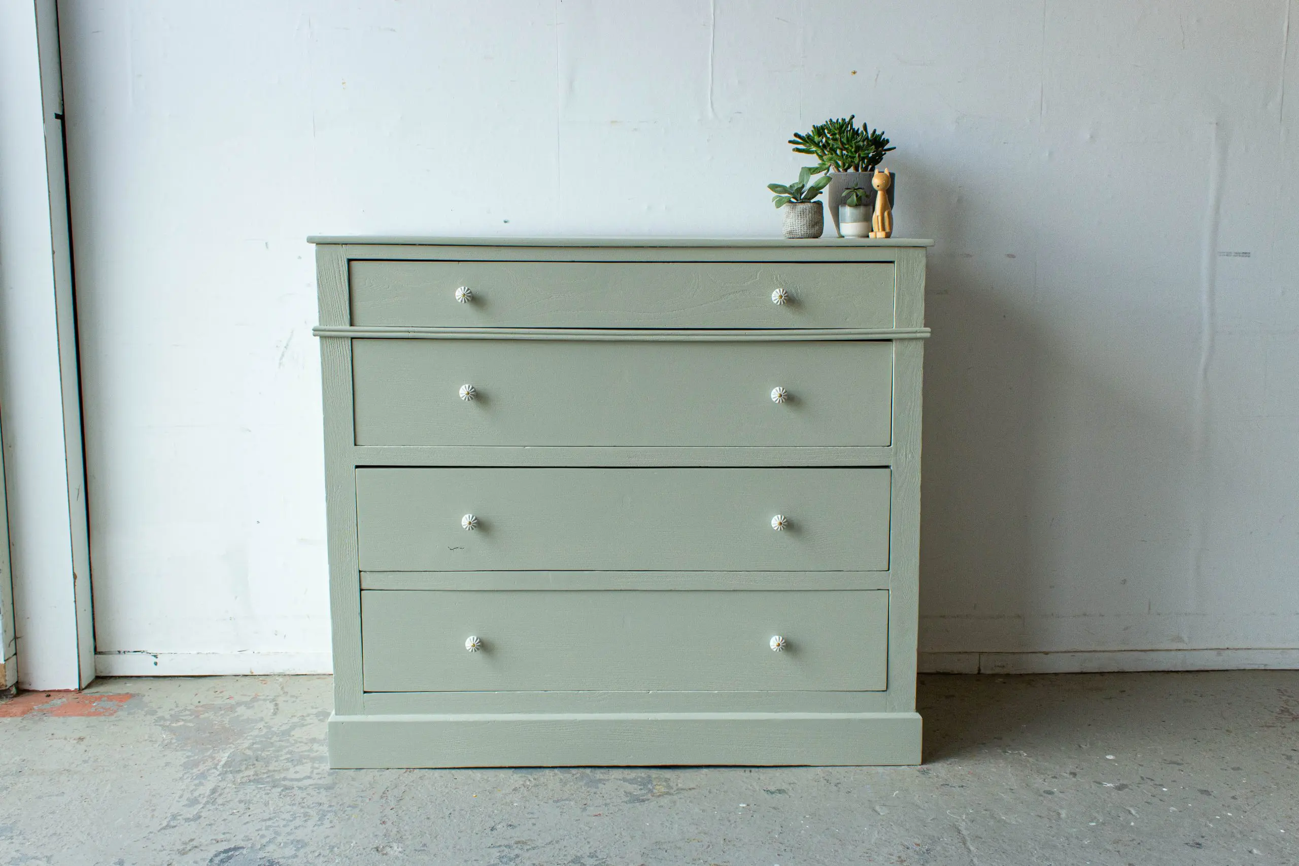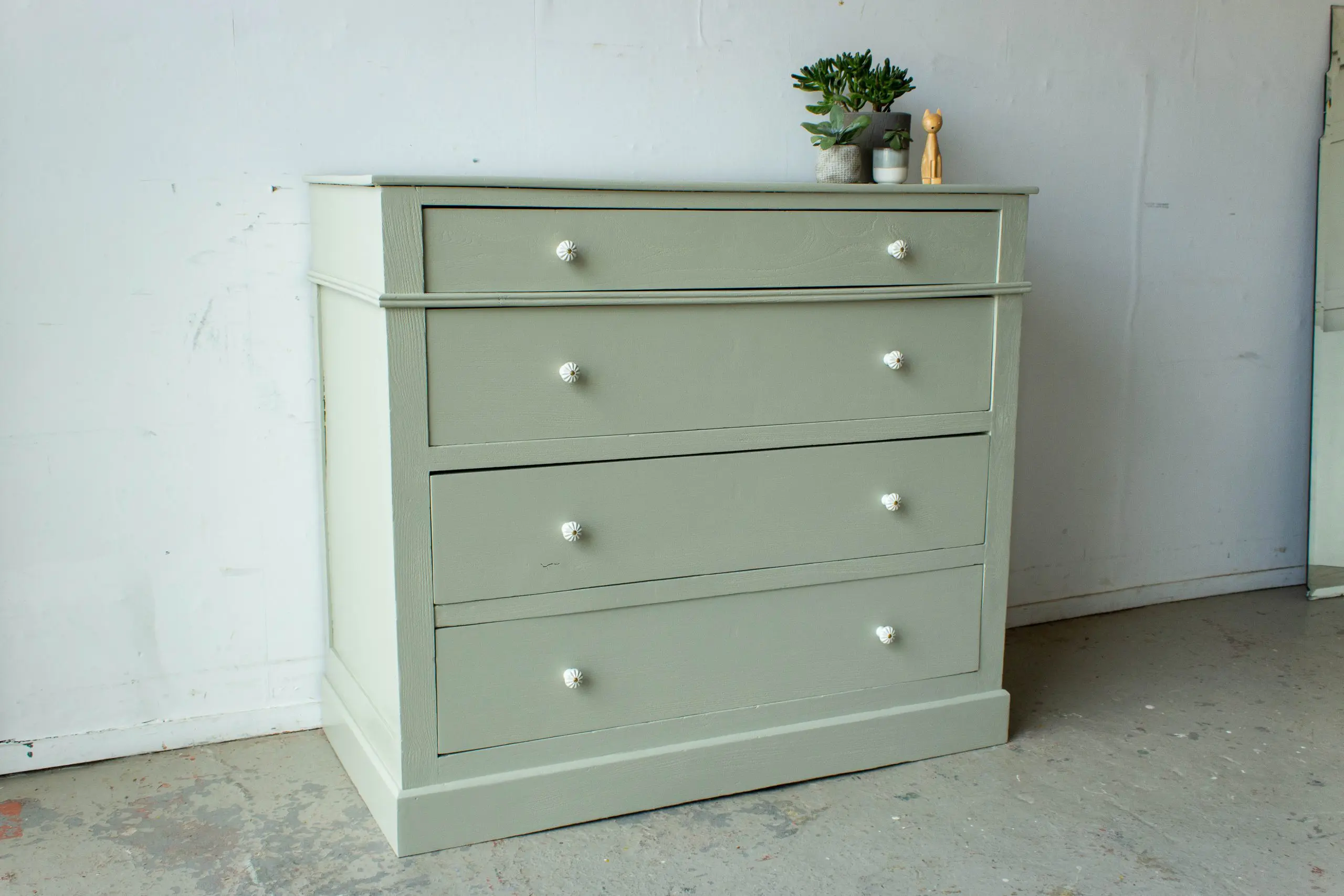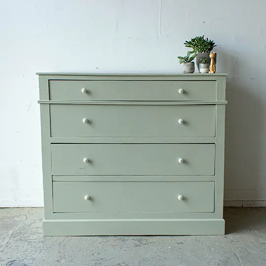 Deze mooie ladenkast komt uit Noord Frankrijk. Omdat hij erg hoog was toen we hem binnen kregen, hebben we de poten eraf gehaald, en staat hij nu op de plint. We hebben de commode verder helemaal nagelopen en hier en daar verstevigd. Een rustig kleurtje leek ons mooi voor deze ladencommode en hebben hem daarom in deze zachtgroene kleur geschilderd. Op de laden zijn tot slot sierlijke knopjes van porselein gezet. Twee van de vier laden hebben een tussenschot. Heel handig om de kleertjes en babyspulletjes te ordenen. Wat ons betreft een prachtige, ruime commode voor op de babykamer!