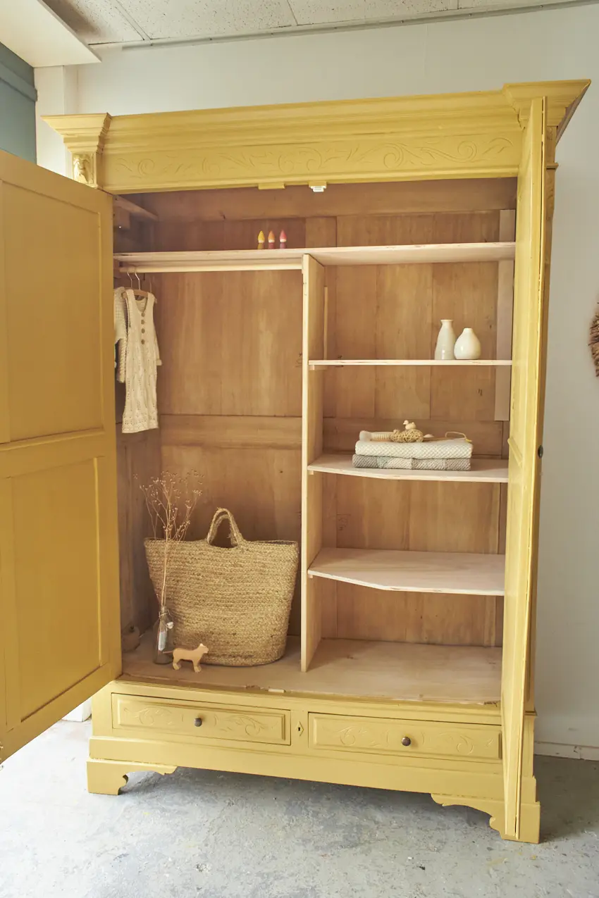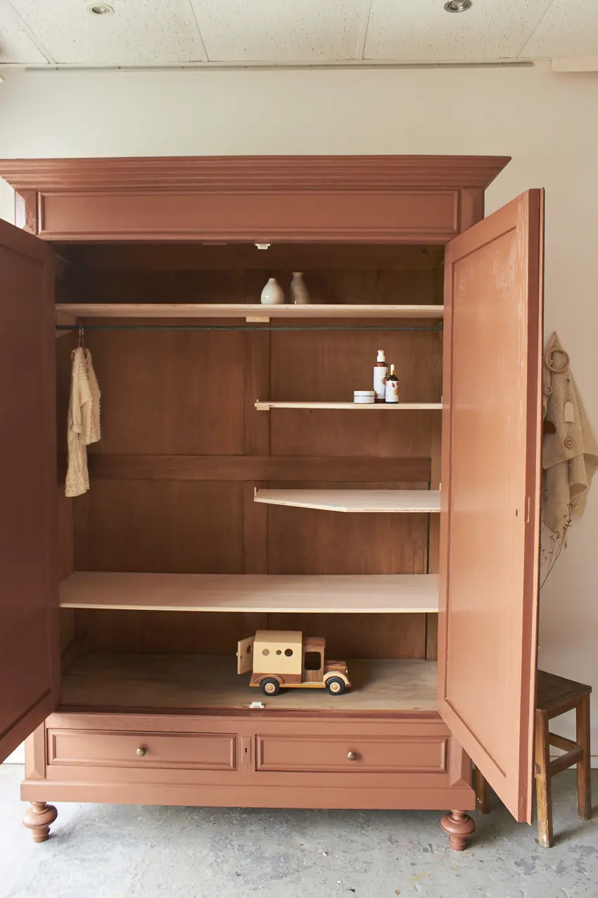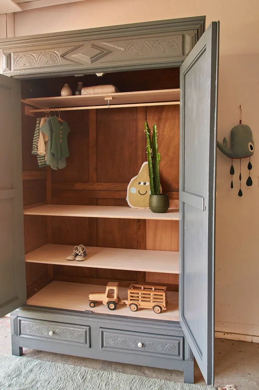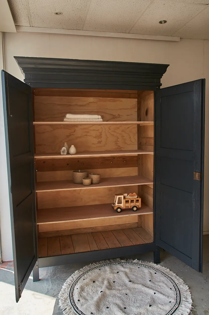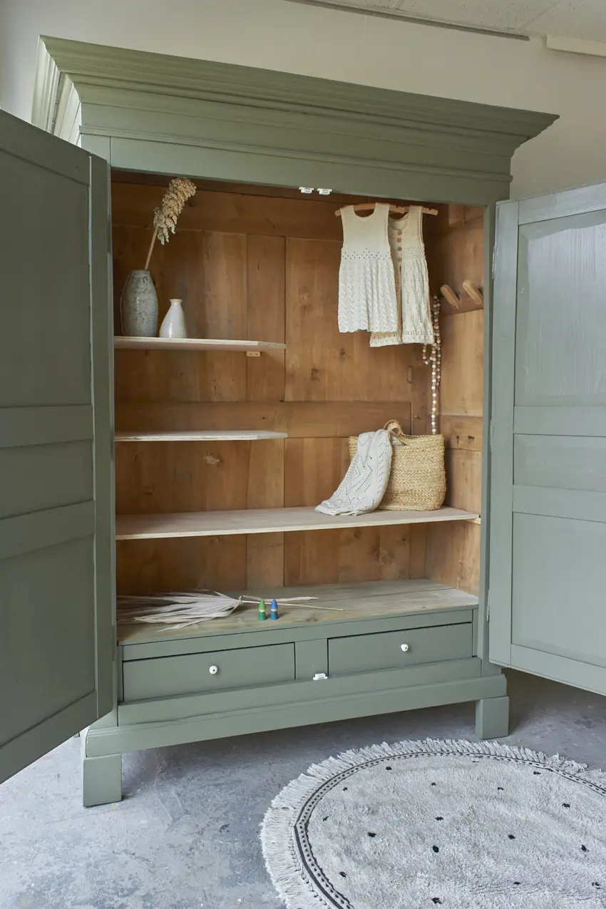 De indeling voor deze kast kunnen we naar wens voor je maken. Wil je alleen planken, of een combinatie van een roede met planken?